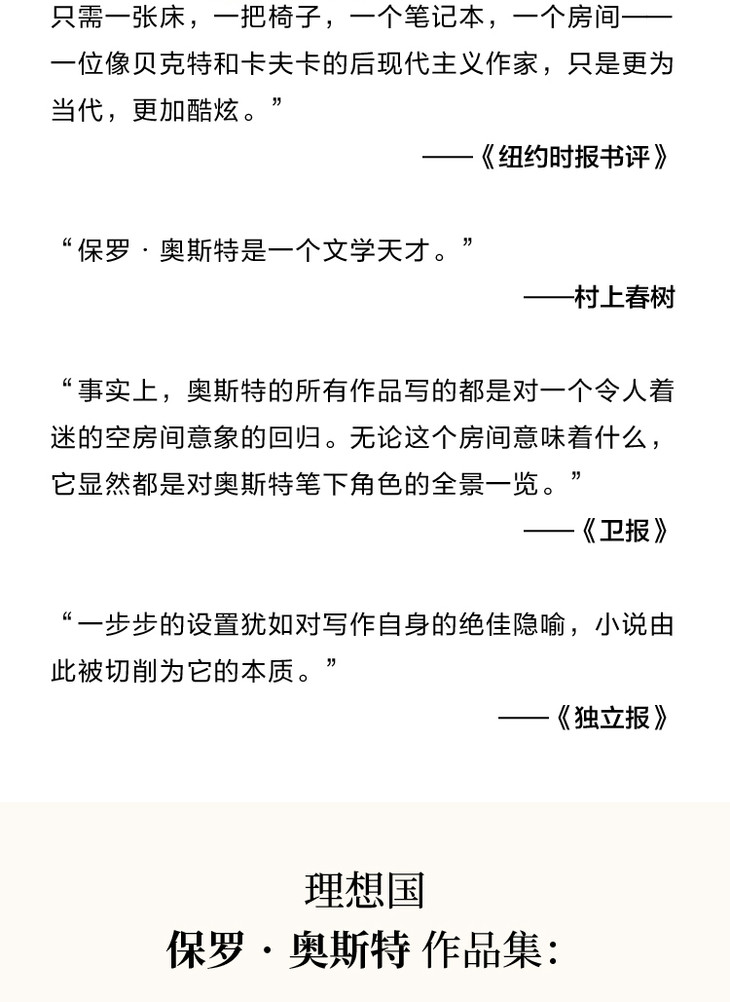 ★ “事实上,奥斯特的所有作品写的都是对一个令人着迷的空房间意象的回归。无论这个房间意味着什么,它显然都是对奥斯特笔下角色的全景一览。”
