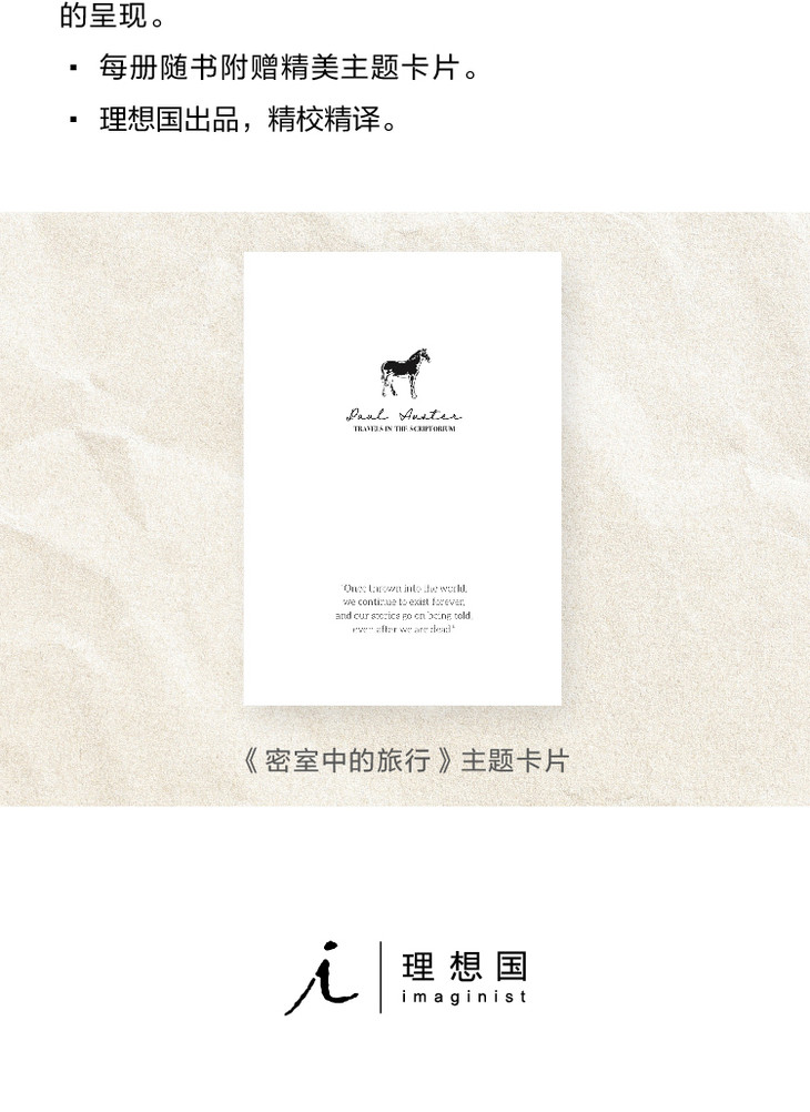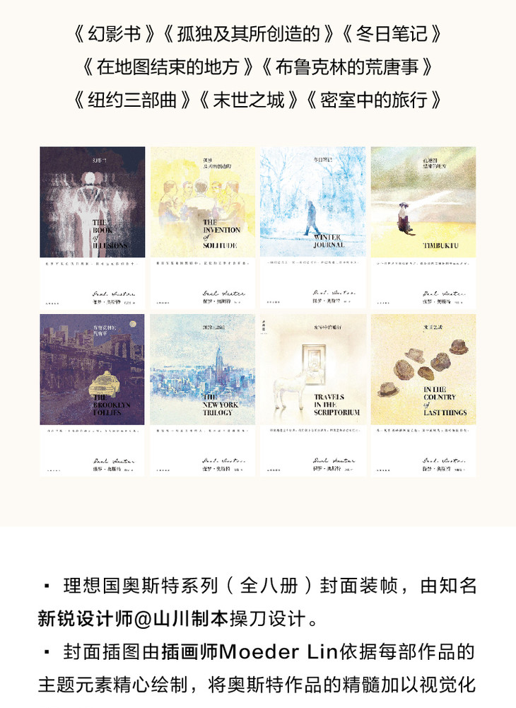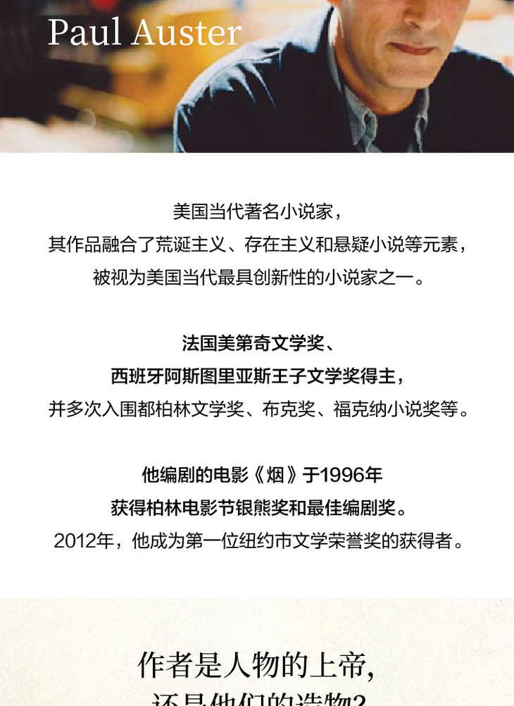 ★美国当代蕞具创新性的小说家之一,美第奇文学奖、阿斯图里亚斯王子奖得主,村上春树、迈克尔·翁达杰、J.M.库切赞誉的作家——融合了荒诞主义、存在主义和悬疑小说等元素,“保罗·奥斯特是当代文学一个蕞为独特的声音”。(《纽约书评》)