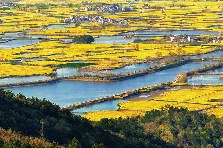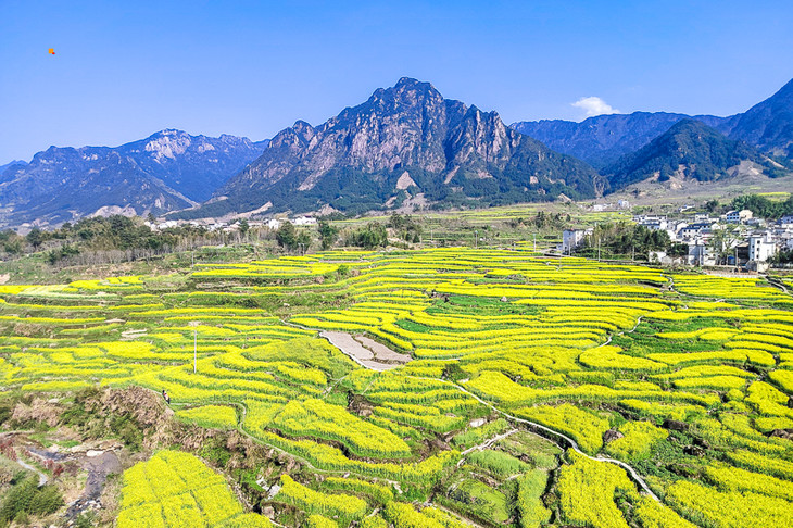 随意找条田埂小道,穿过梯田往山上去。踏上松软又结实的土壤,整个人瞬间放松下来,这是大自然特有的亲切。一层层的梯田从山脚盘绕至山顶,错落有致,蔚为壮观。金灿灿的油菜花绵延几十里,只要风起,油菜花田就化身成蜜的海洋,一道道金色的“闪电”在花海中炸开,深深吸一口花香,好像快醉倒在春风里。