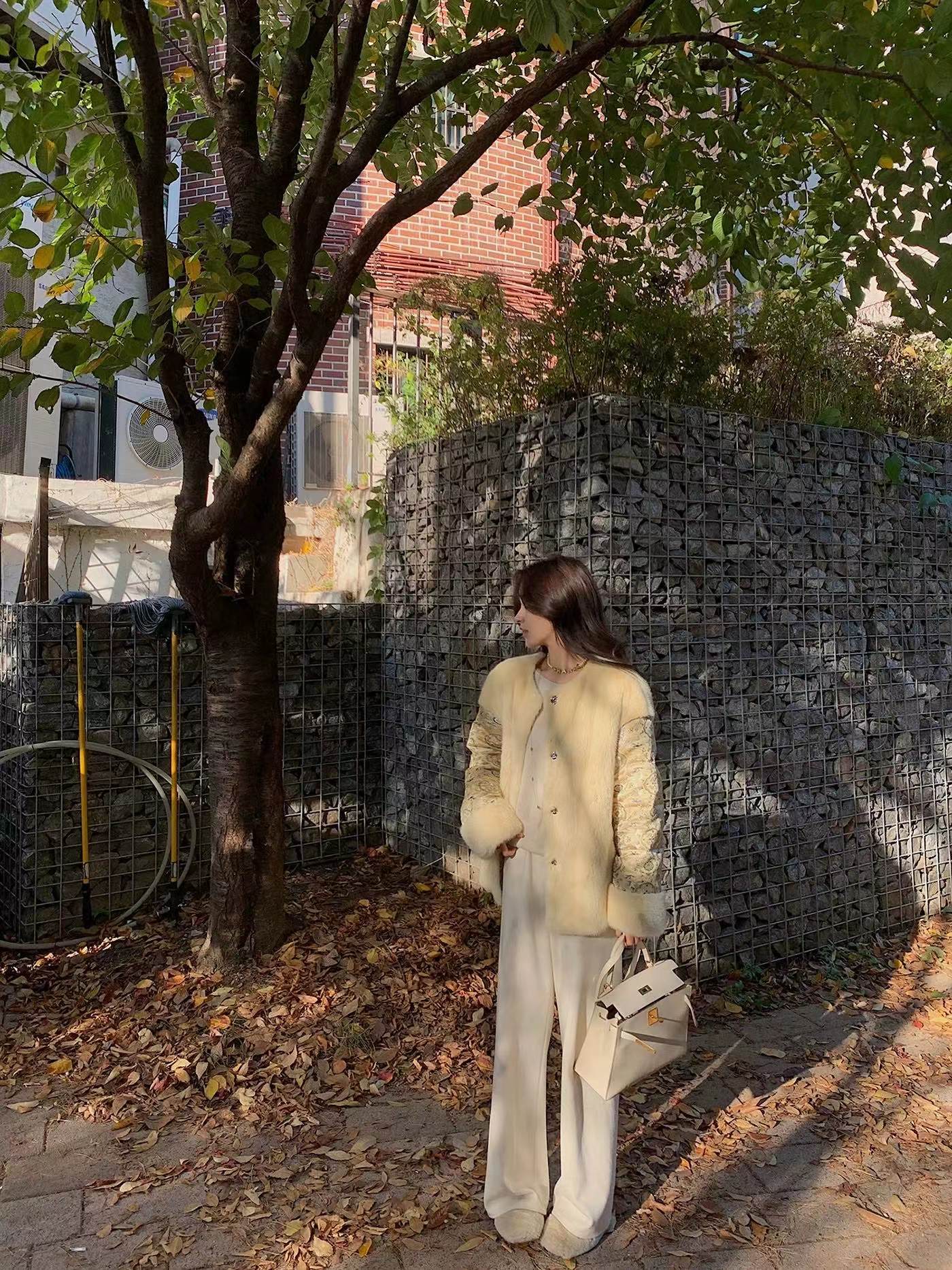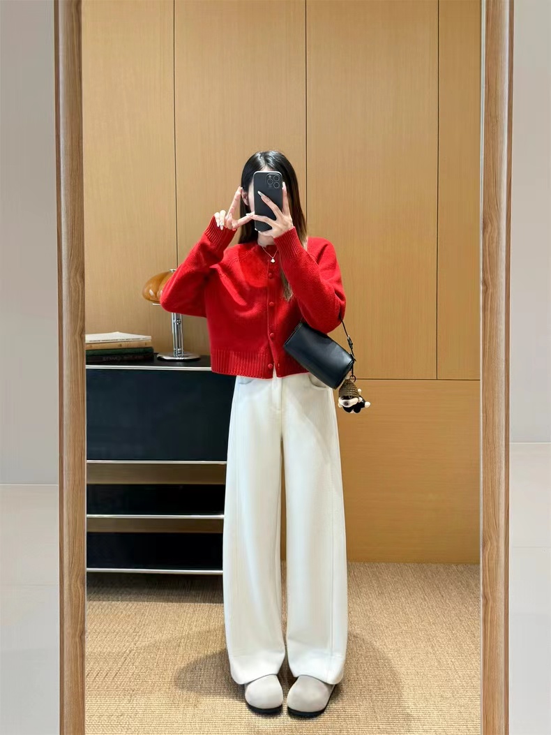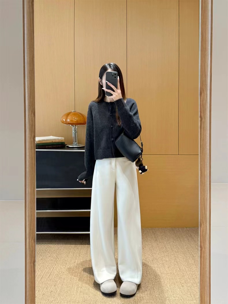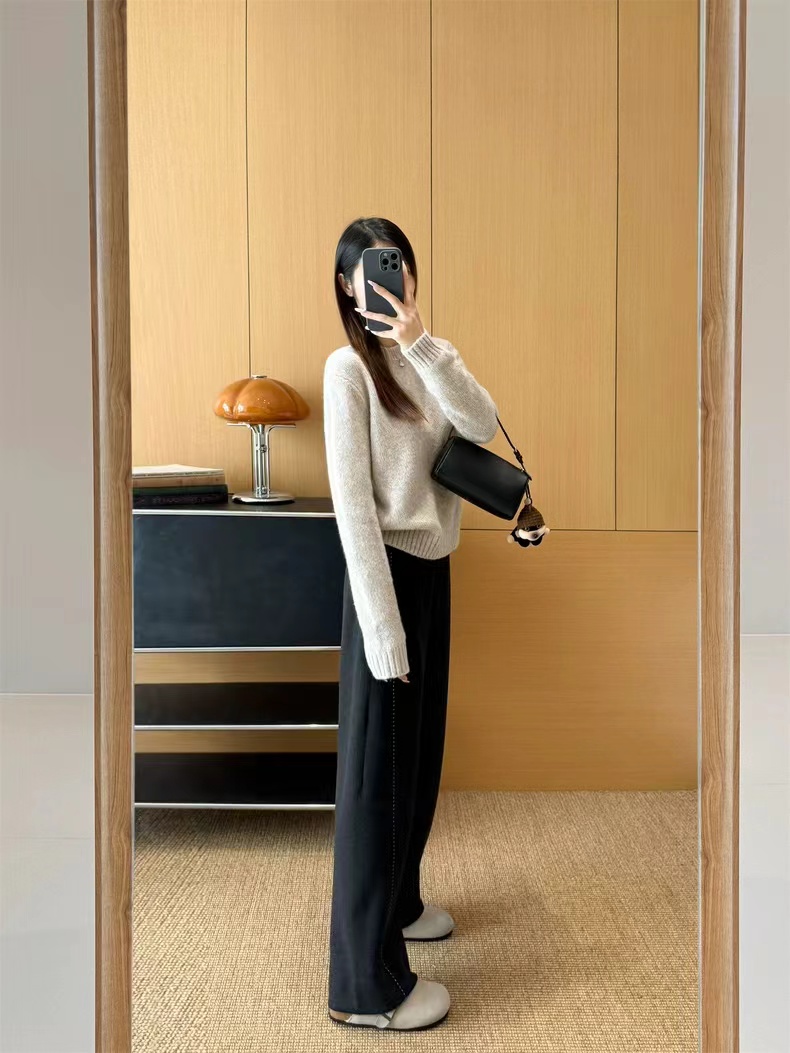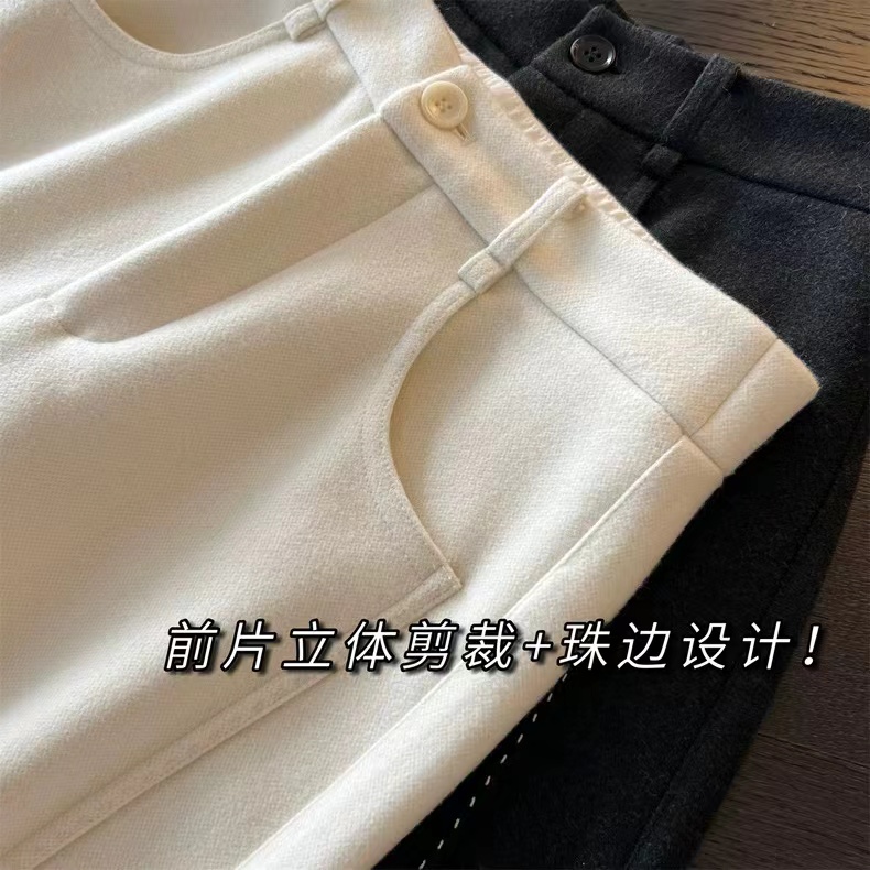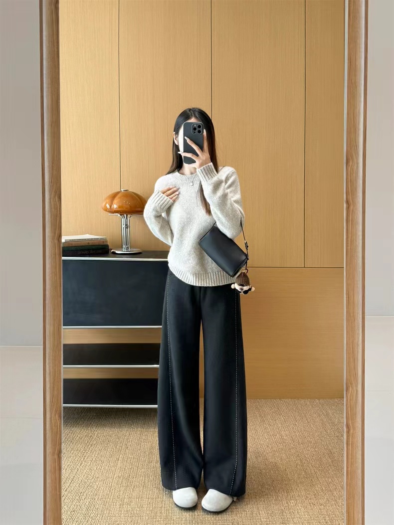 神级修腿!手工明线工艺 ~冬季羊毛醋酸明线休闲通勤毛呢直筒镰刀阔腿裤 神级修腿毛呢镰刀阔腿裤!!版型没话说!要的就是你轻松瘦,不费力得收获大长直腿~见到实物后你就知道这条裤子有多神了!定制醋酸+绵羊毛毛呢面料,经过特殊工艺处理,扎实有分量,手感相当细腻,胜似羊绒!!!温暖的犹如裹在毛毯里一样~上身没有任何束缚。不沾身、有筋骨,轻松慵懒的获得这一份优雅松弛感~简约即能塑型,步履间篙级随性,帅气时髦,无论与西装还是宽松休闲的单品搭配都OK~剪裁匠心独运~篙级版师多次调整改版打造!上身有种定制般的修饰腿型窄版的垂感直筒版型,不挑腿型,好穿!!不管站立还是走动,垂落的裤腿,松弛腔调拉满~前片立体剪裁+珠边设计,把腿型修饰得如此有力且毫不费力;腰头对身材的包容度很篙,后腰松紧腰穿着舒适感好,增加休闲感,打造舒适穿搭~对梨形MM非常的友好!特别藏肉,但线条不刻板,穿上它,都能醉大程度打造丸美比例!