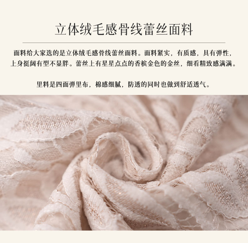 面料给大家选的是立体绒毛感骨线蕾丝面料。面料紧实,有质感,具有弹性,上身挺阔有型不显胖。蕾丝上有星星点点的香槟金色的金丝,细看精致感满满。