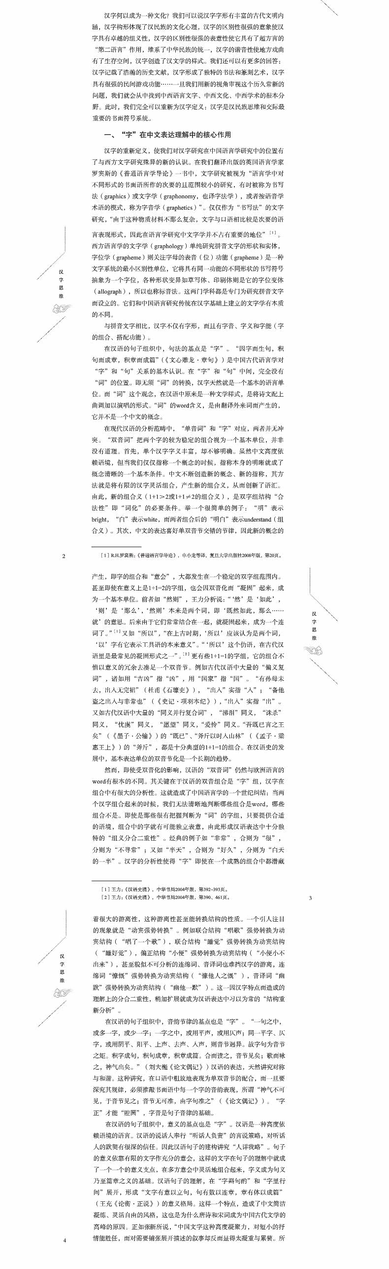 语言(言)、文字(文)和视象符号(象)三者构成了文化的核心要素和条件。中国语言、学术、文化的基本问题是一个汉字问题,即以汉字为枢纽,在言、文、象三者的对立统一关系格局中研究其中的每一个要素,并将这种以汉字为本的言、文、象三者既分离又统一看作是中国学术、中国文化存在的最基本条件。它要求我们冲破传统学科分治的壁垒,在一个大汉字文化观的格局下进行学术研究。文化语言学的“再汉字化”研究是中国文化转型期的中心问题。文化语言学引领中国学术和文化的“再汉字化”转向,顺应了世界学术的大趋势。