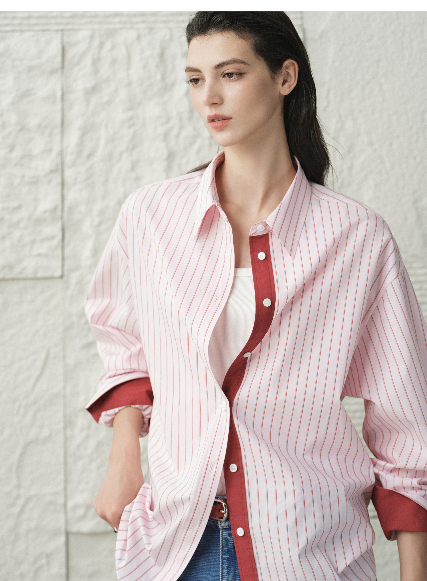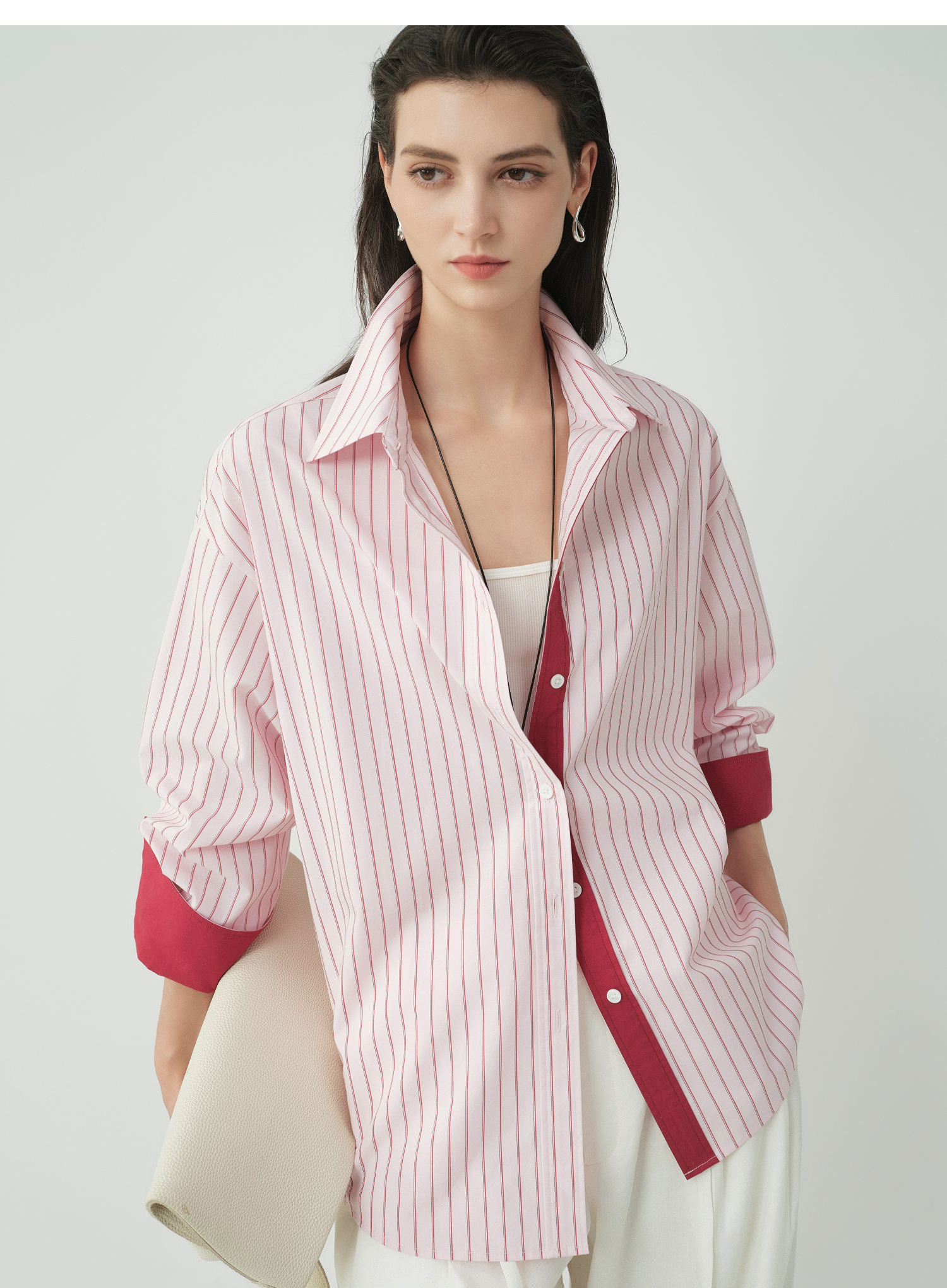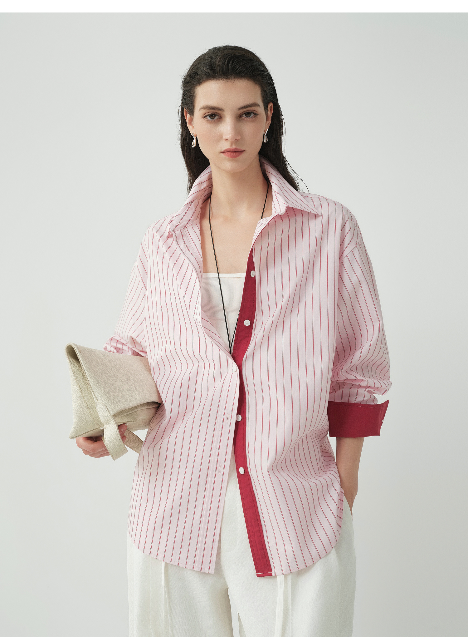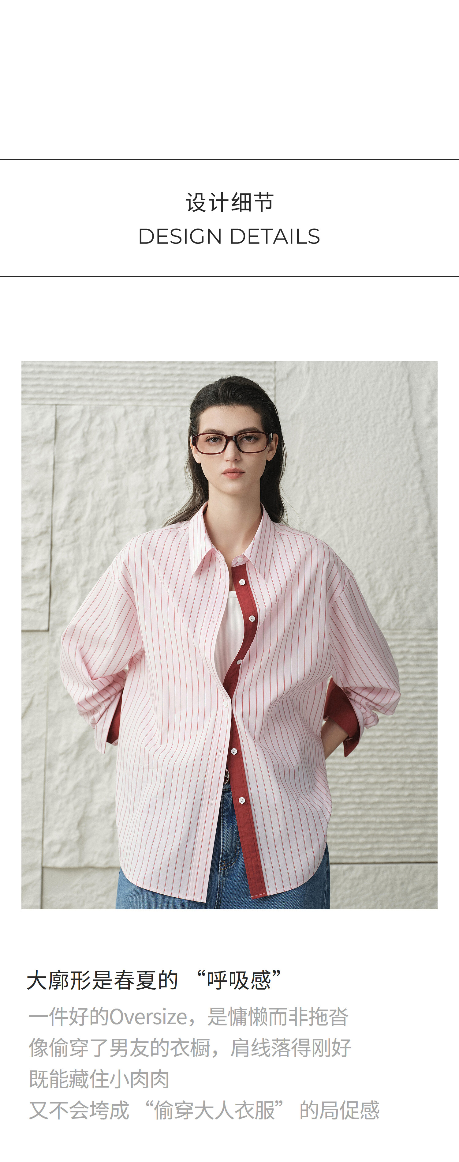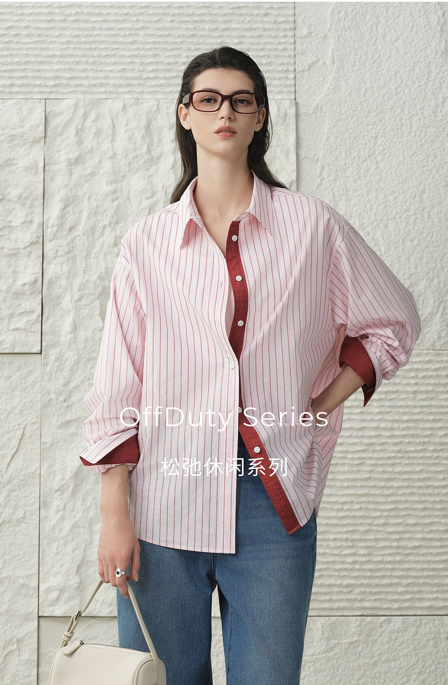 [春日甜茶]26春新款设计感 条纹撞色长袖粉色衬衫 松弛衬衣372604038