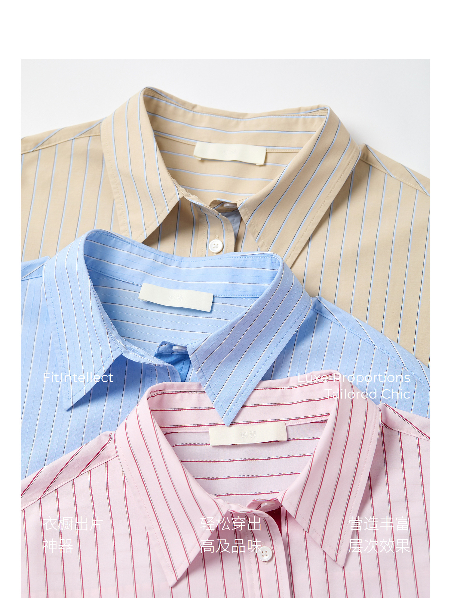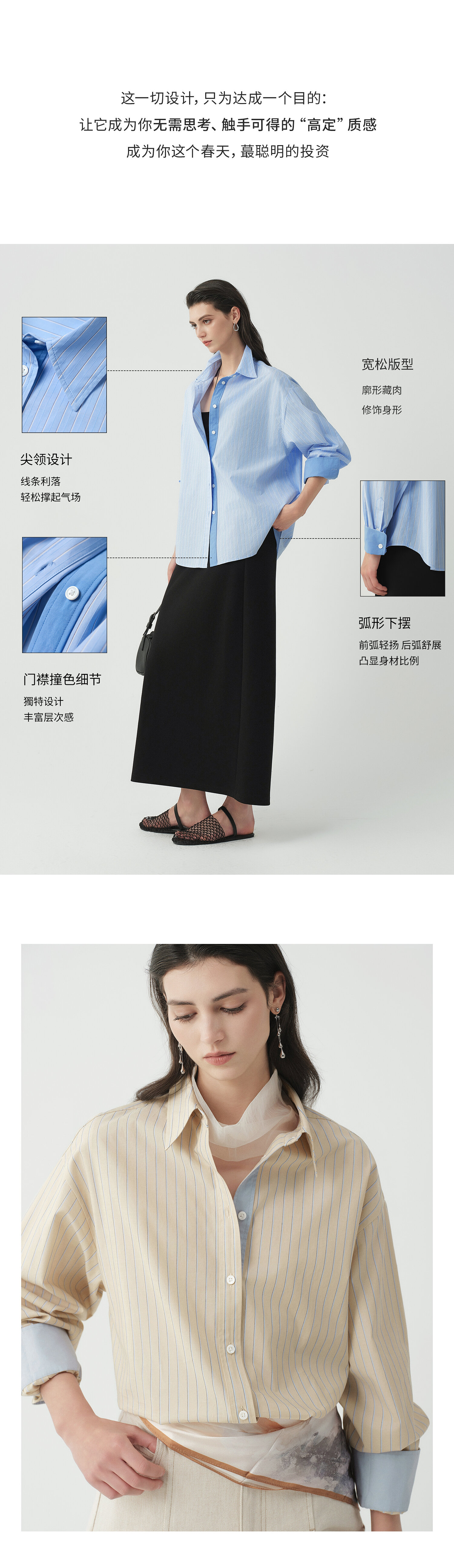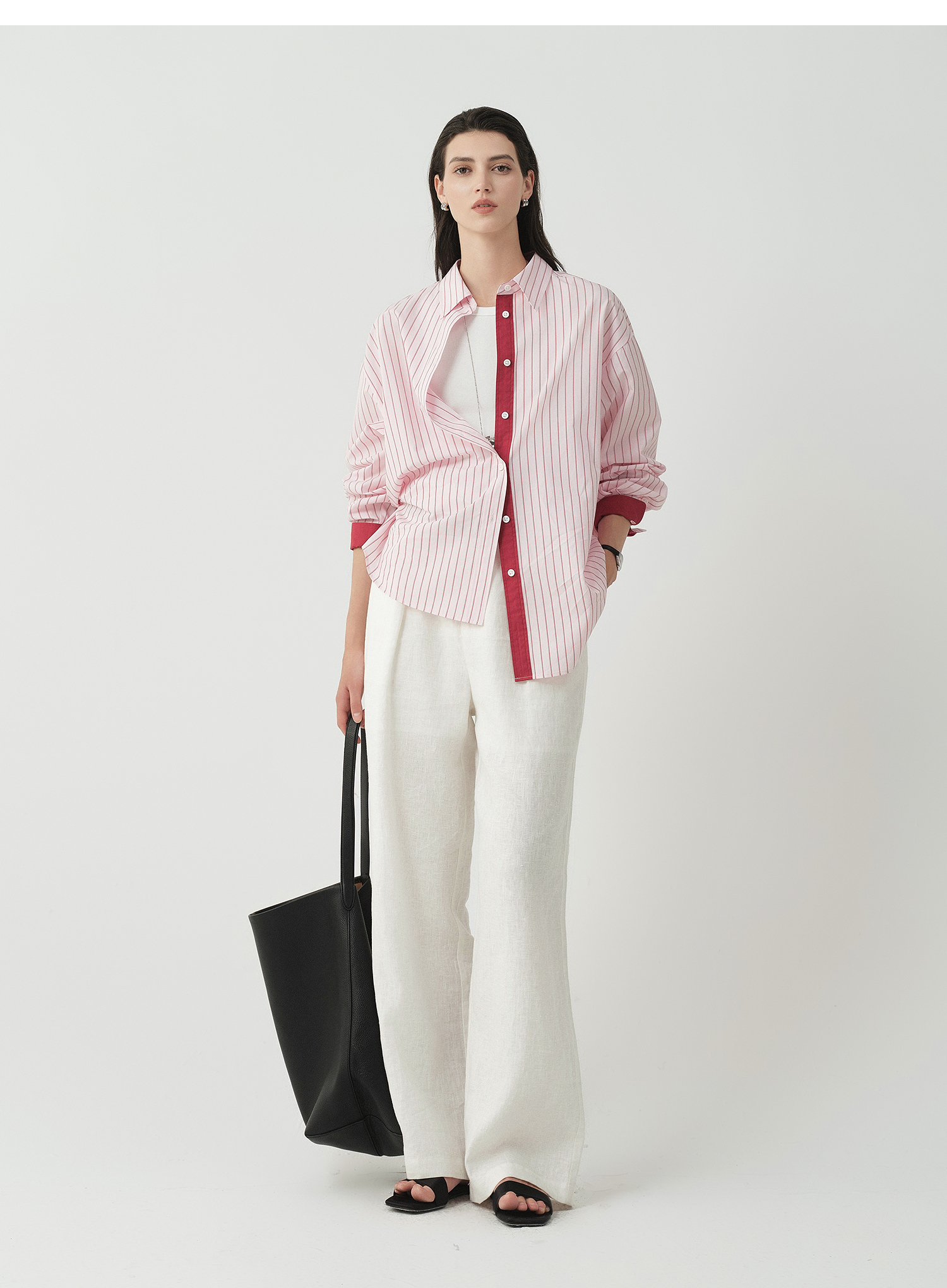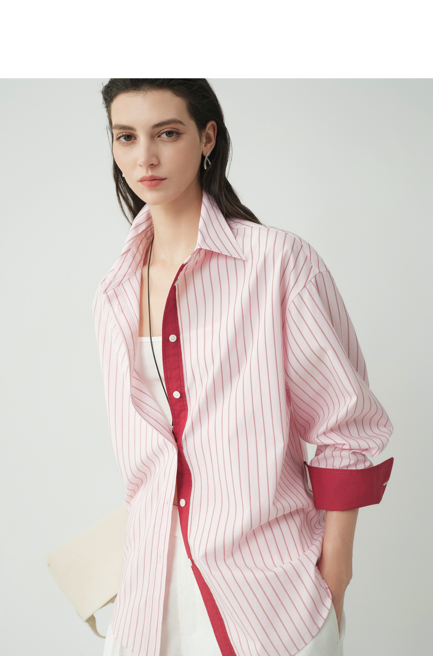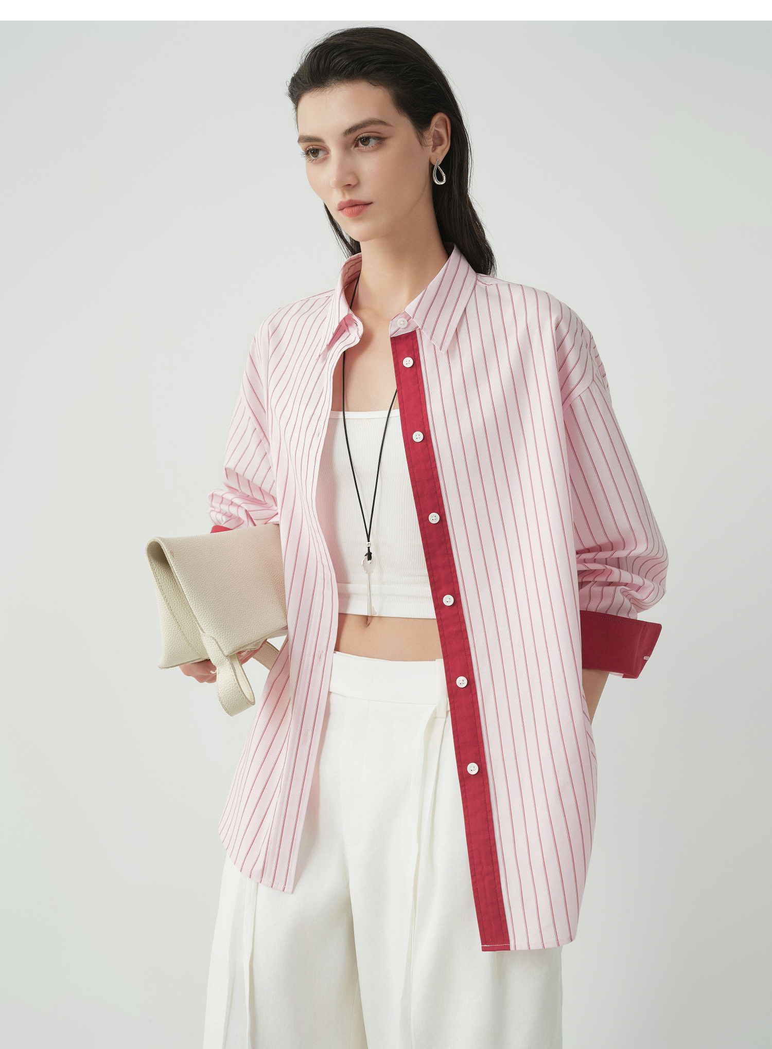 [春日甜茶]26春新款设计感 条纹撞色长袖粉色衬衫 松弛衬衣372604038