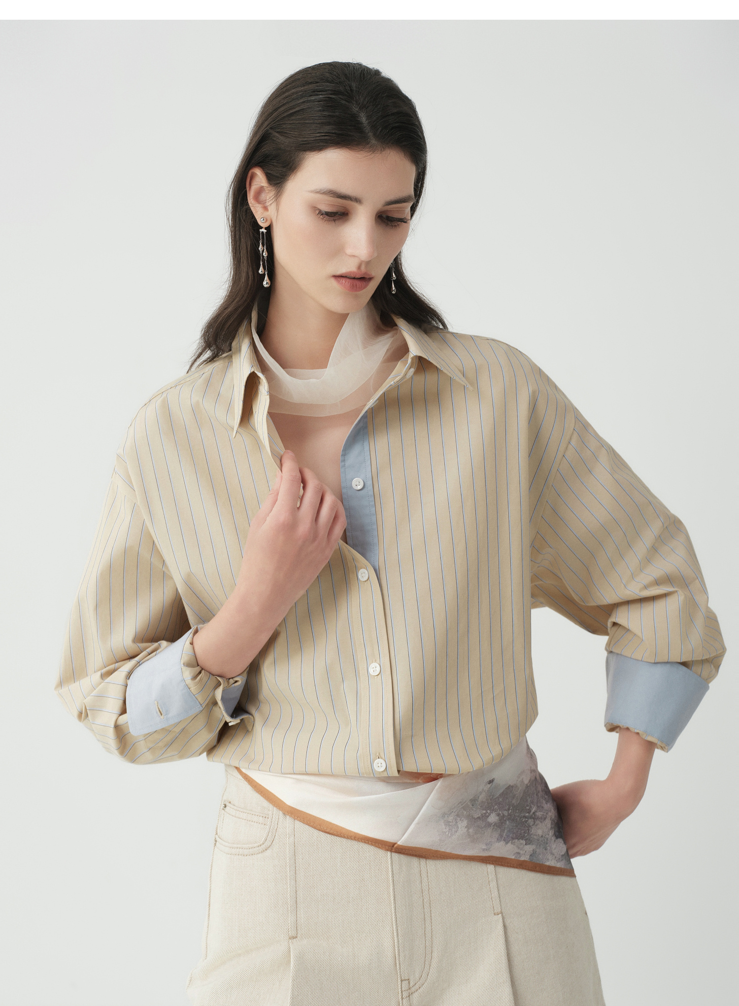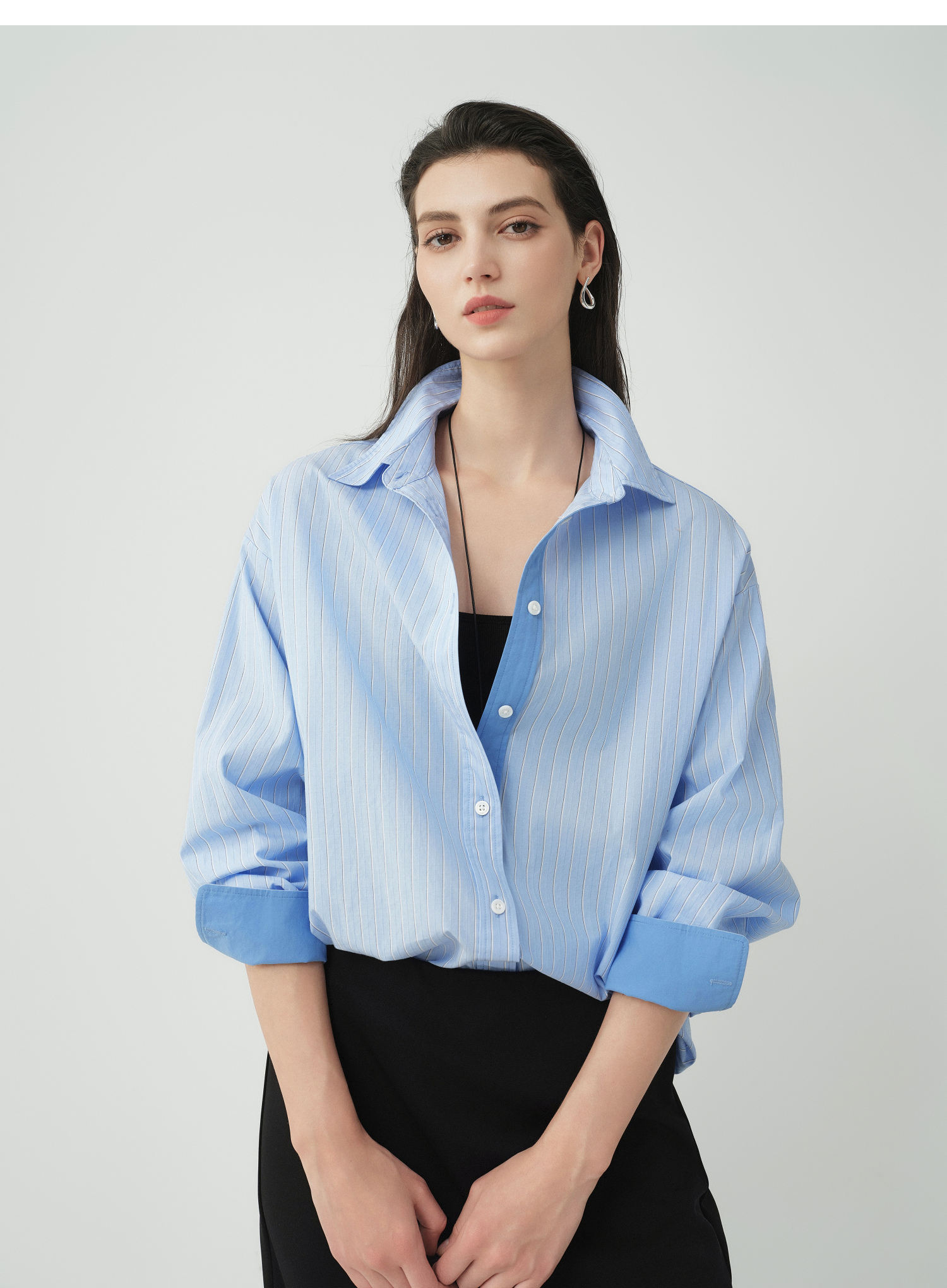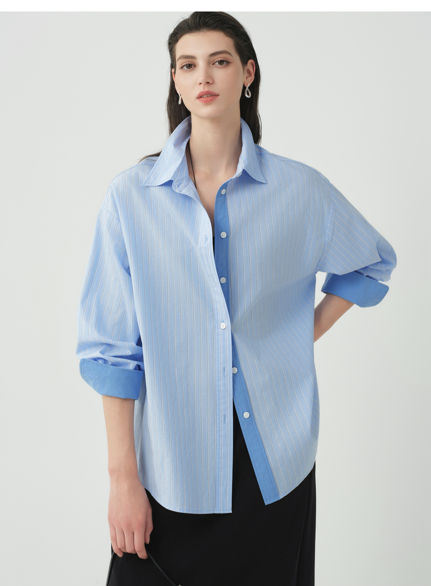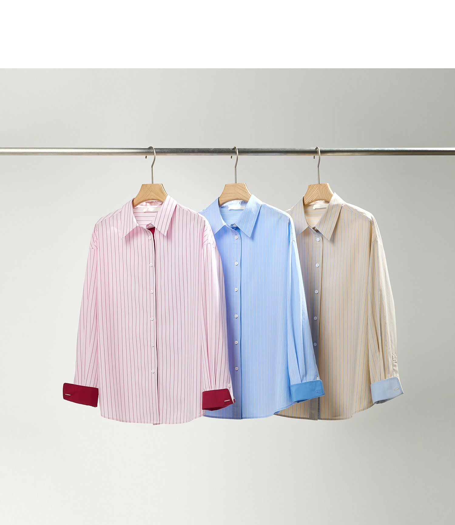 [春日甜茶]26春新款设计感 条纹撞色长袖粉色衬衫 松弛衬衣372604038