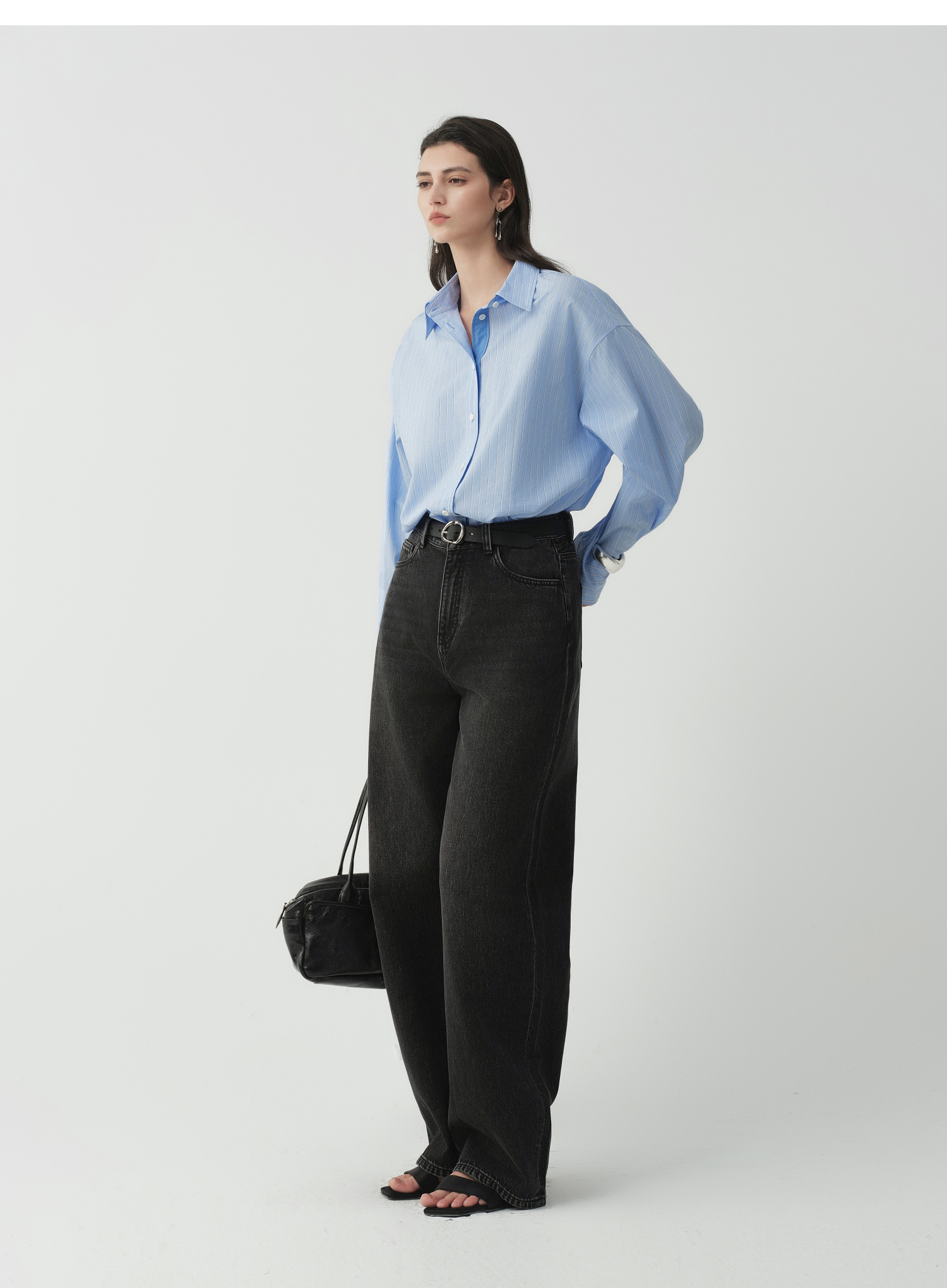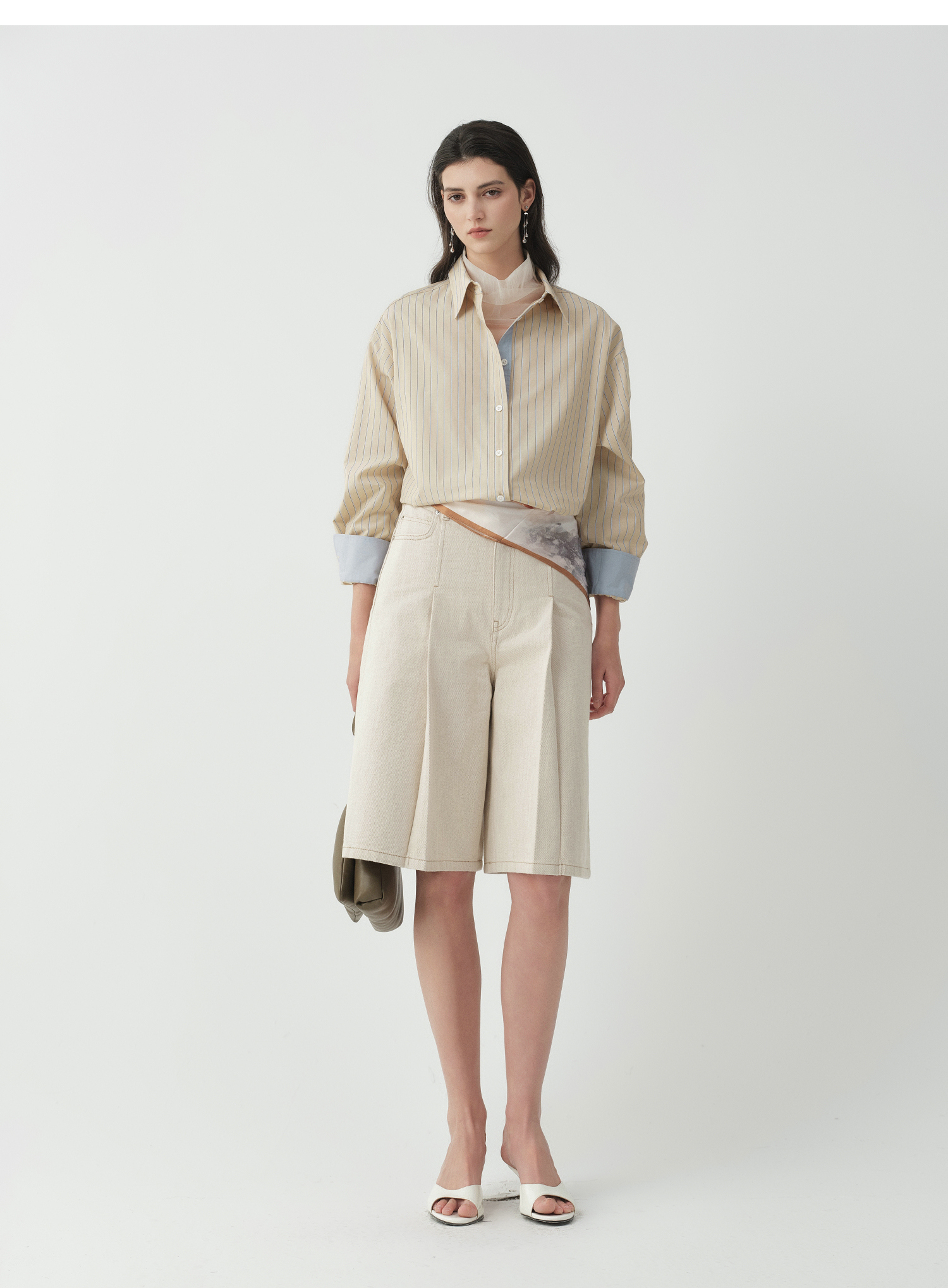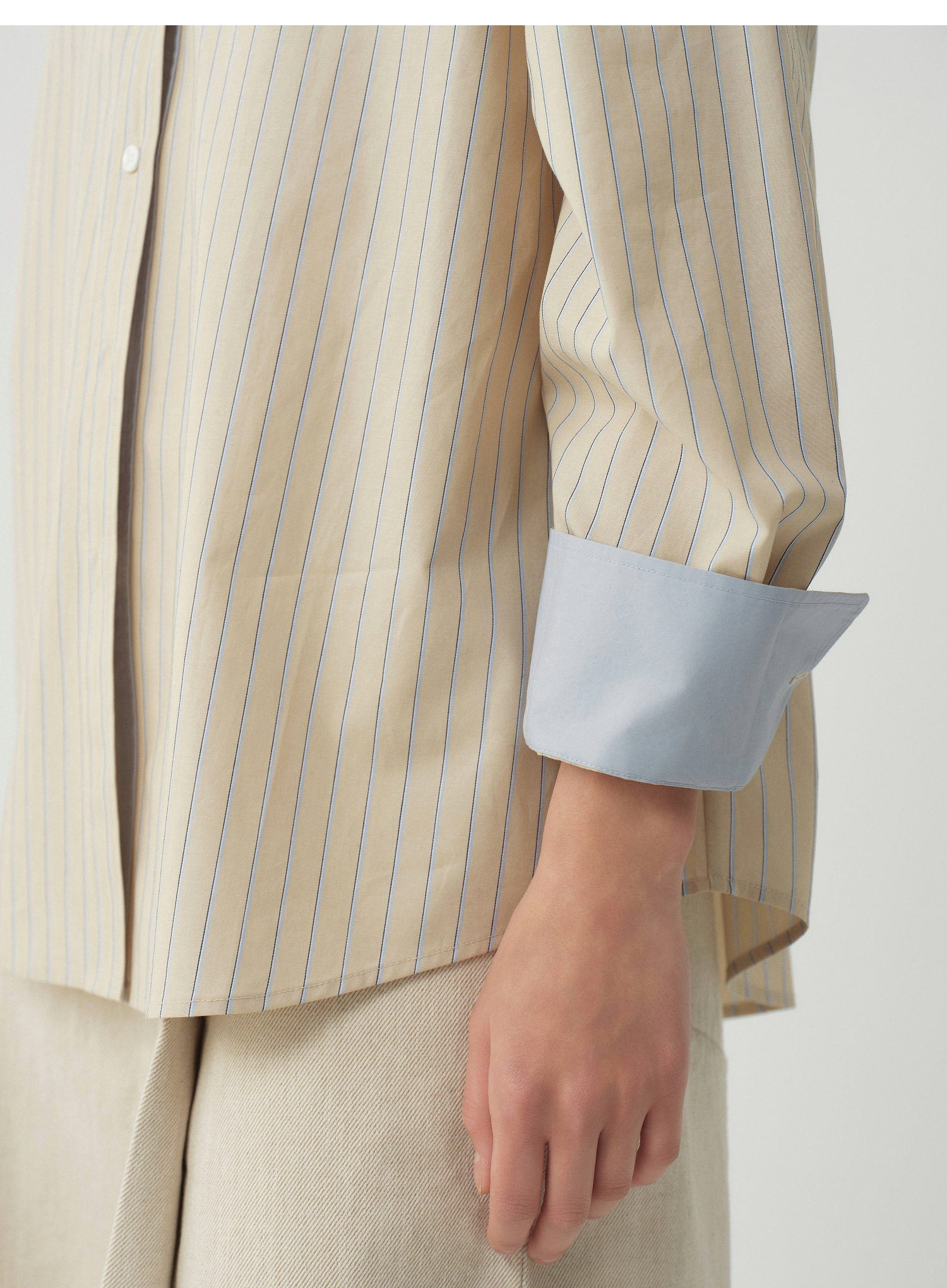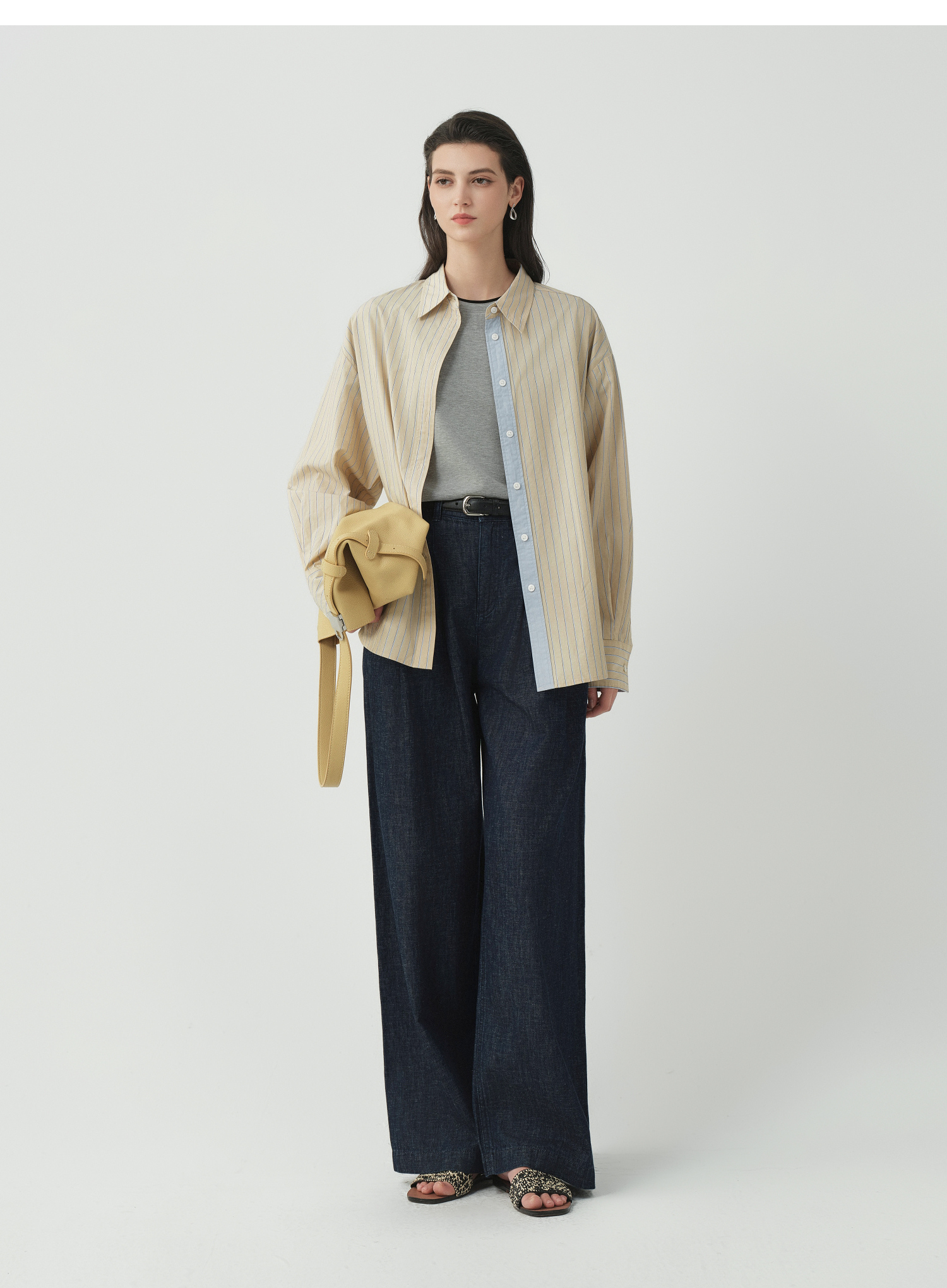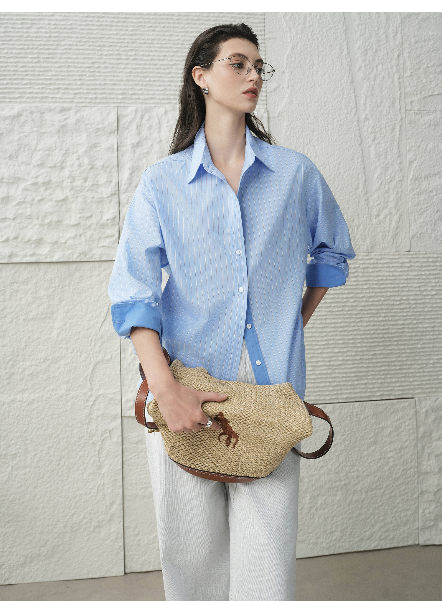 [春日甜茶]26春新款设计感 条纹撞色长袖粉色衬衫 松弛衬衣372604038