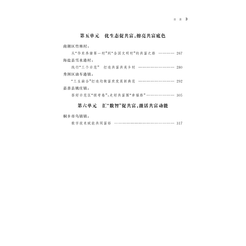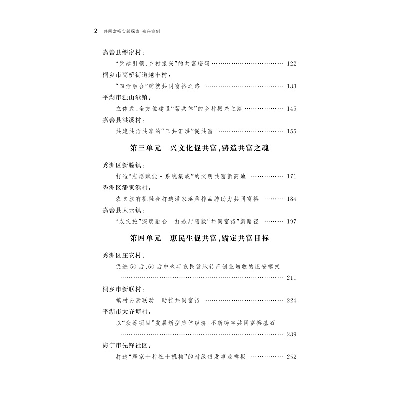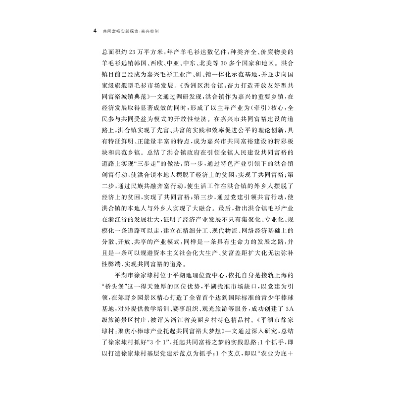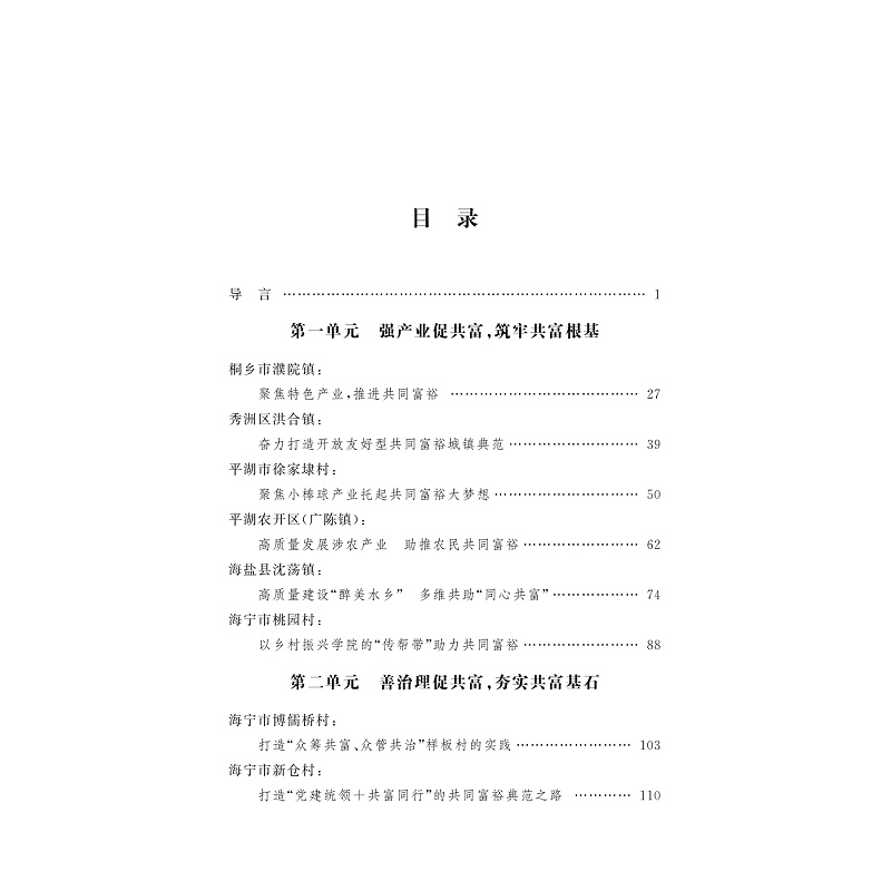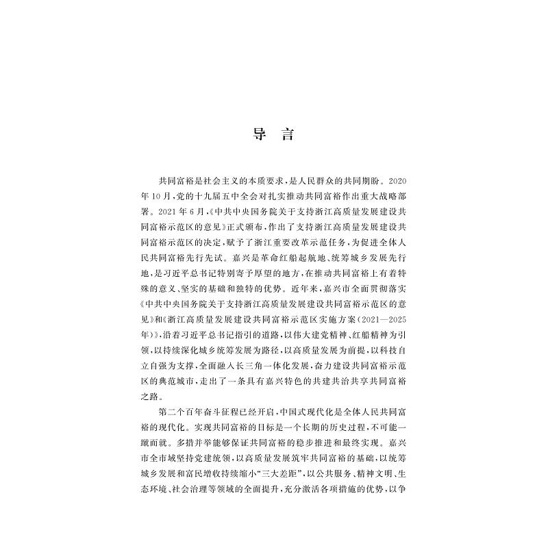 中国共同富裕研究文库之一。嘉兴是革命红船起航地、统筹城乡发展先行地,在推动共同富裕上有特殊的意义、坚实的基础和独特的优势。通过总结提炼和宣传展示嘉兴“逐步共富”“共建共富”“全民共富”“全面富裕”的经验做法、实践创新和路径探索,为浙江高质量发展建设共同富裕示范区提供“嘉兴经验”“嘉兴智慧”。内容包括:一是各县(市、区)相关镇、村,分不同板块提炼总结其先进做法及不同典型经验;二是嘉兴市或者县(市、区)相关行业、领域的典型案例。