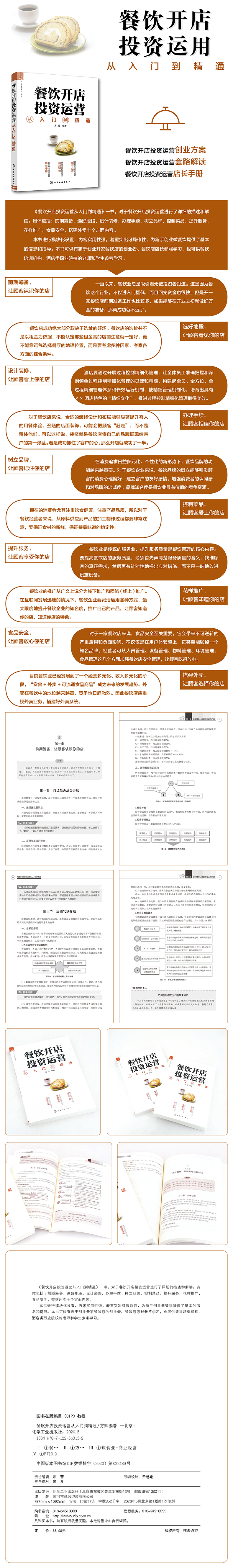 《餐饮开店投资运营从入门到精通(实战精华版)》一书,对于餐饮开店投资运营进行了详细的描述和解读。具体包括:投身餐饮,前期筹备,选好地段,设计装修,办理手续,树立品牌,控制菜品,提升服务,花样推广,食品安全,搭建外卖十个方面内容。 本书进行模块化设置,内容实用性强,着重突出可操作性,为新手创业做餐饮提供了基本的信息和指导。本书可以作为有志于创业开家餐饮店的创业者、餐饮店店长参照学习,也可供餐饮培训机构、酒店类职业院校的老师和学生参考学习。