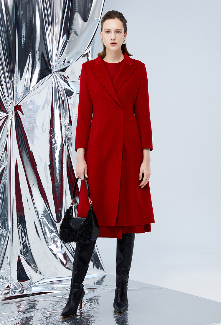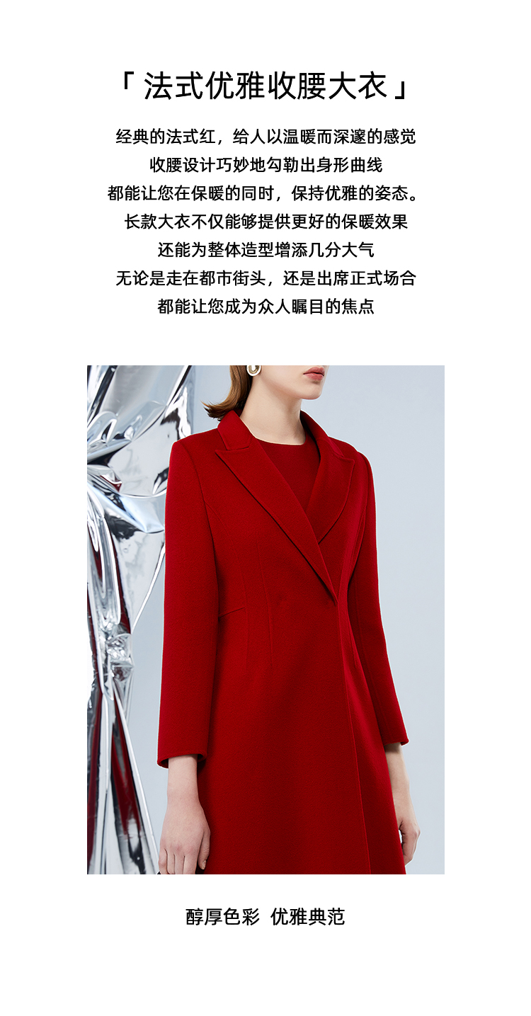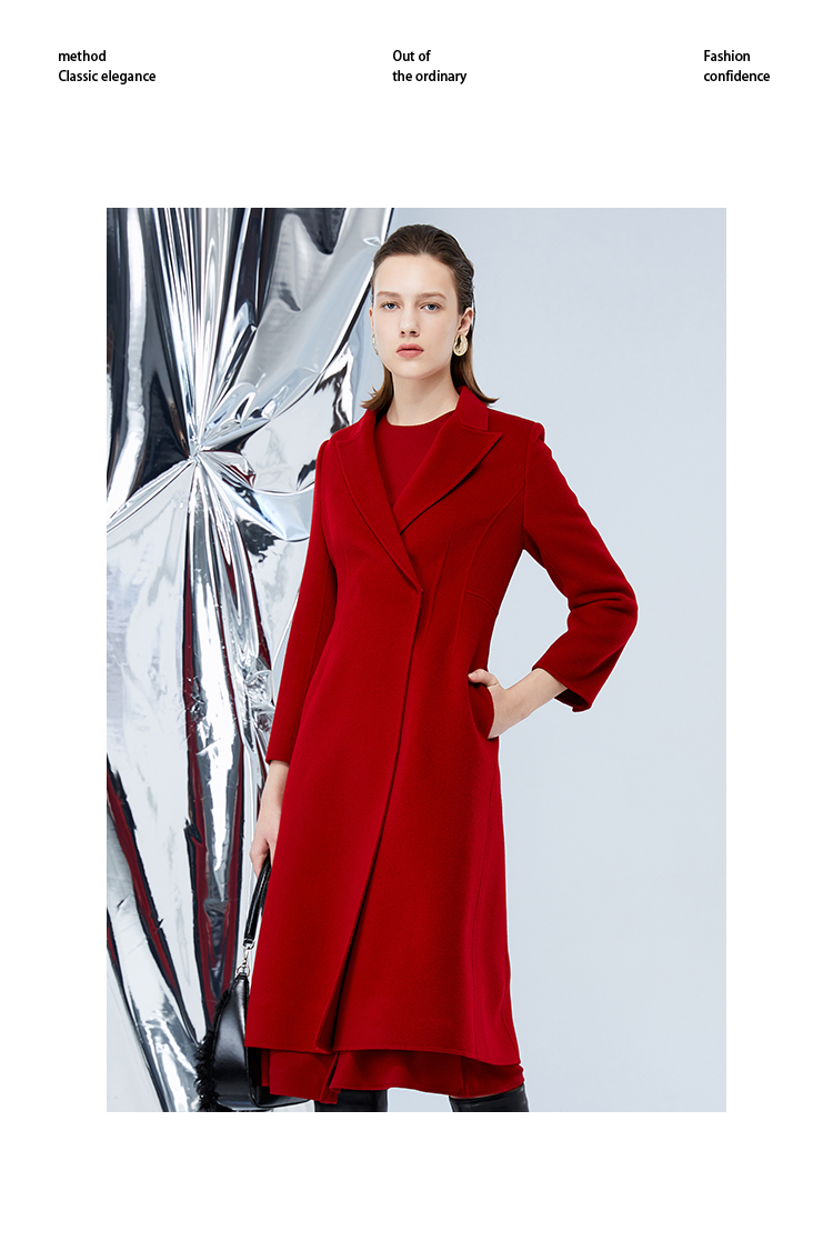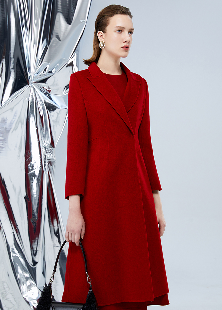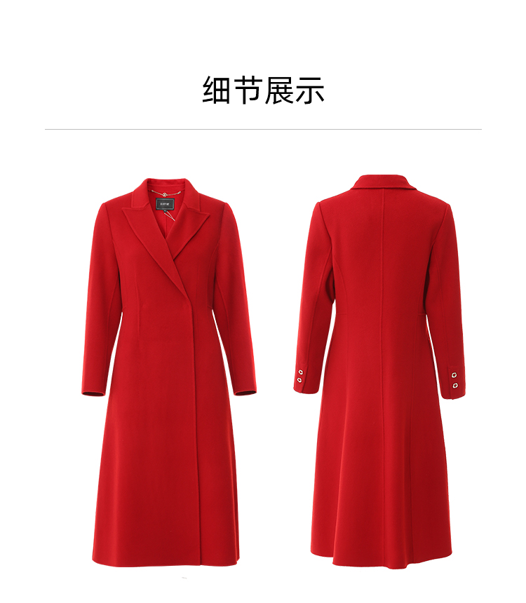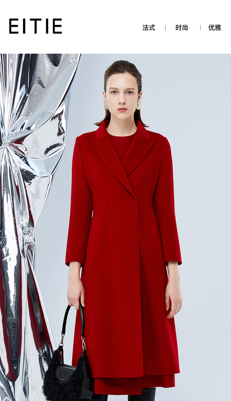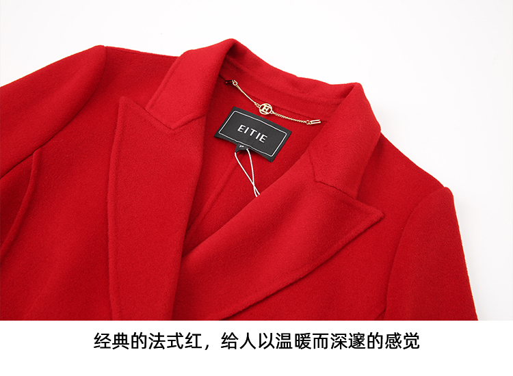 EITIE爱特爱冬季新款时尚复古通勤翻领大衣红色毛呢外套7614301