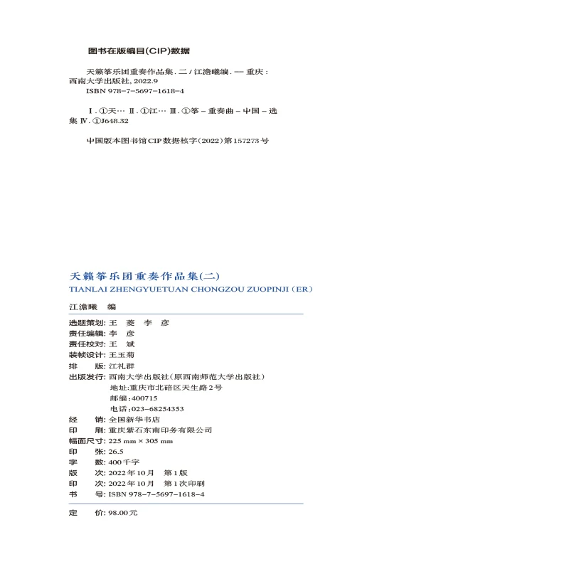 *书名:《天籁筝乐团重奏作品曲集(二)》 | *ISBN:978-7-5697-1618-4 |