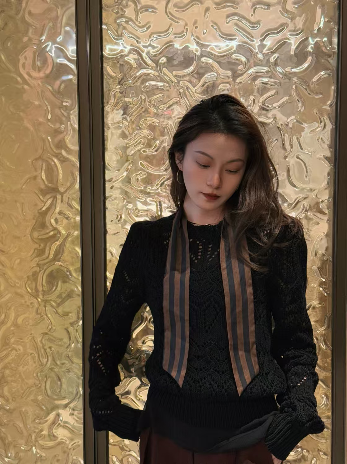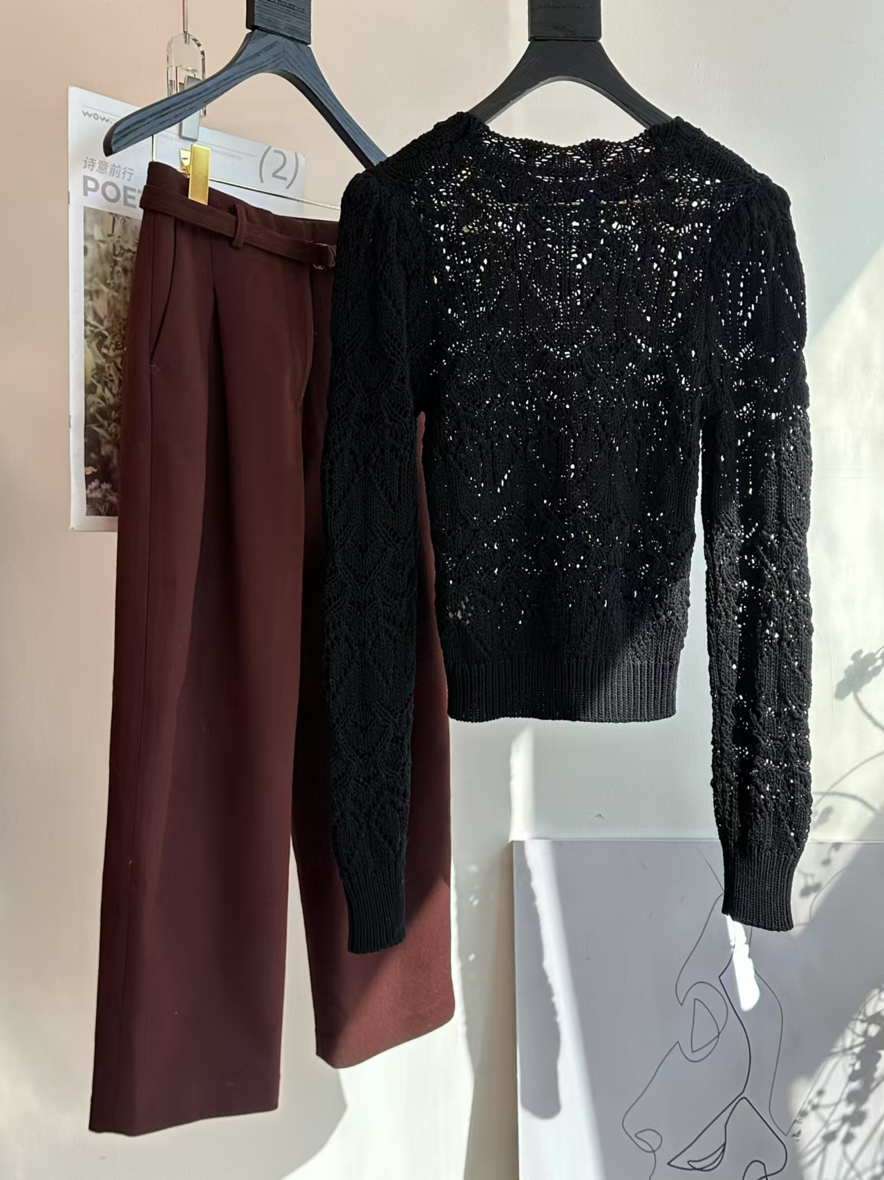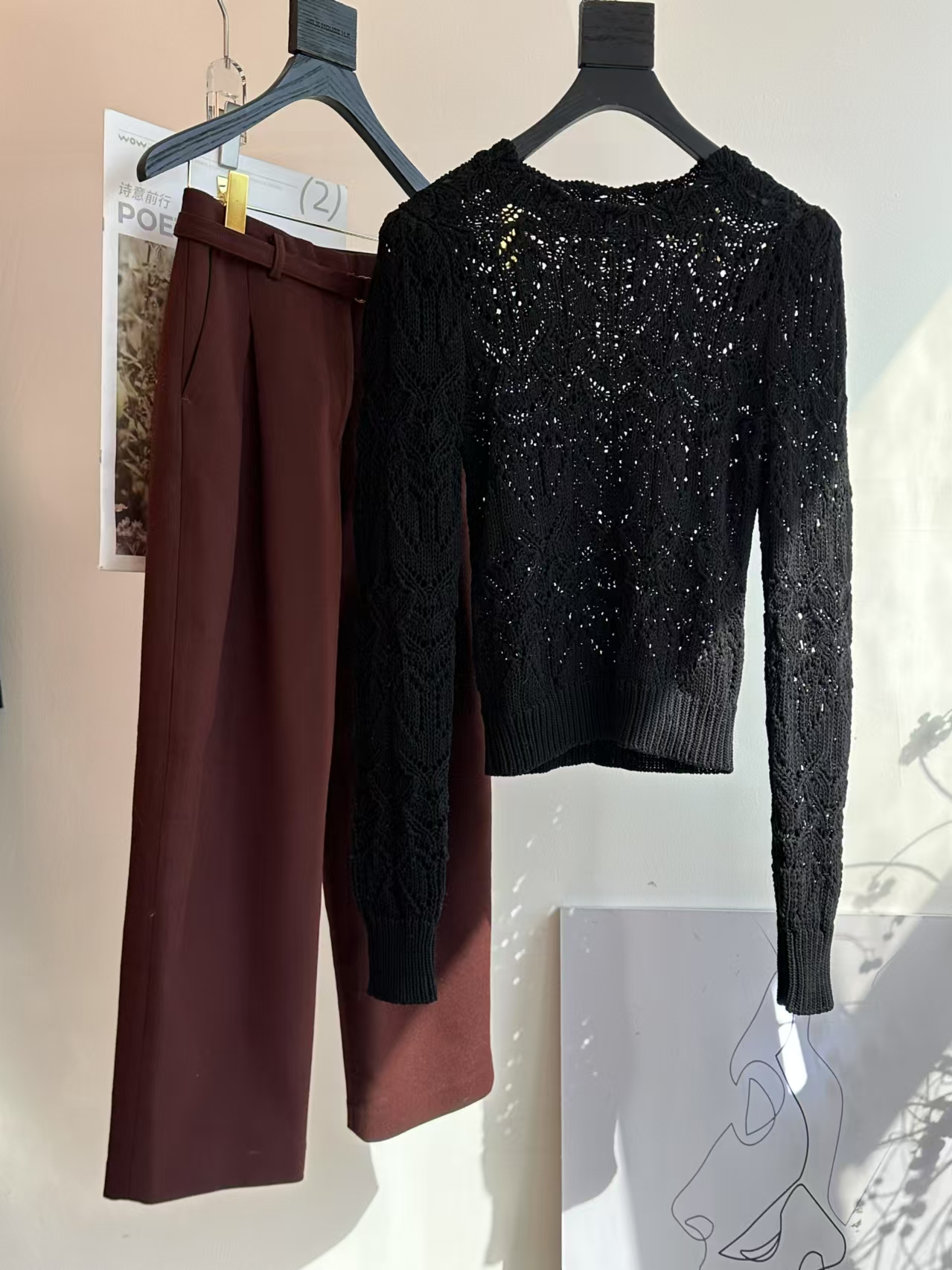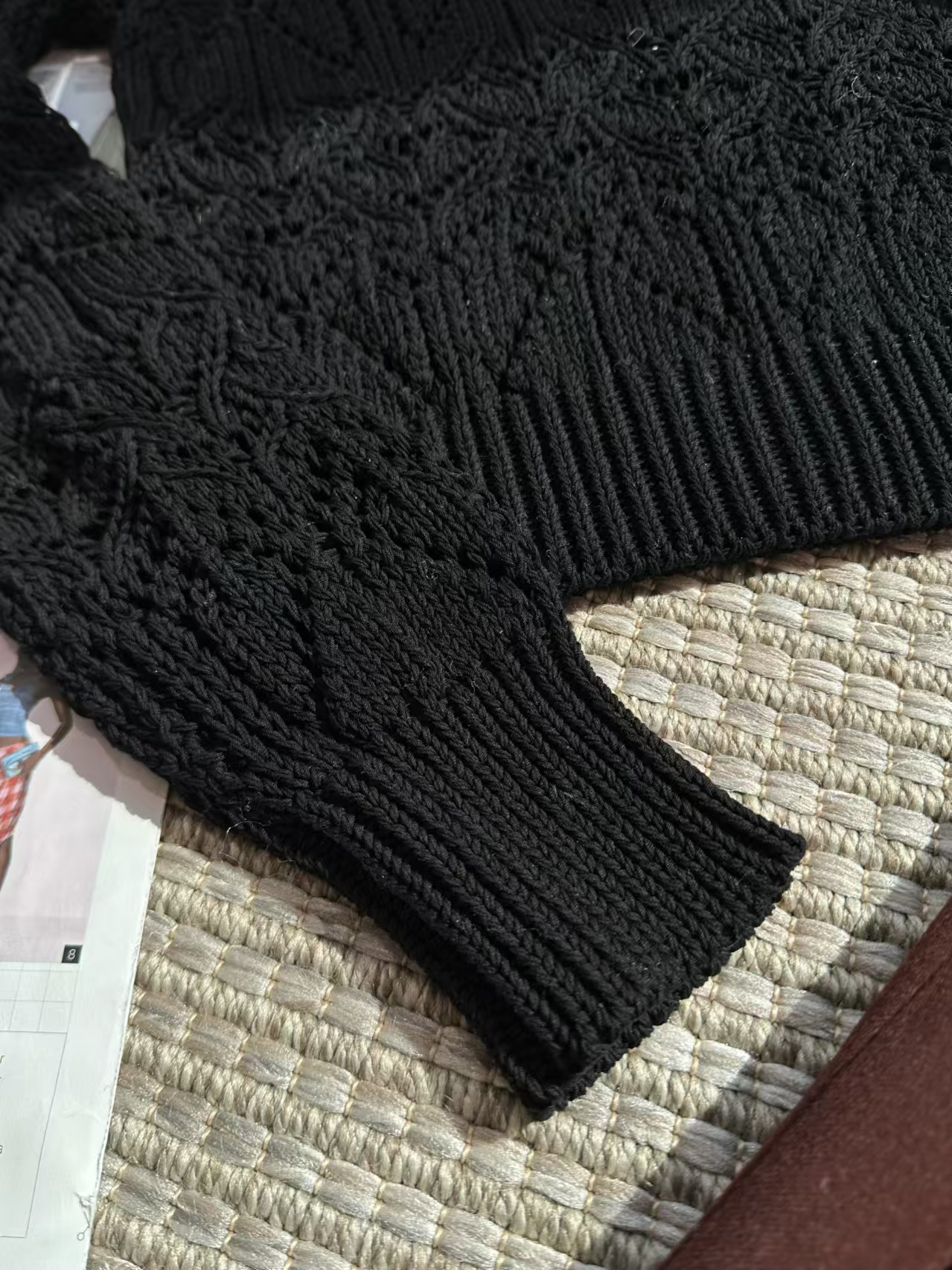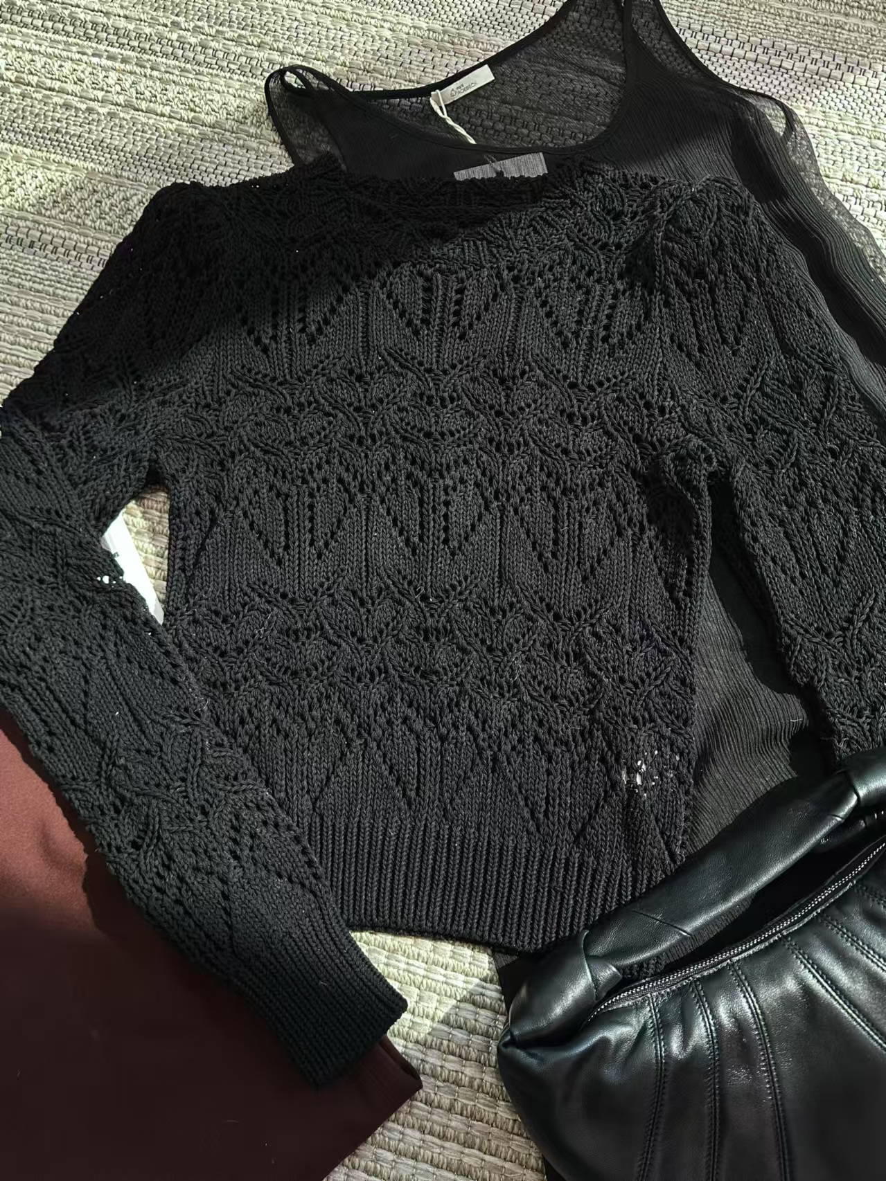 顺丰包邮35256洛诗琳法式优雅黑带垫肩镂空高捻棉勾花上衣162022