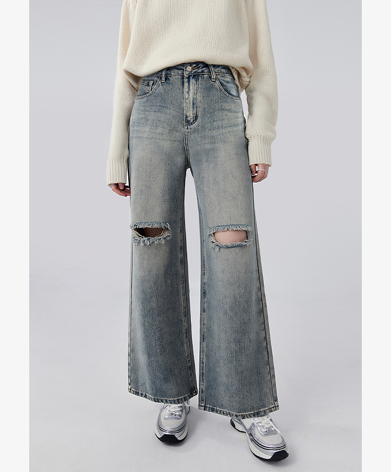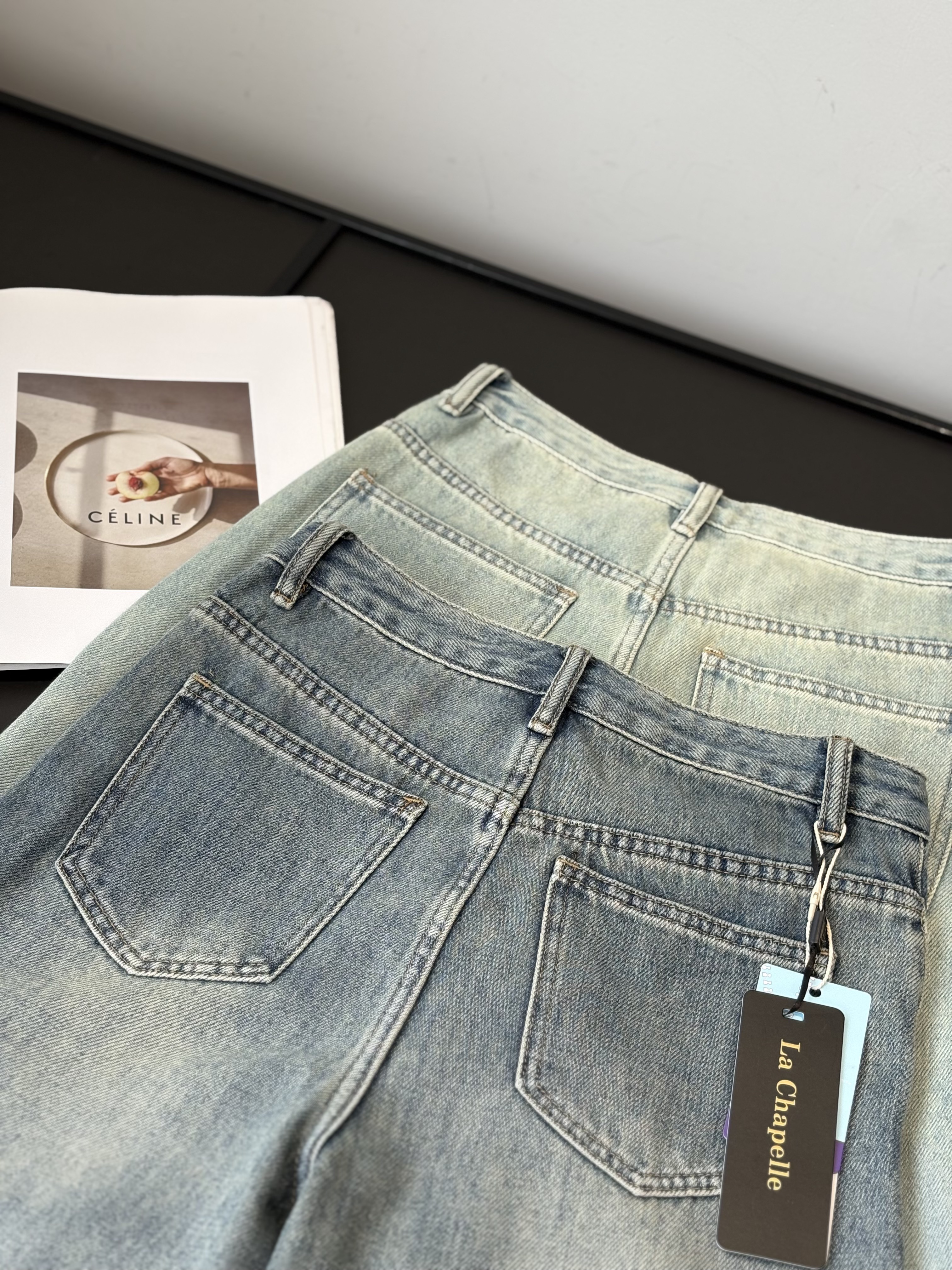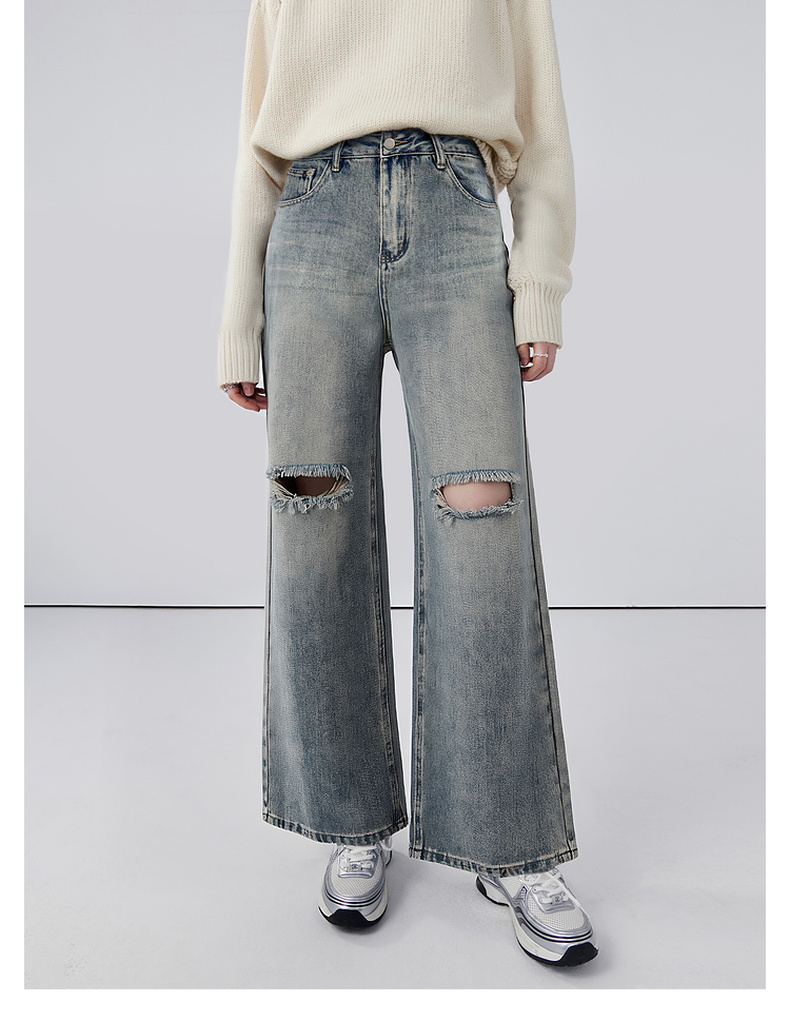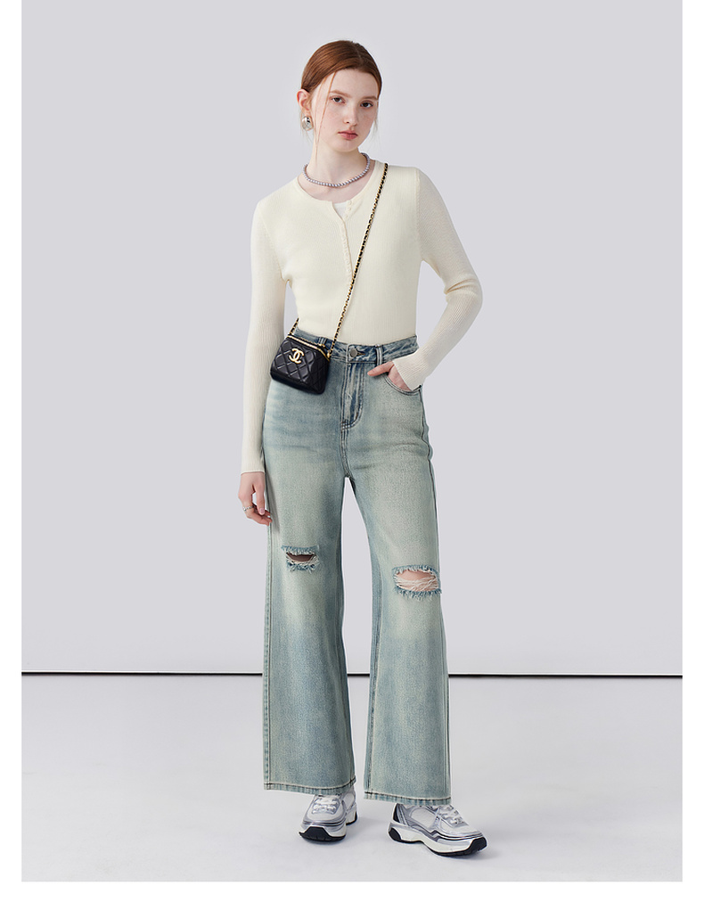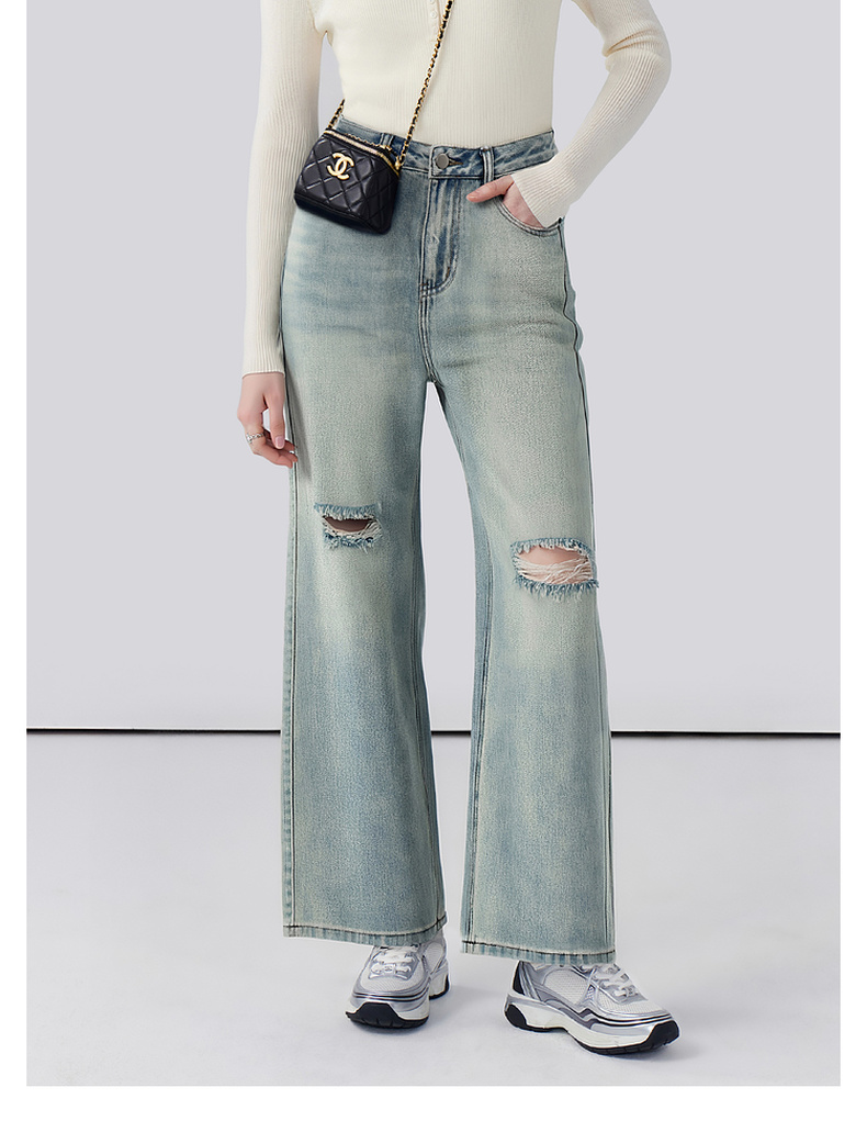 会员福利【高阶感+小个子天菜】拉夏贝尔/La Chapelle美式复古破洞牛仔裤女时尚设计感水洗直筒九分裤