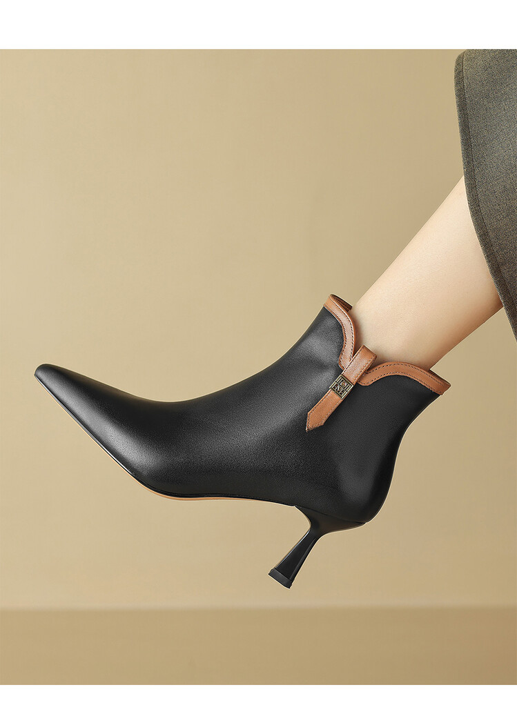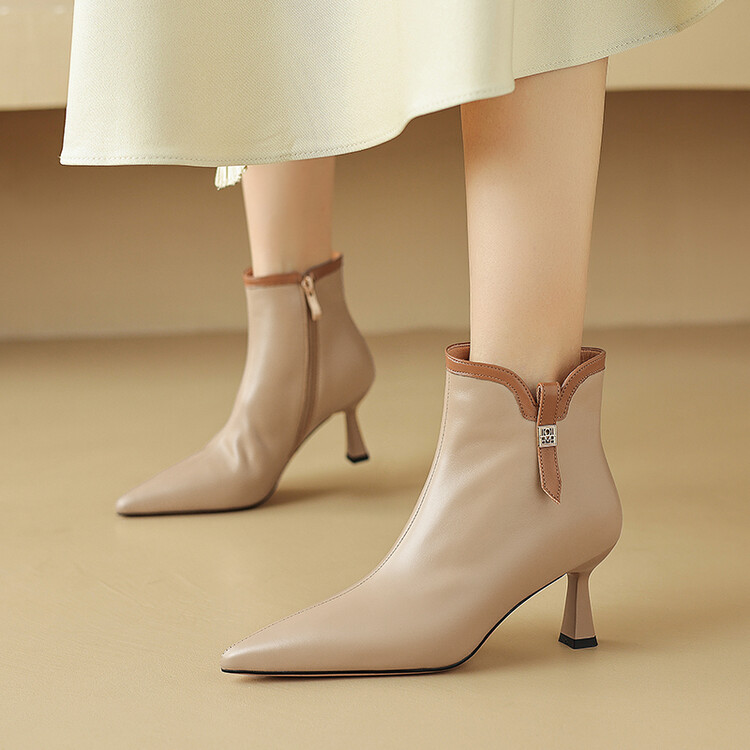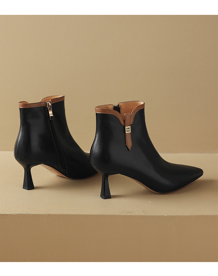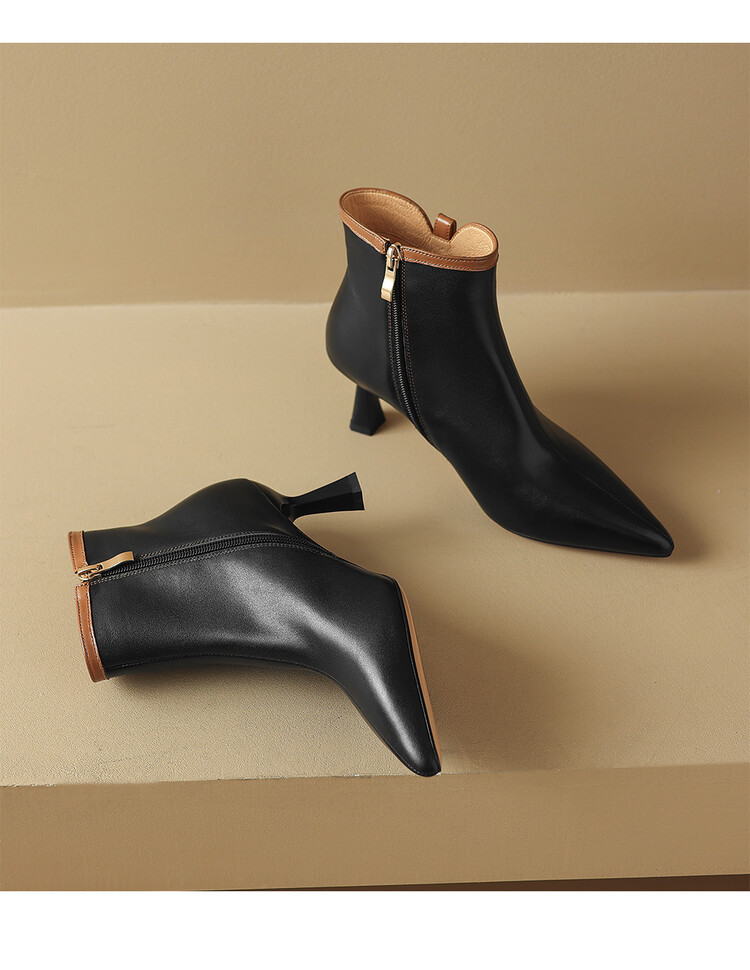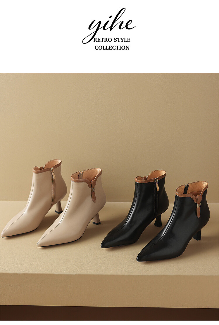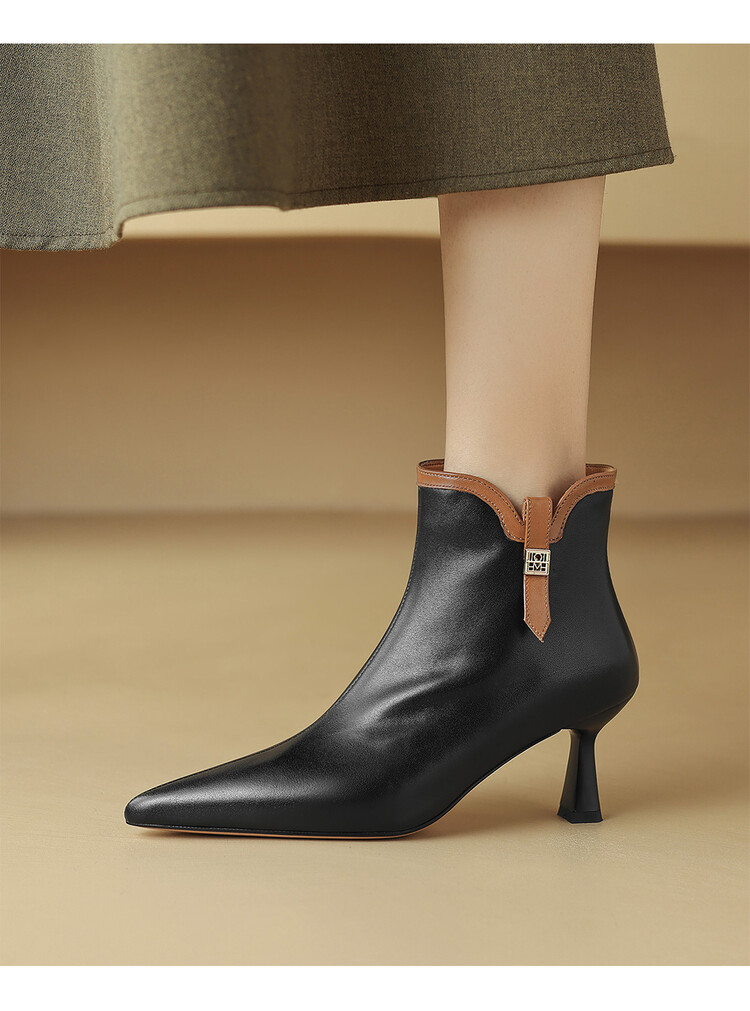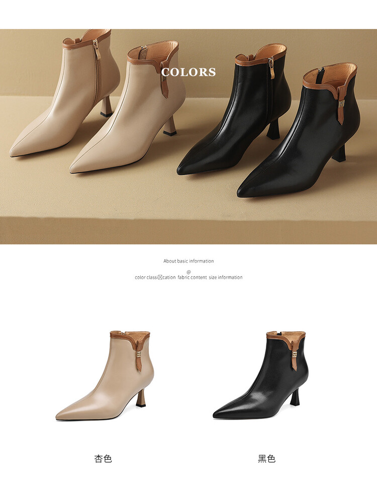 【预售5天】真皮复古拼接尖头短筒靴女秋冬季新款软皮高跟瘦瘦靴子NDXC&6857