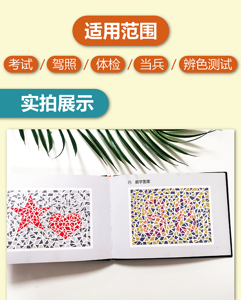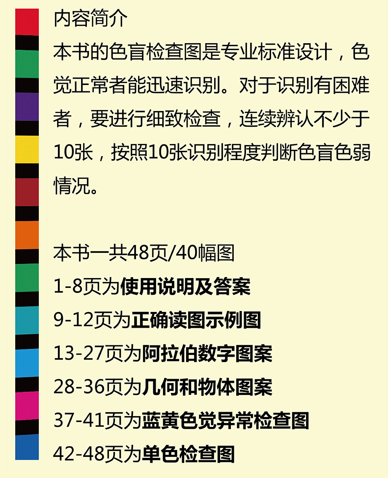 色盲是一种遗传疾病,8%的男性患有此病,但女性患此病的较少,仅为4‰。这种眼病对男性的影响远大于对女性的影响。色盲的人不能从事交通运输、美术、化学、医药、印染等工作,因为这些工作要求对颜色准确辨别。色盲最简单快捷、低成本的方法是使用色盲检查图。色盲检查图根据不同的色盲情况设计特别的图案,正常人可以通过颜色的差别而识别出图案中包含的图形,色盲的人则没办法分辨特定的颜色而无法识别图案中的图形。本书提供特别设计的图形,由色盲的人没法识别的颜色组成图形,正常人可以正确识别,色盲的人则会发生识别错误。