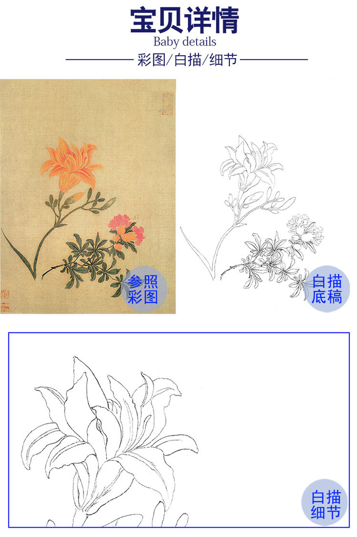 李晓明竖幅条屏工笔花鸟白描底稿-牡丹《富贵白头立轴》-多种白描尺寸可选-K048