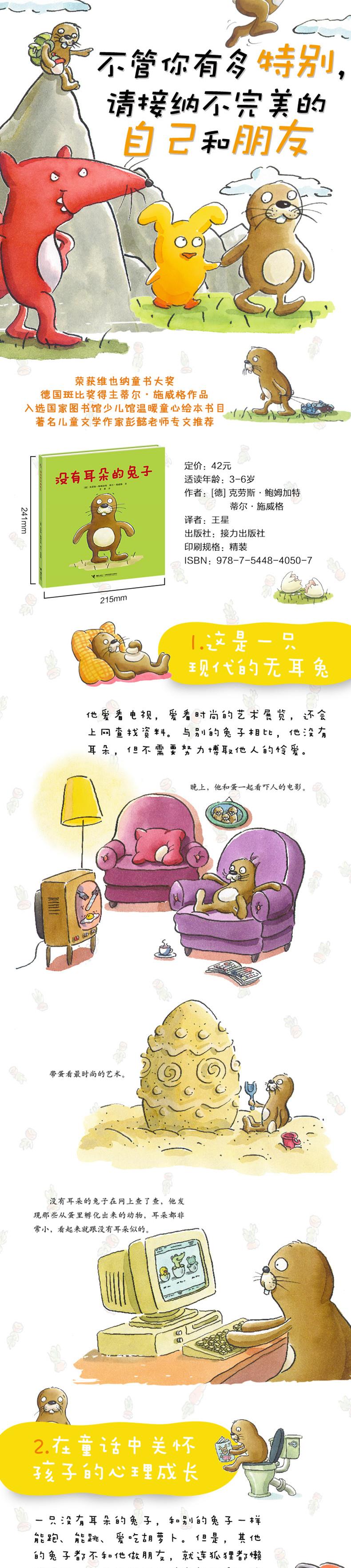 有一只没有耳朵的兔子,他能跑、能跳、爱吃胡萝卜。其他的兔子都和他做朋友,就连狐狸都懒得捉他。可是,在他捡到了一个蛋后,一切都变了……图书富有创意地将电影拍摄技巧融于绘本当中,形成独特的画面语言。作者用巧妙的构图和温馨的画面,告诉读者:不管你有多特别,只要能够认同自己,同样能够快快乐乐。