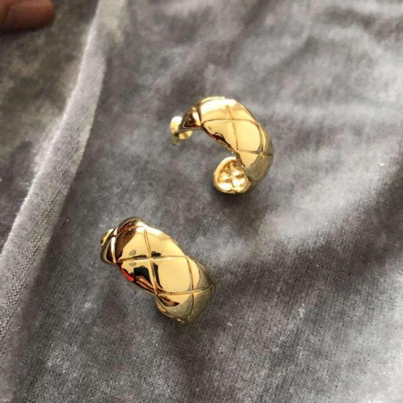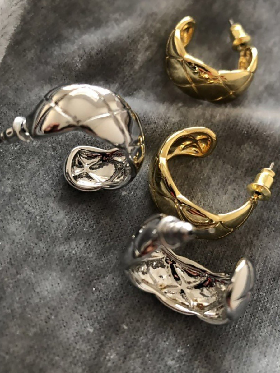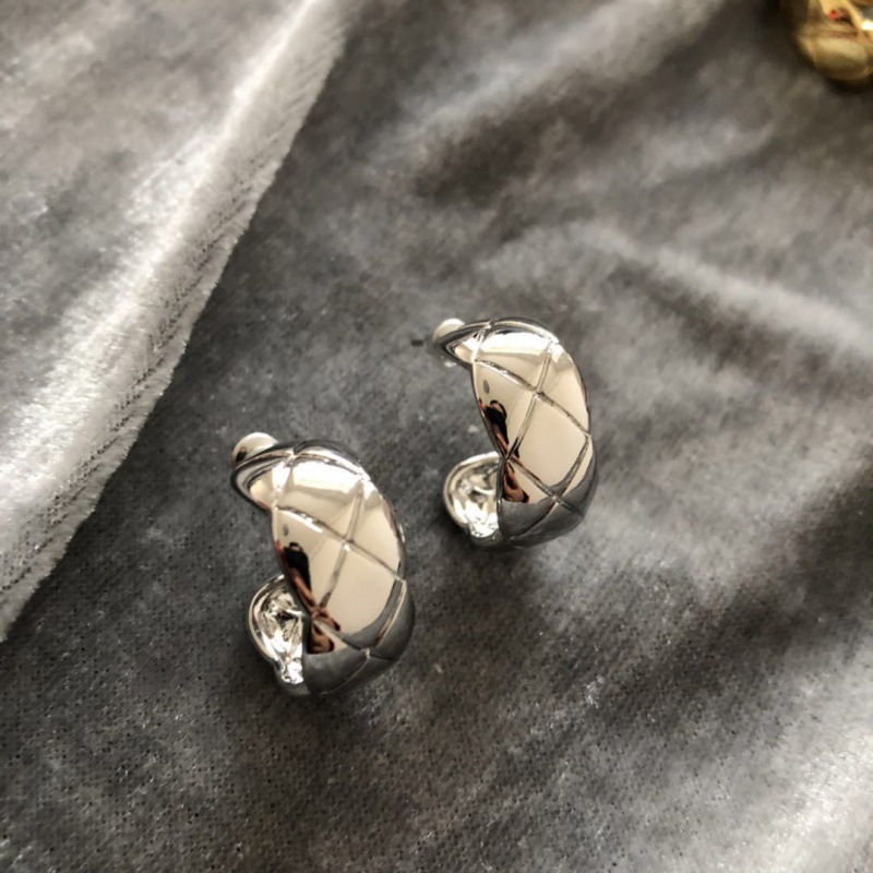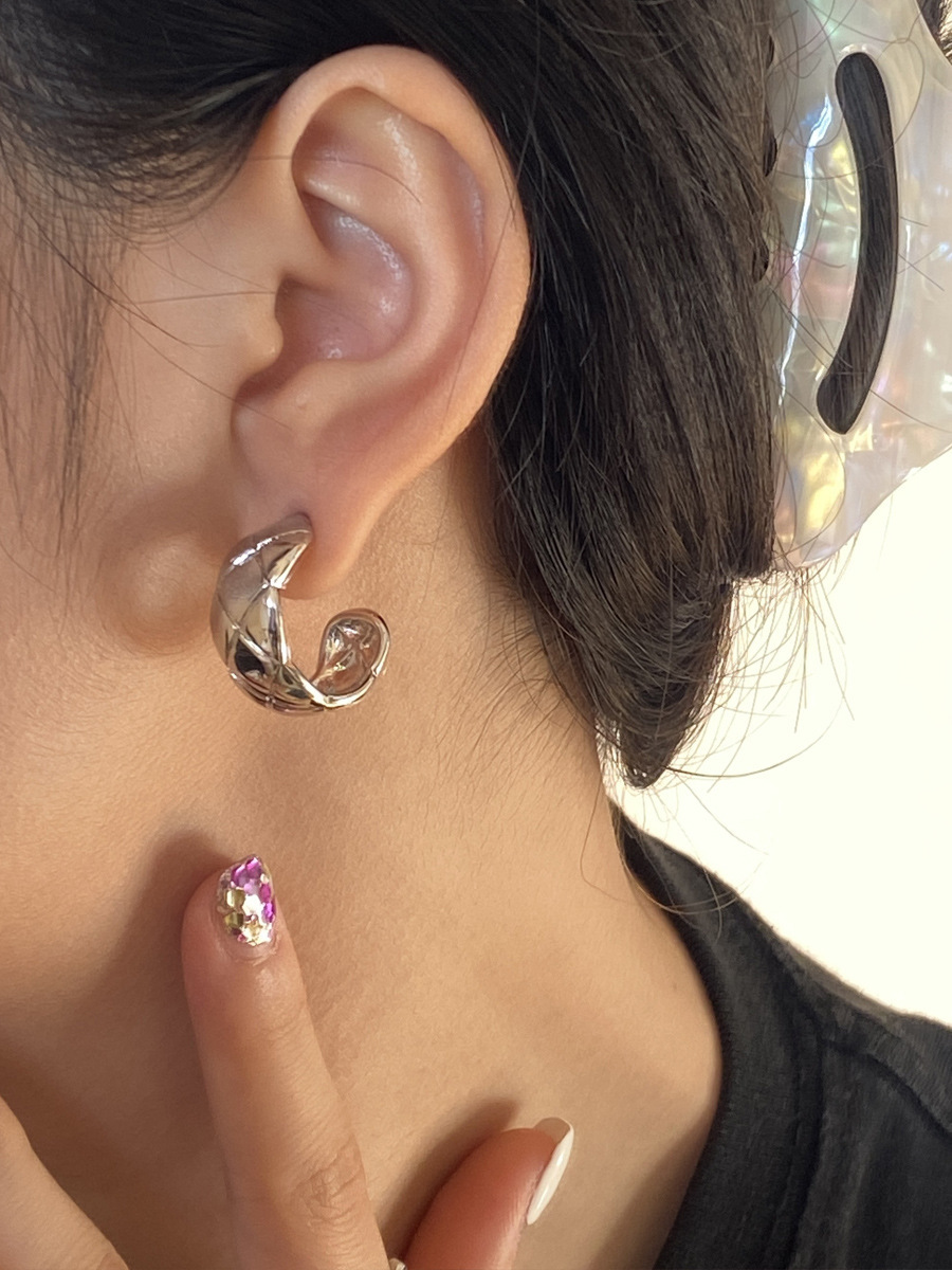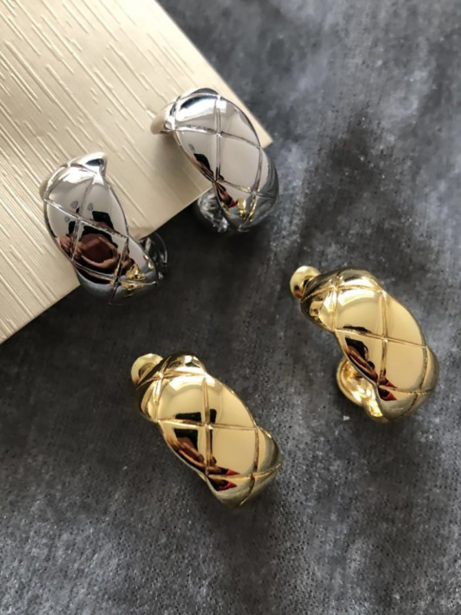 丁摩 S925银针法式简约半圆C形耳钉菱格纹耳环气质女耳饰5ZF-1728
