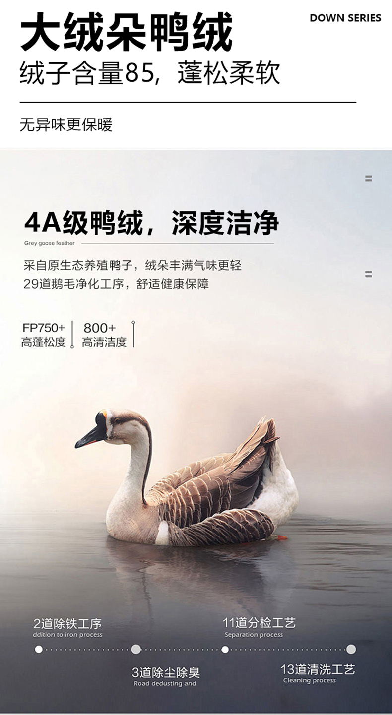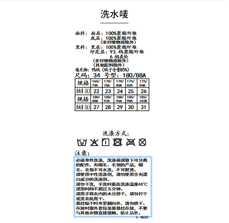 面料:面层:100%聚酯纤维 底层:100%聚酯纤维 里料:里层:100%聚酯纤维 印花层:93.4%聚酯纤维 6.6%氨纶 (非纤维物质除外) (其他配料除外) 填充物:鸭绒(绒子含量85%)