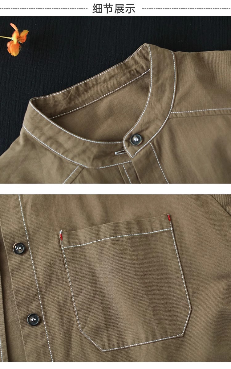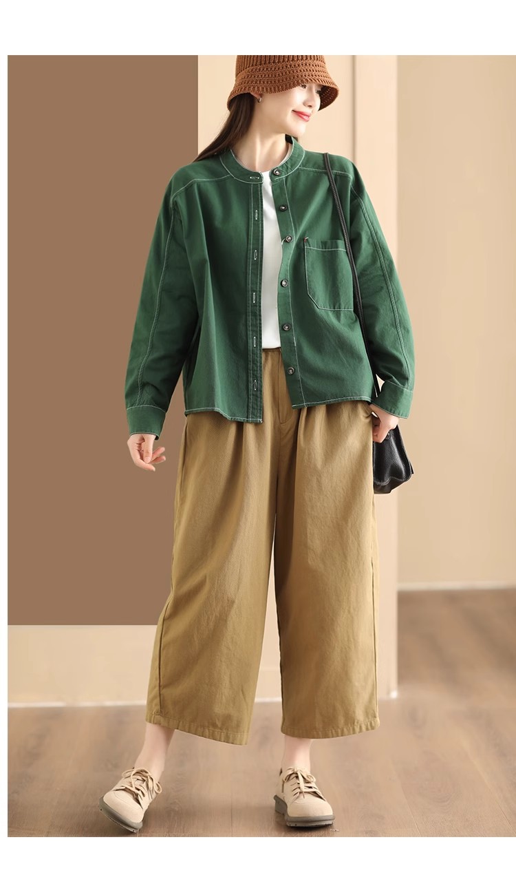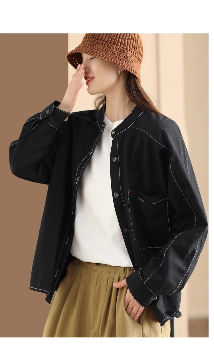 百媚生 复古斜纹棉质长袖衬衫女立领开衫2412