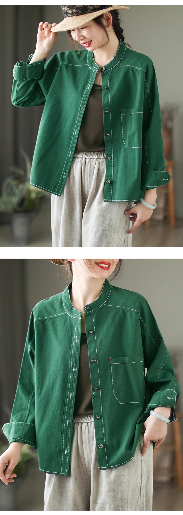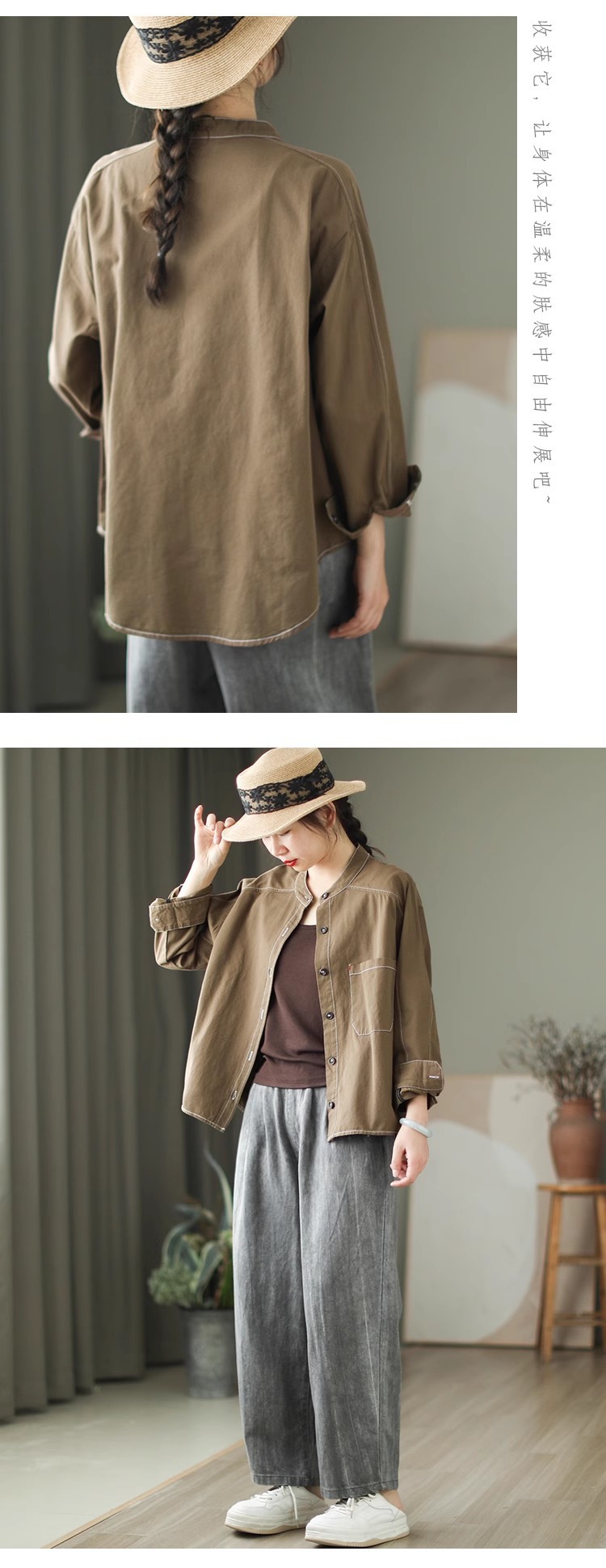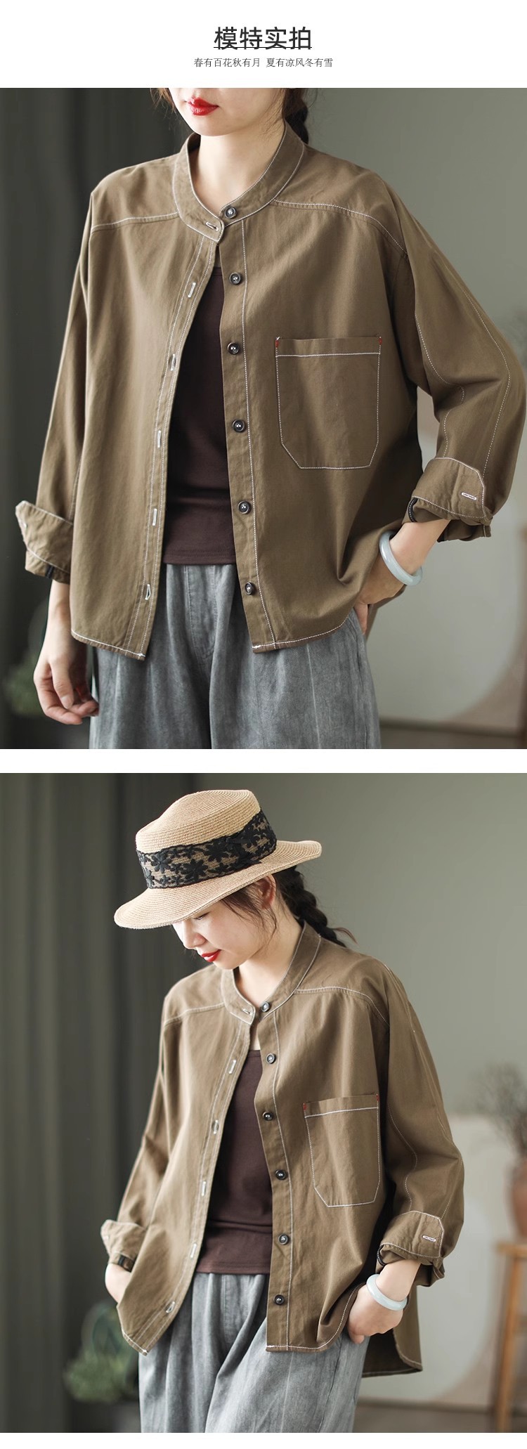 百媚生 复古斜纹棉质长袖衬衫女立领开衫2412