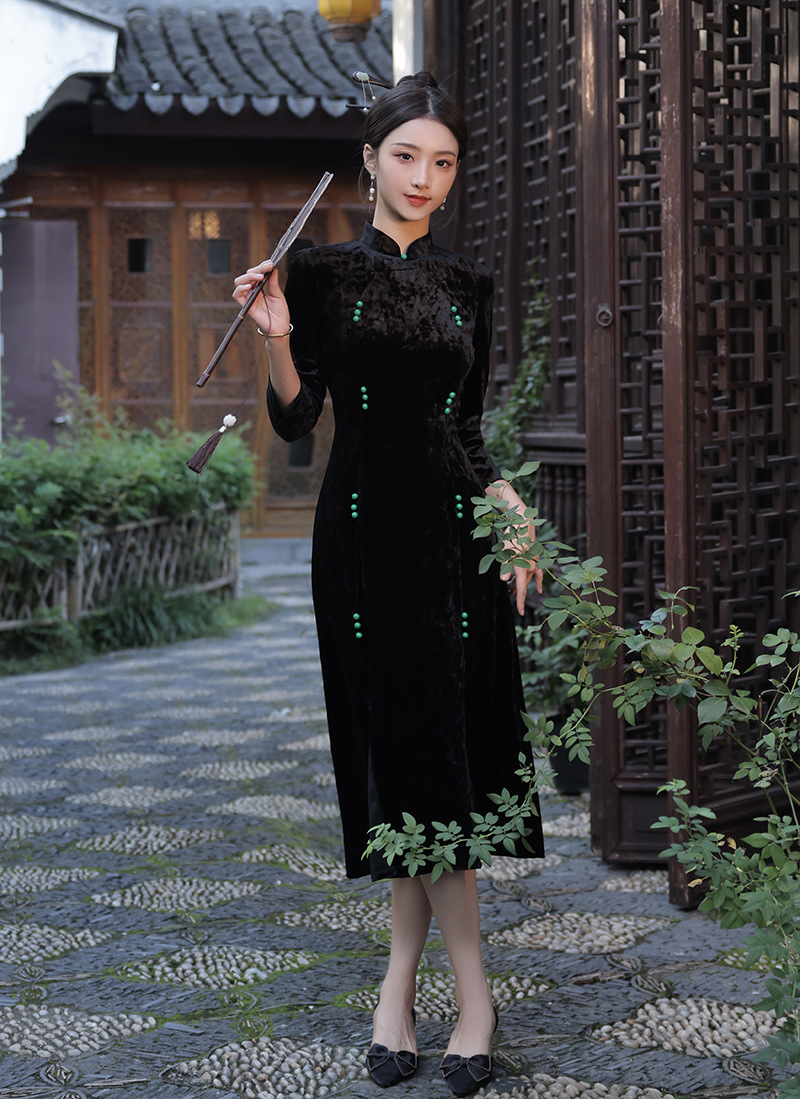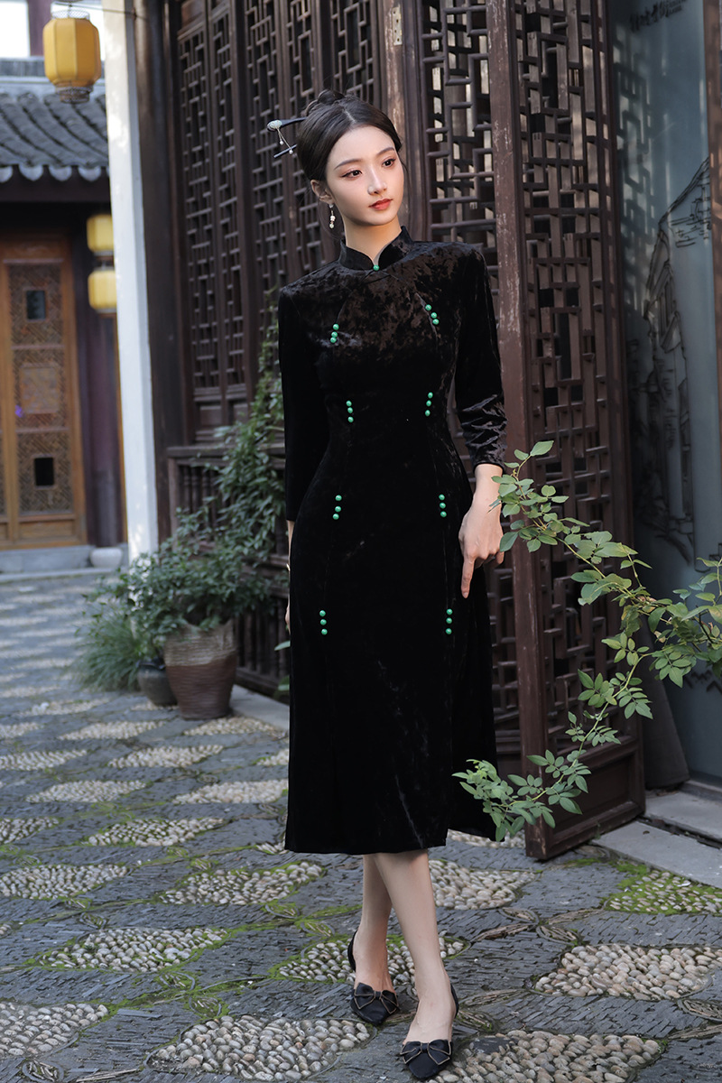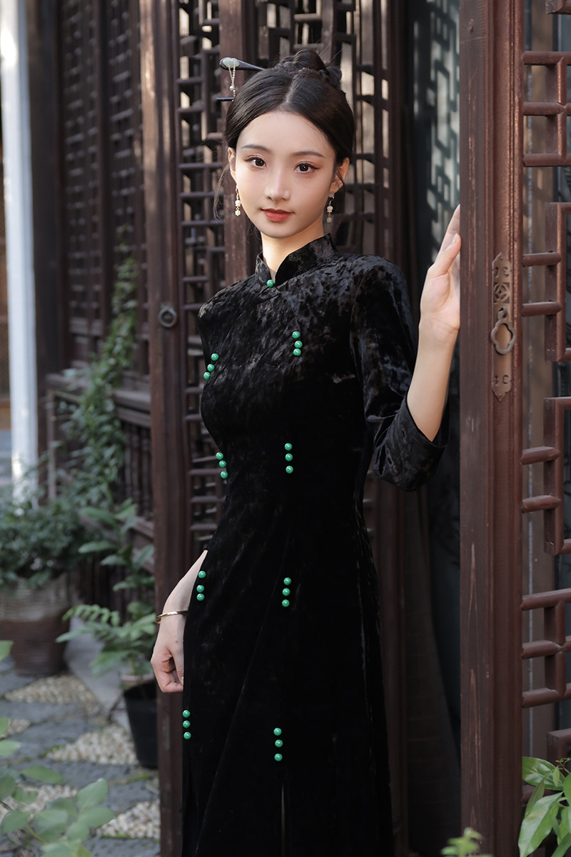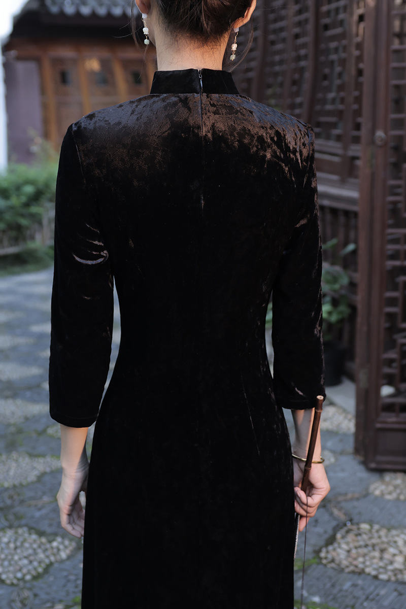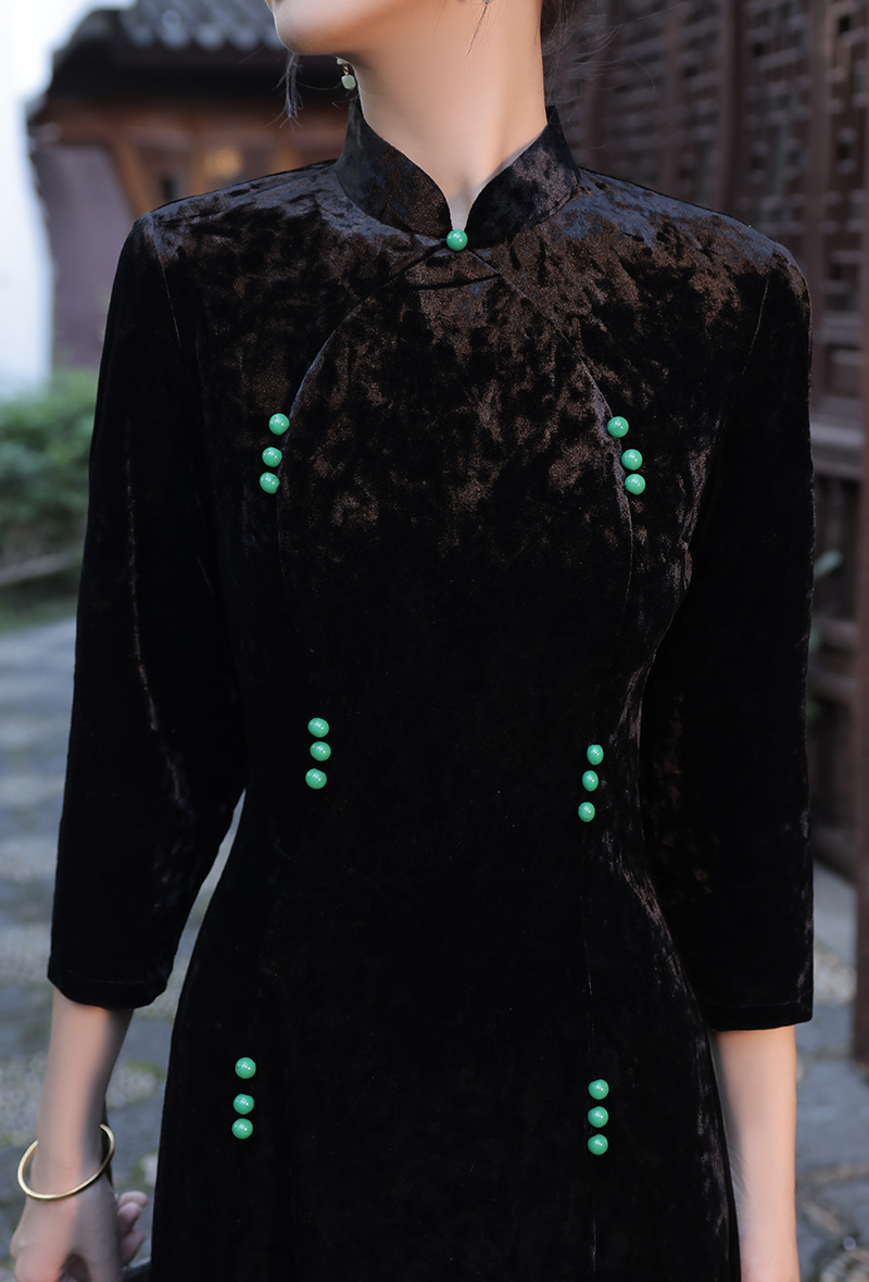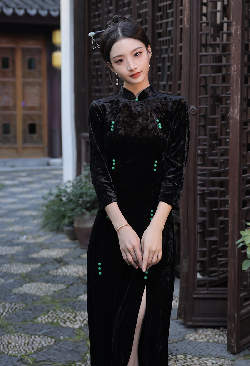 丝绒改良前开叉,日常遮肉七分袖新中式旗袍XL-23267