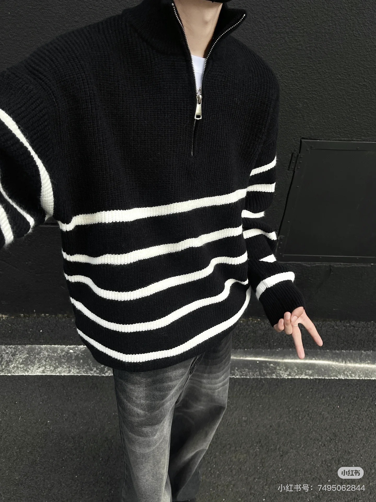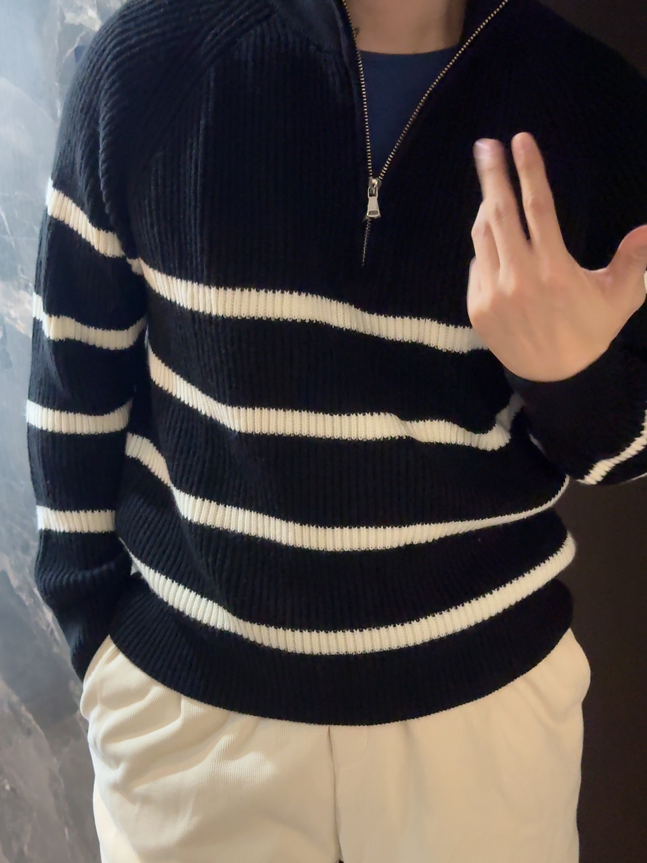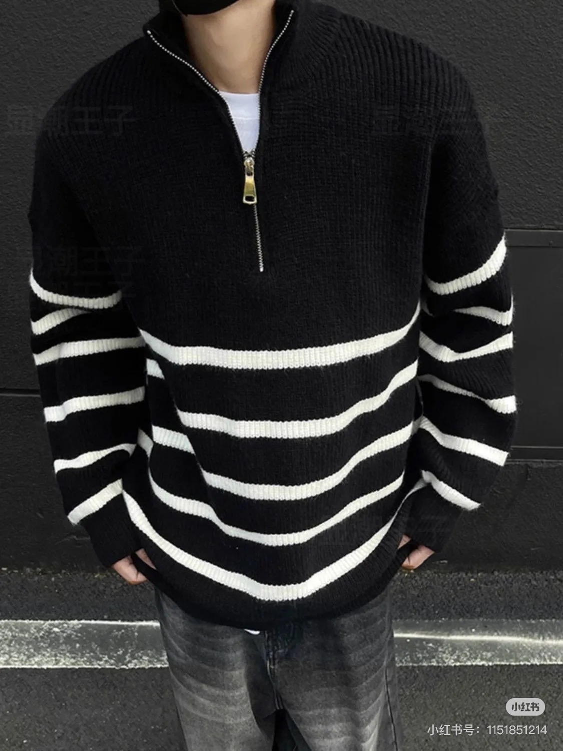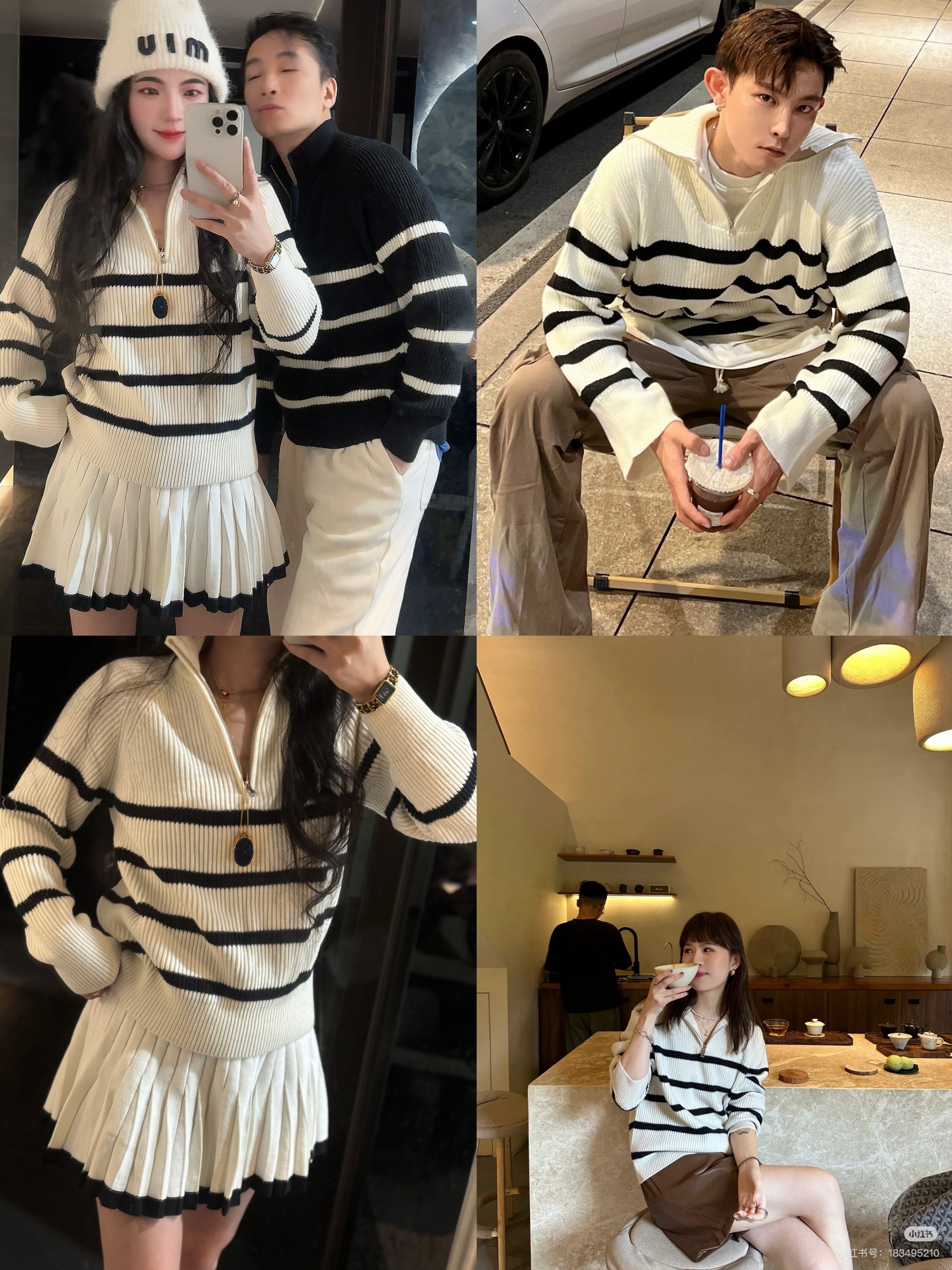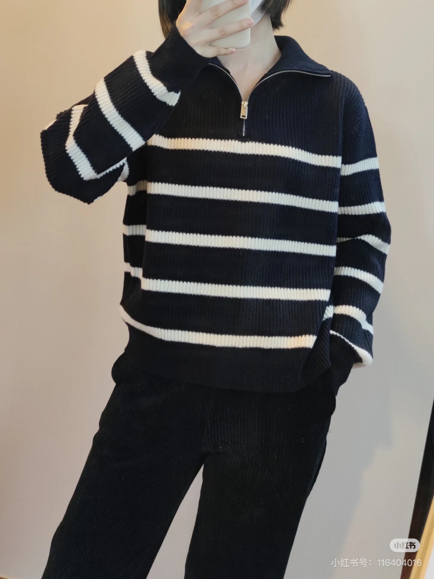 🍁秋风起,保暖要及时!这款半拉链毛衣,绝对是你的衣橱必备神器。美式复古的风格,让你轻松驾驭潮流趋势。黑白底色搭配经典条纹,是永不过时的百搭公式,半拉链翻领设计太加分了,拉高一点是利落的小立领,拉低一点是随性的大翻领,一衣多穿的造型感直接拉满~羊毛混仿面料柔软亲肤。