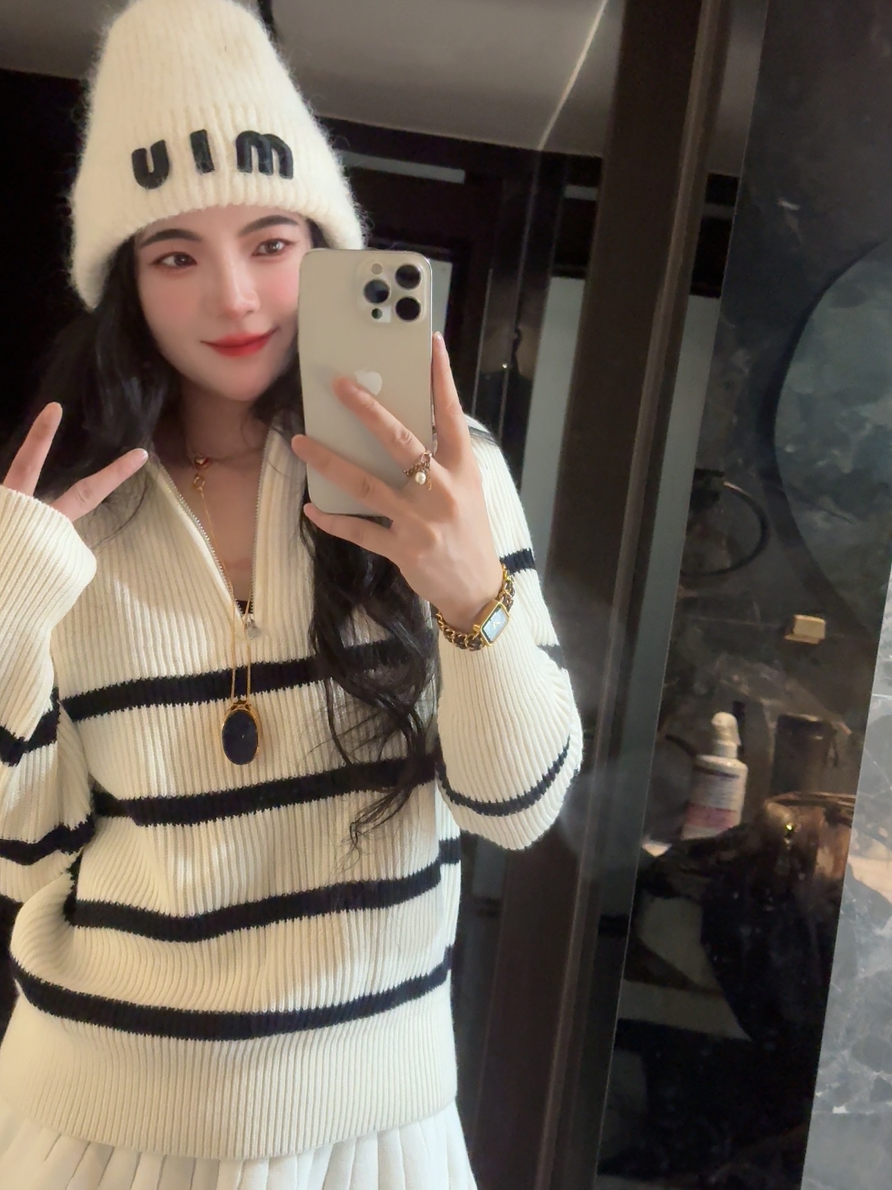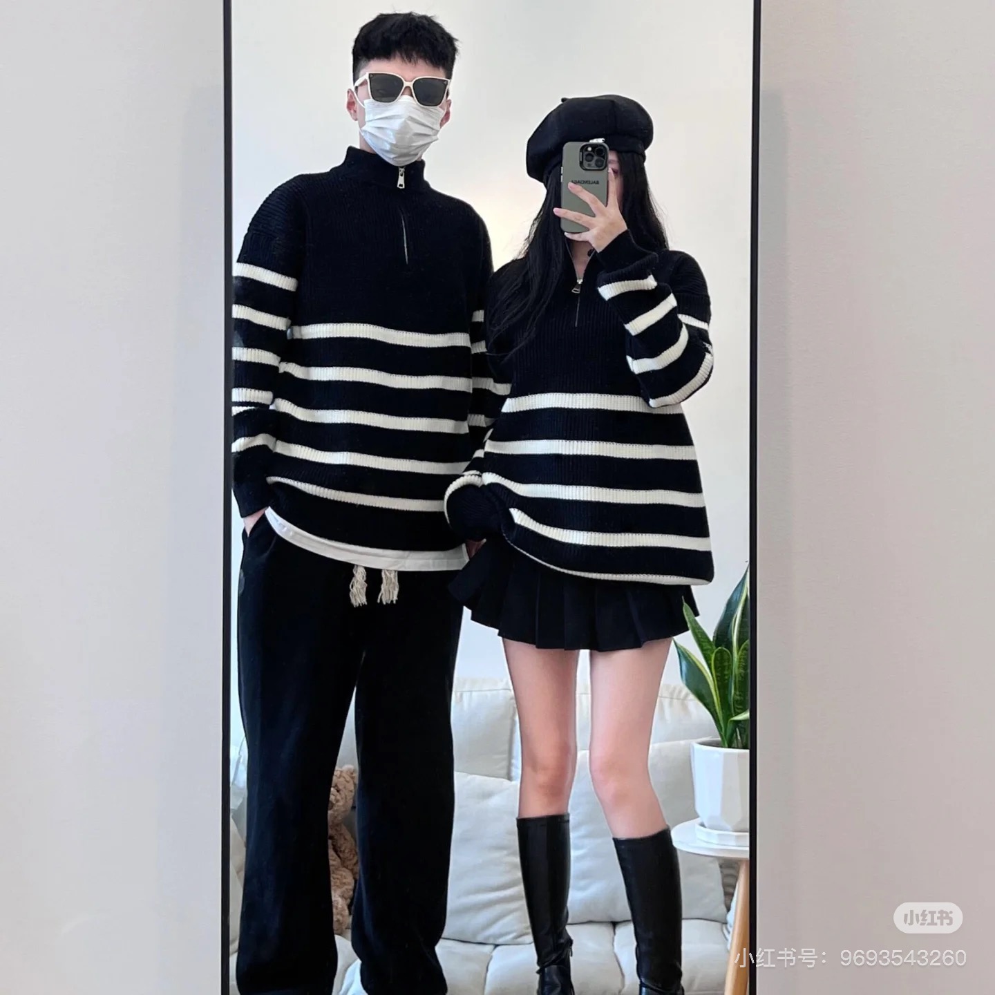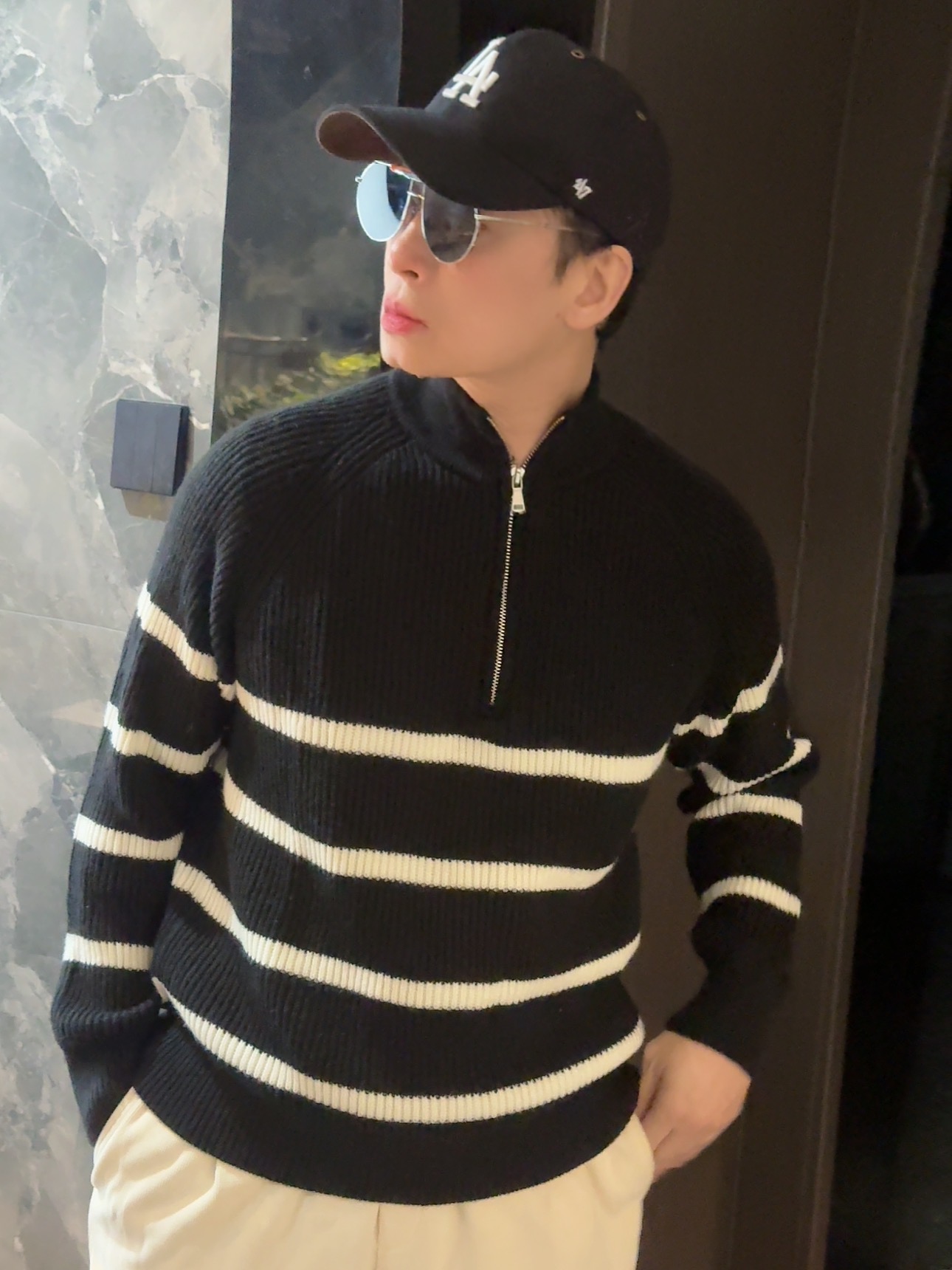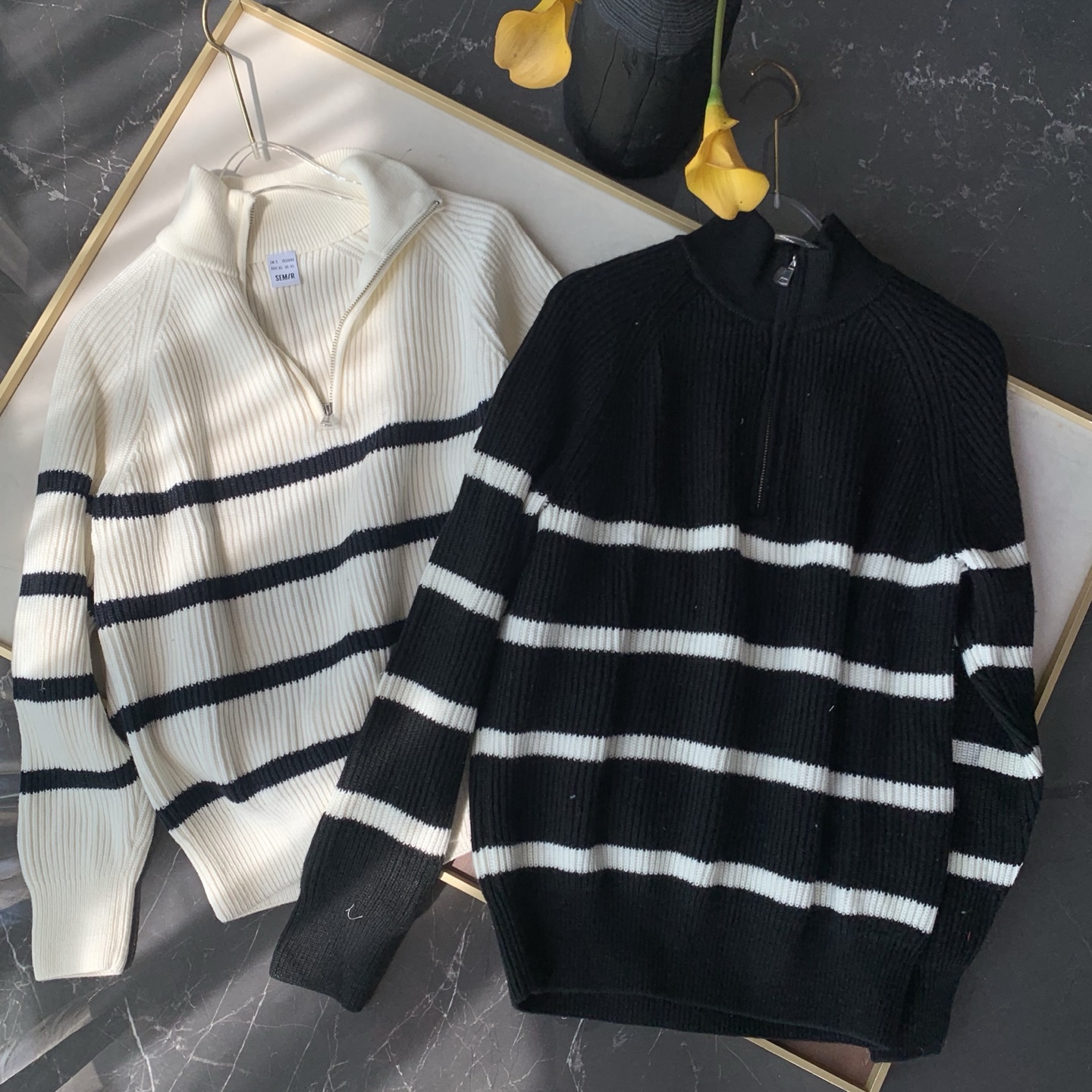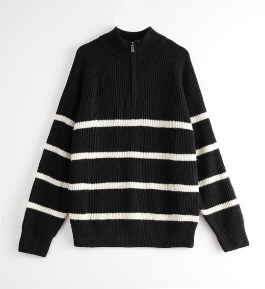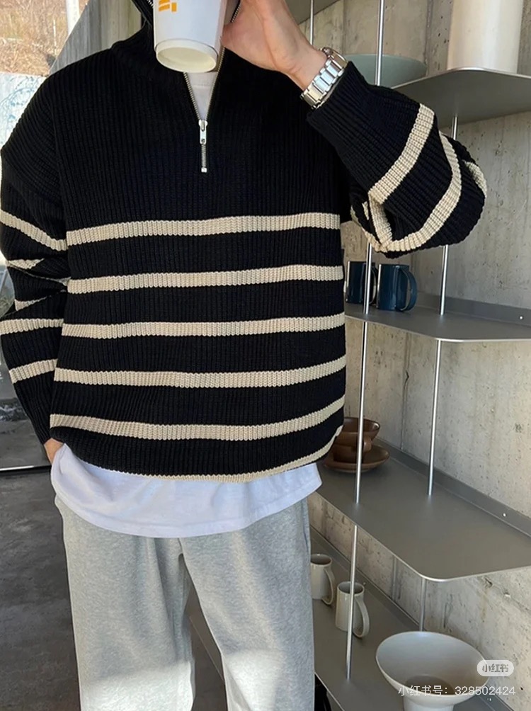 🍁秋风起,保暖要及时!这款半拉链毛衣,绝对是你的衣橱必备神器。美式复古的风格,让你轻松驾驭潮流趋势。黑白底色搭配经典条纹,是永不过时的百搭公式,半拉链翻领设计太加分了,拉高一点是利落的小立领,拉低一点是随性的大翻领,一衣多穿的造型感直接拉满~羊毛混仿面料柔软亲肤。