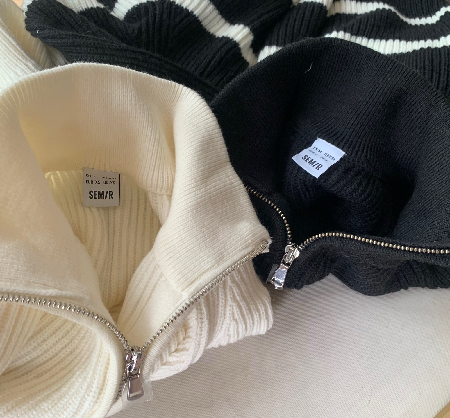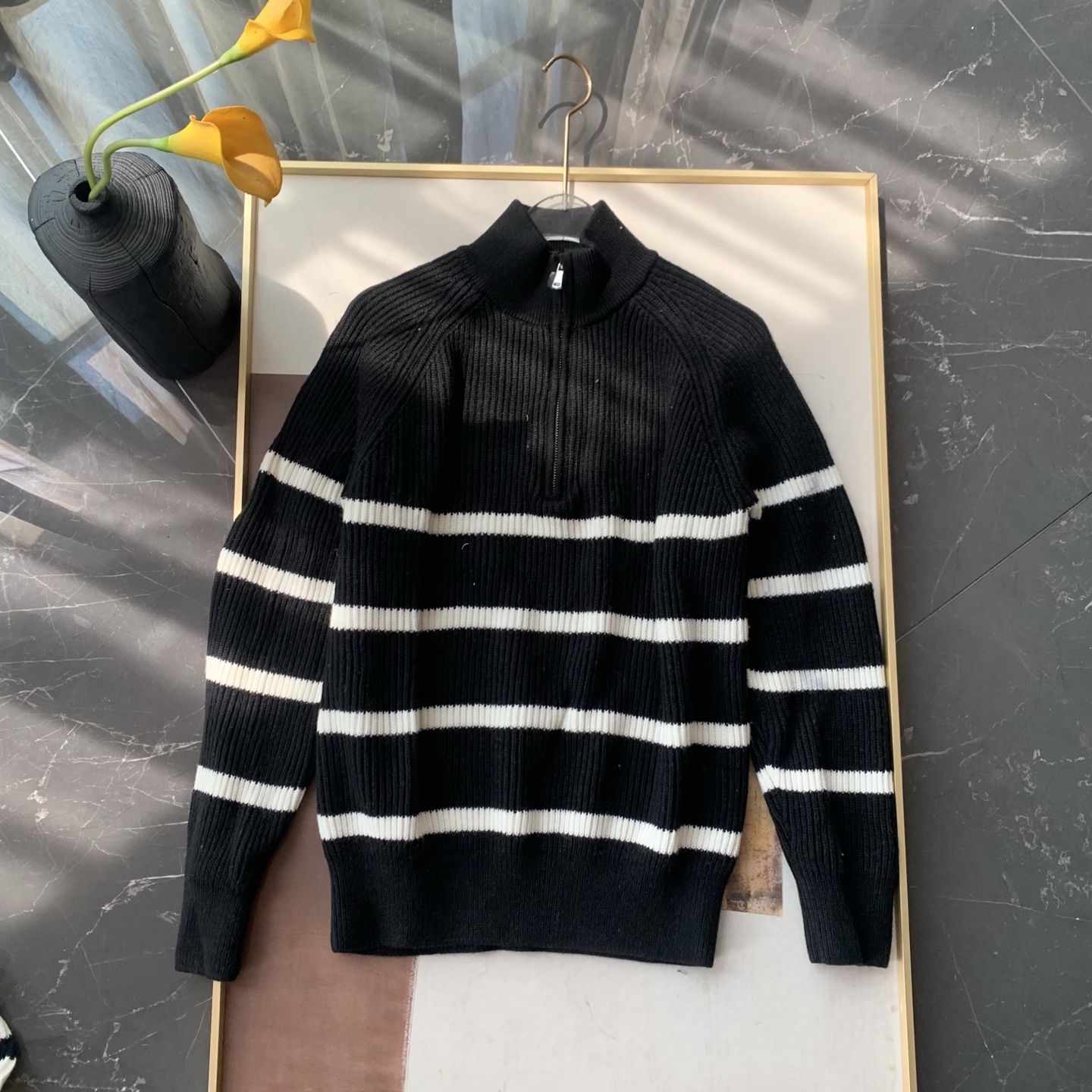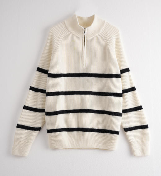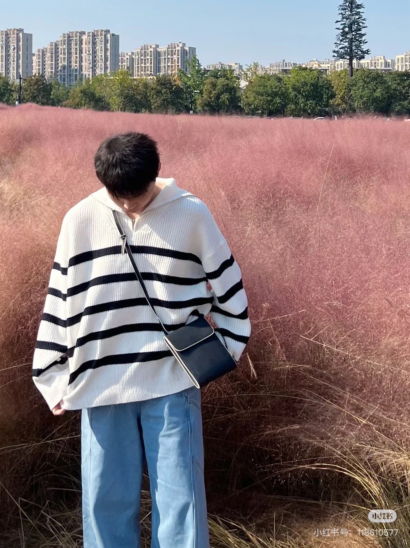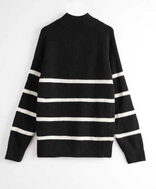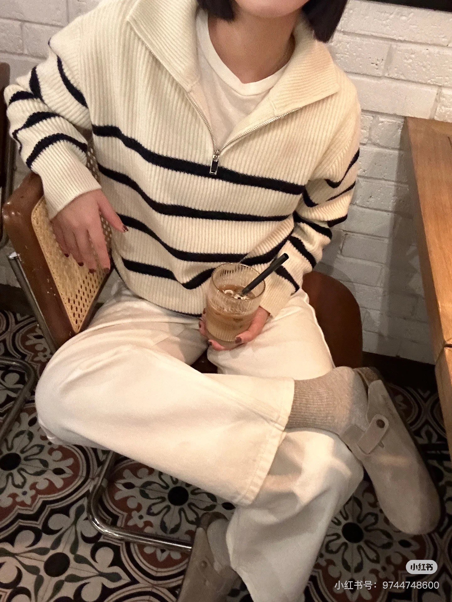 🍁秋风起,保暖要及时!这款半拉链毛衣,绝对是你的衣橱必备神器。美式复古的风格,让你轻松驾驭潮流趋势。黑白底色搭配经典条纹,是永不过时的百搭公式,半拉链翻领设计太加分了,拉高一点是利落的小立领,拉低一点是随性的大翻领,一衣多穿的造型感直接拉满~羊毛混仿面料柔软亲肤。