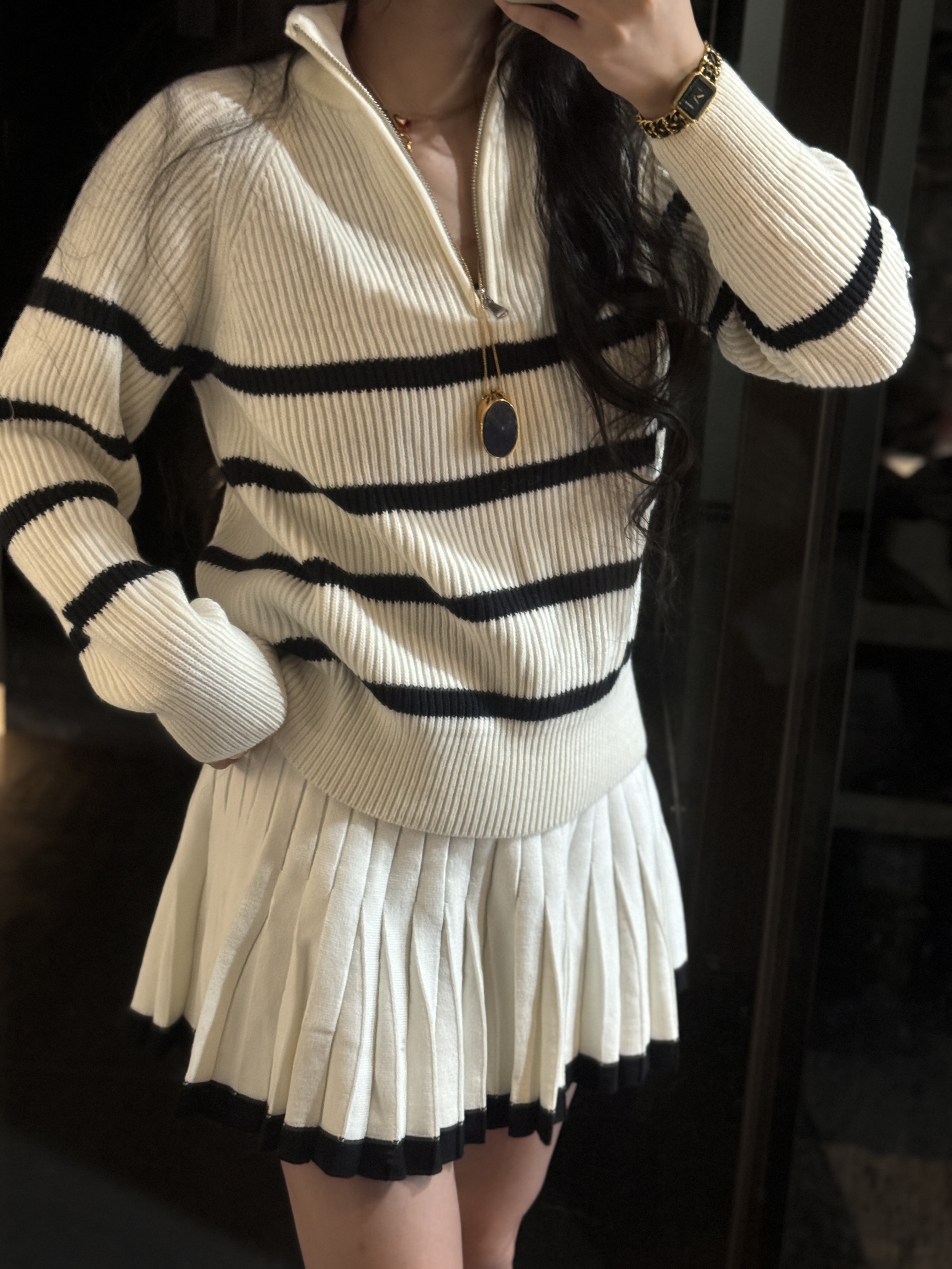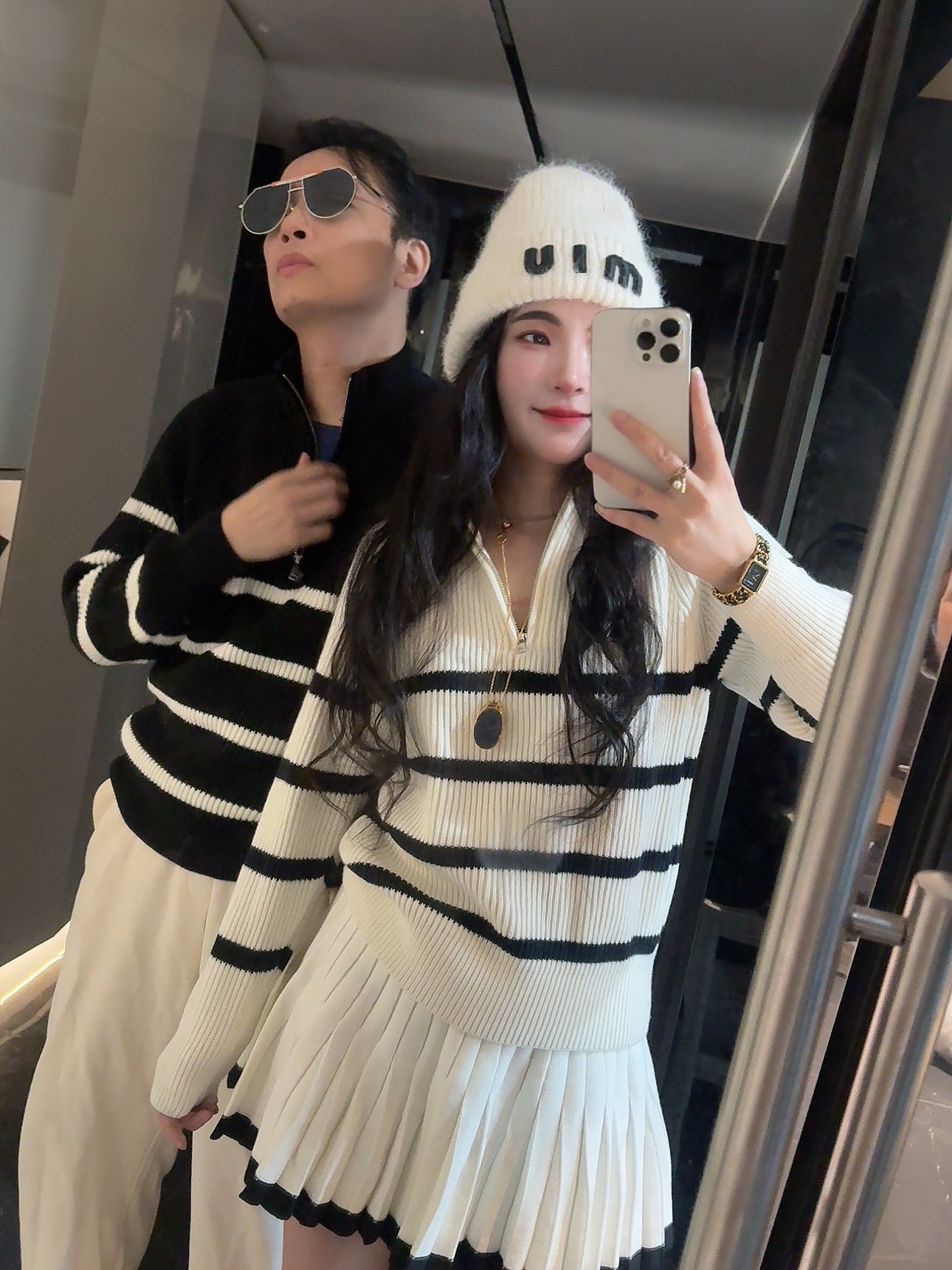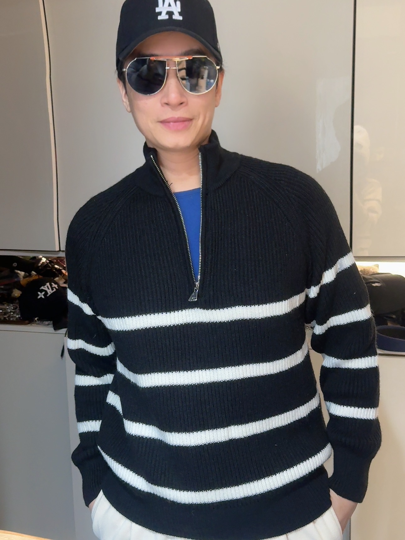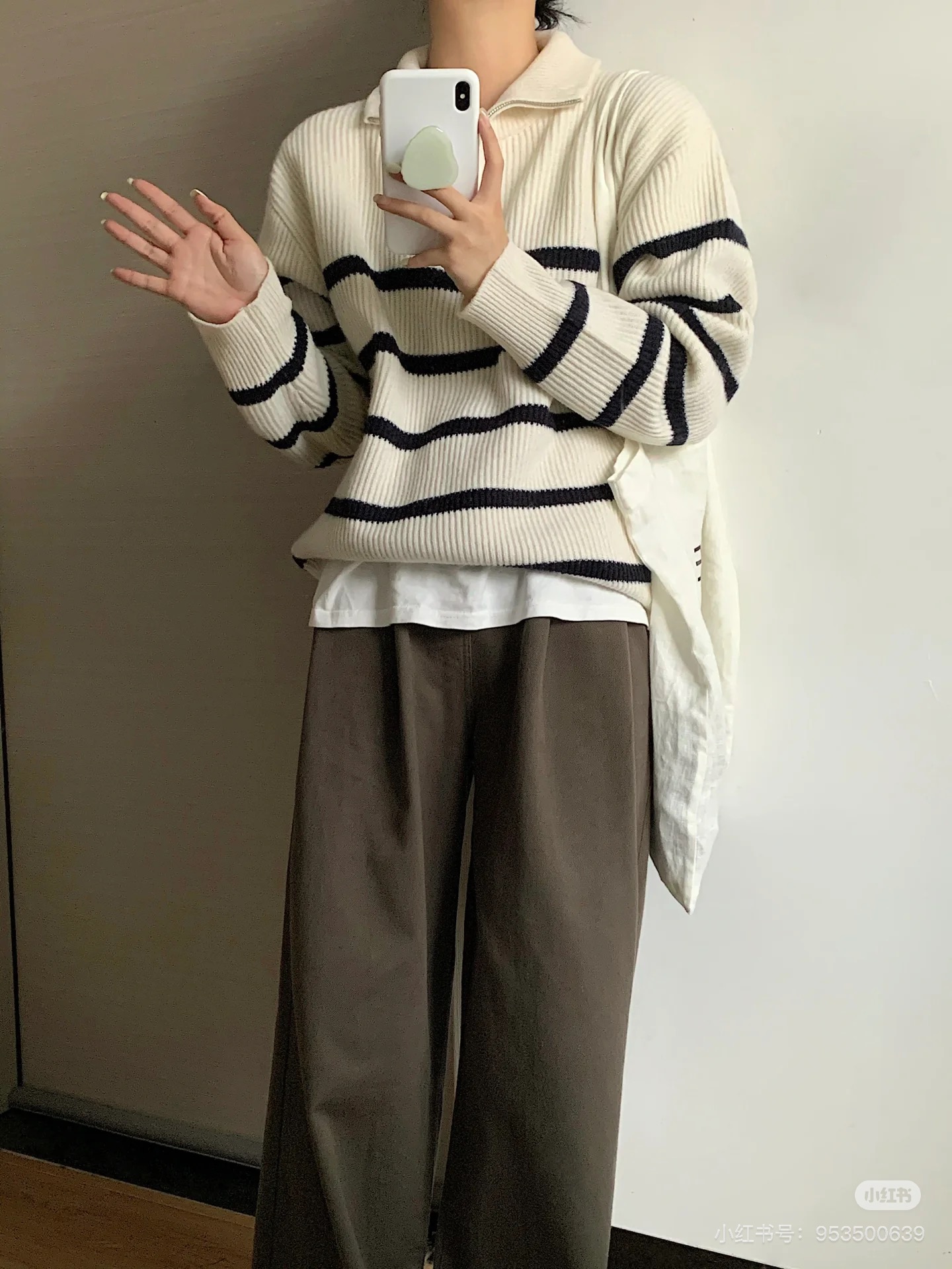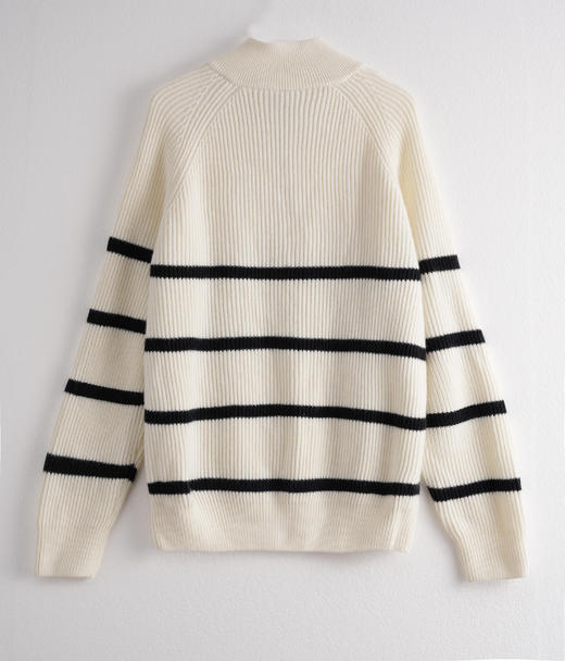 🍁秋风起,保暖要及时!这款半拉链毛衣,绝对是你的衣橱必备神器。美式复古的风格,让你轻松驾驭潮流趋势。黑白底色搭配经典条纹,是永不过时的百搭公式,半拉链翻领设计太加分了,拉高一点是利落的小立领,拉低一点是随性的大翻领,一衣多穿的造型感直接拉满~羊毛混仿面料柔软亲肤。
