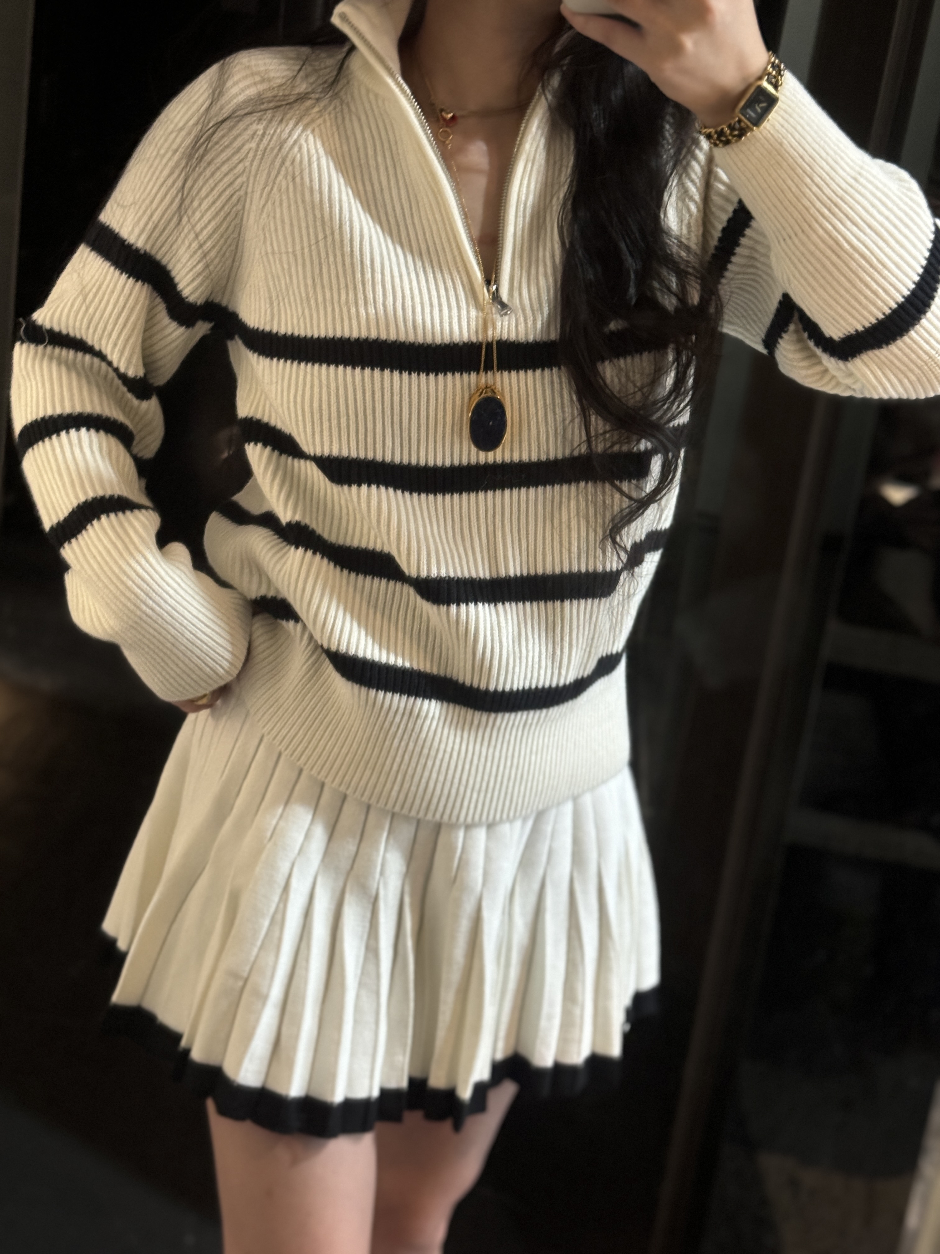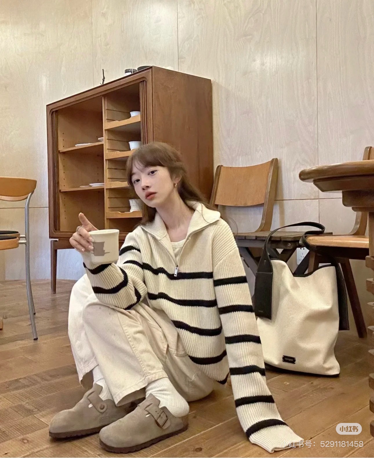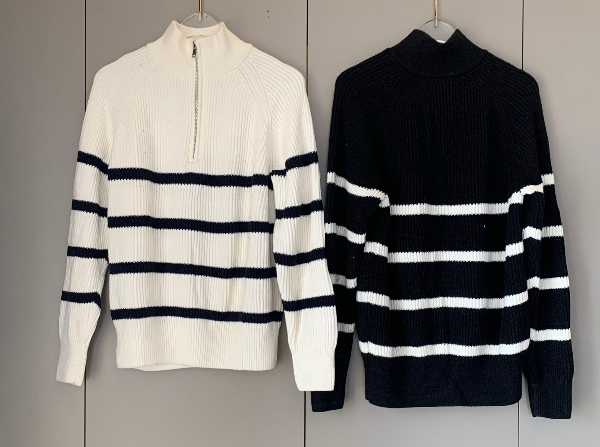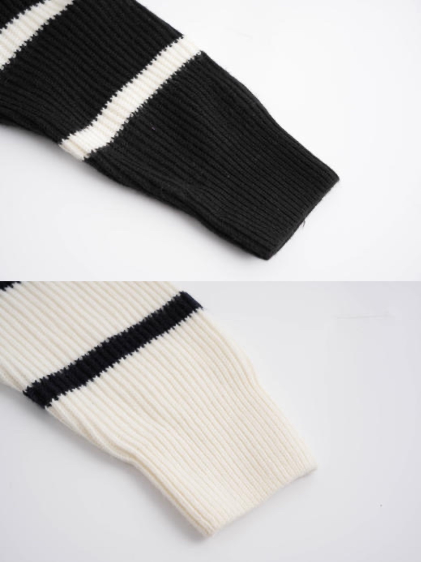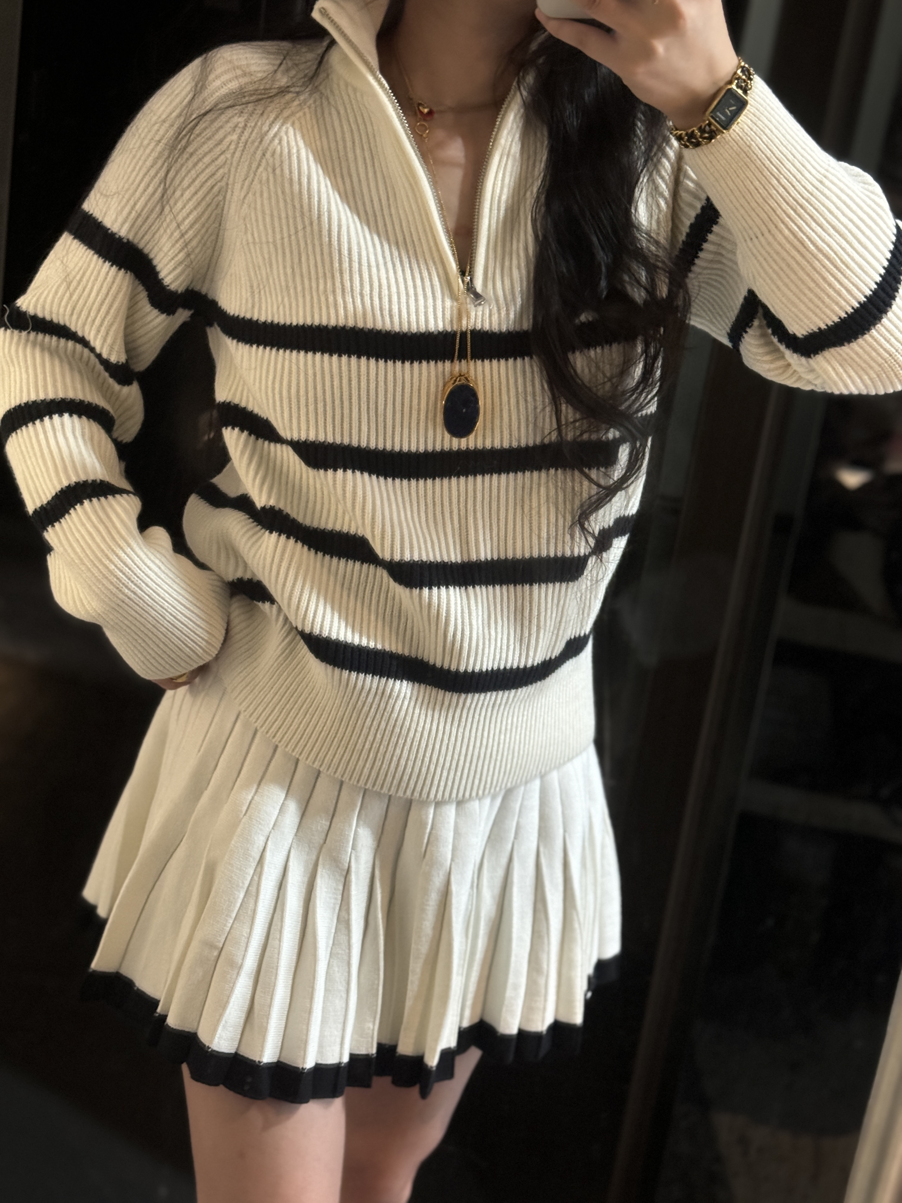 🍁秋风起,保暖要及时!这款半拉链毛衣,绝对是你的衣橱必备神器。美式复古的风格,让你轻松驾驭潮流趋势。黑白底色搭配经典条纹,是永不过时的百搭公式,半拉链翻领设计太加分了,拉高一点是利落的小立领,拉低一点是随性的大翻领,一衣多穿的造型感直接拉满~羊毛混仿面料柔软亲肤。