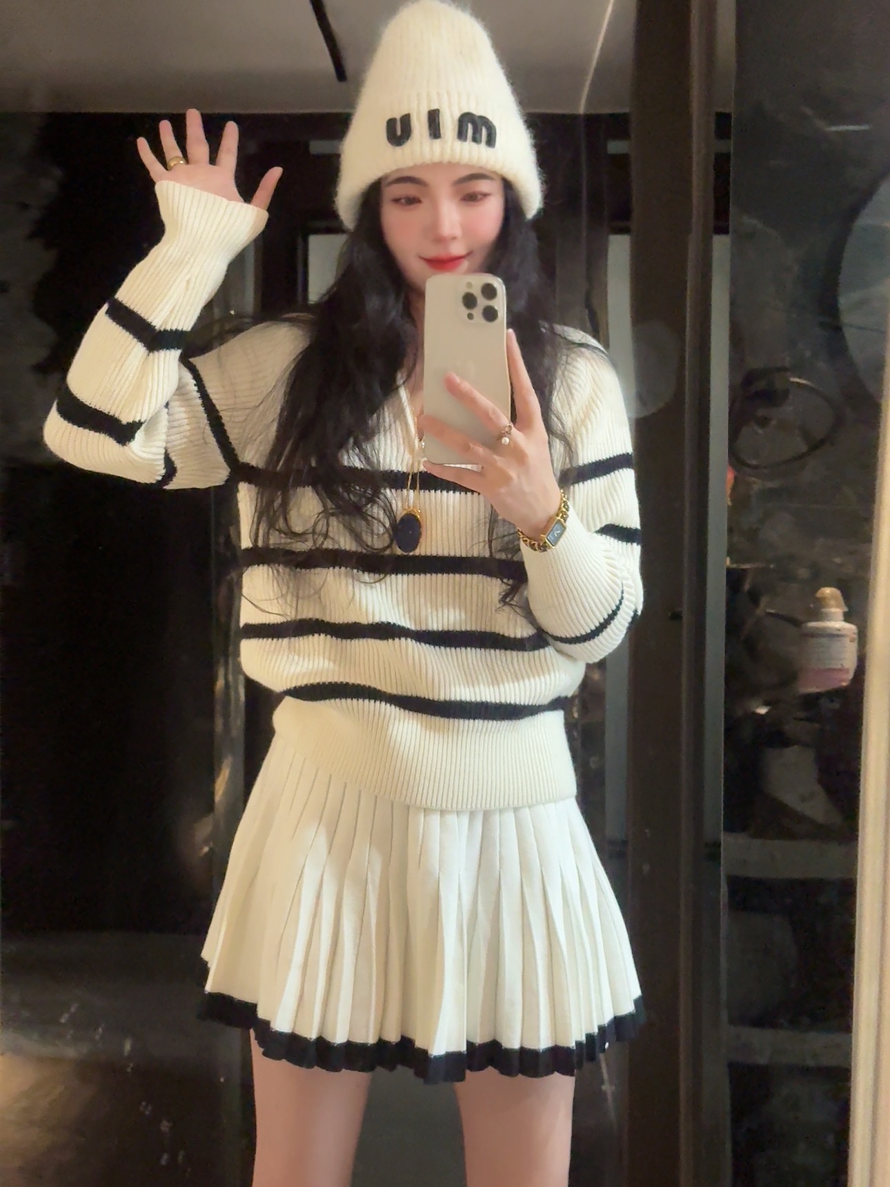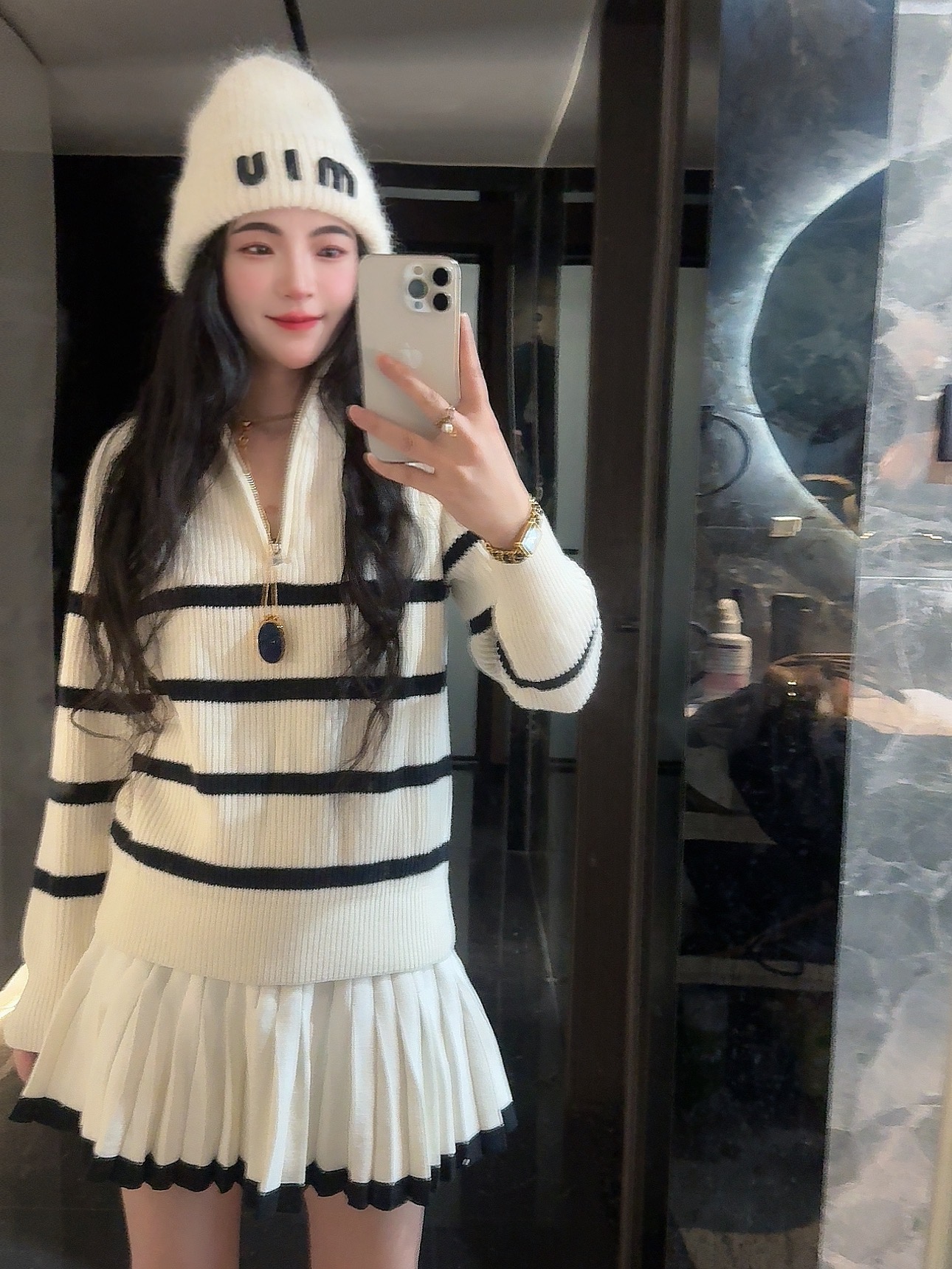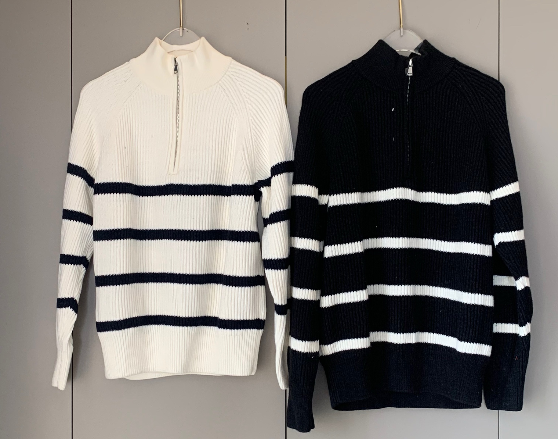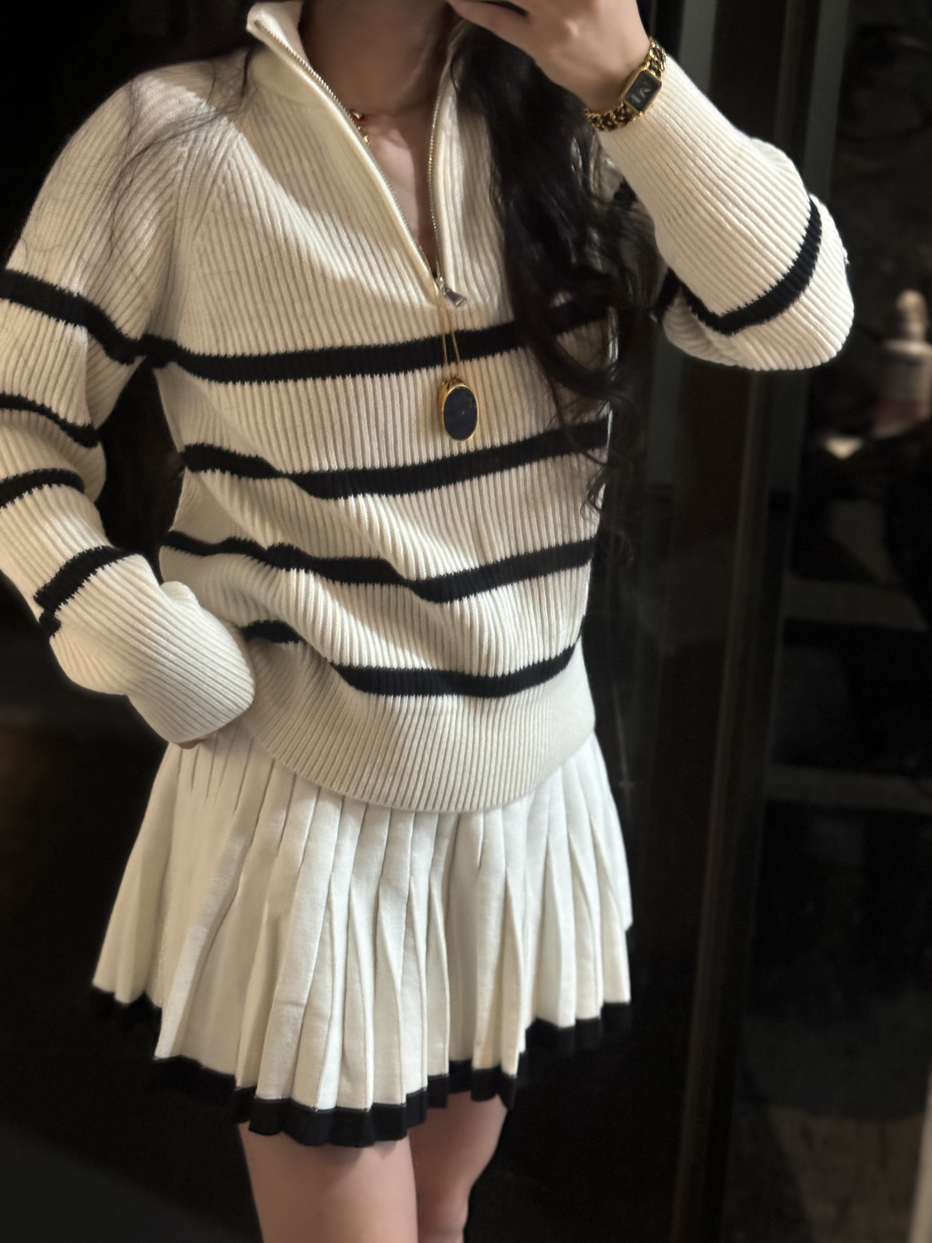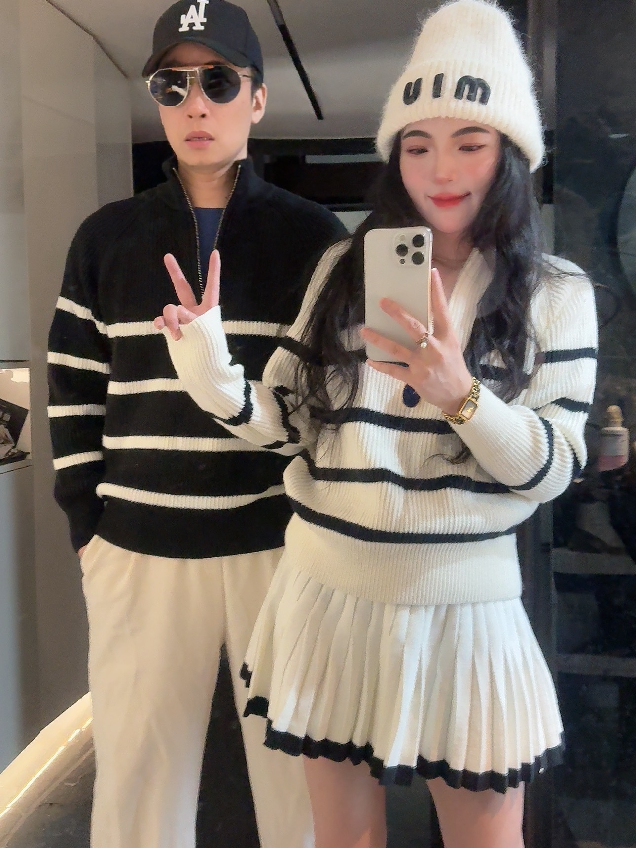 🍁秋风起,保暖要及时!这款半拉链毛衣,绝对是你的衣橱必备神器。美式复古的风格,让你轻松驾驭潮流趋势。黑白底色搭配经典条纹,是永不过时的百搭公式,半拉链翻领设计太加分了,拉高一点是利落的小立领,拉低一点是随性的大翻领,一衣多穿的造型感直接拉满~羊毛混仿面料柔软亲肤。