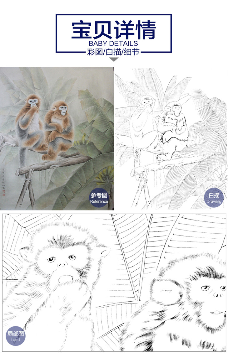 工笔动物白描底稿-李保山-猴《蕉园闲趣》-斗方小品册页-多种白描尺寸可选-EL04