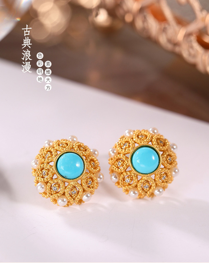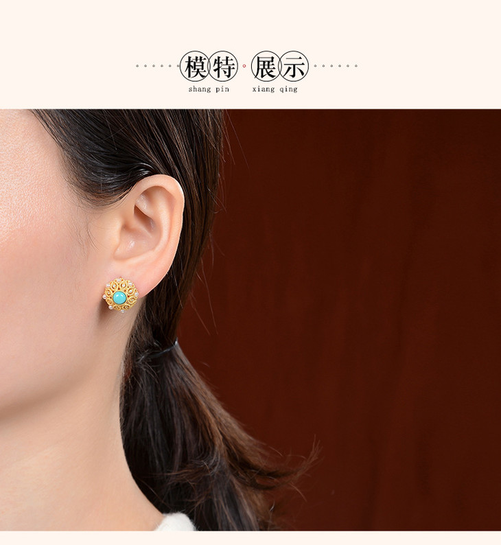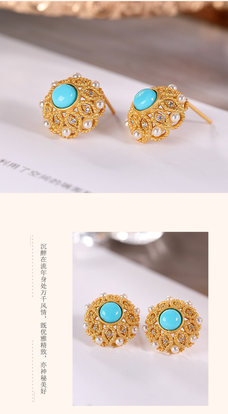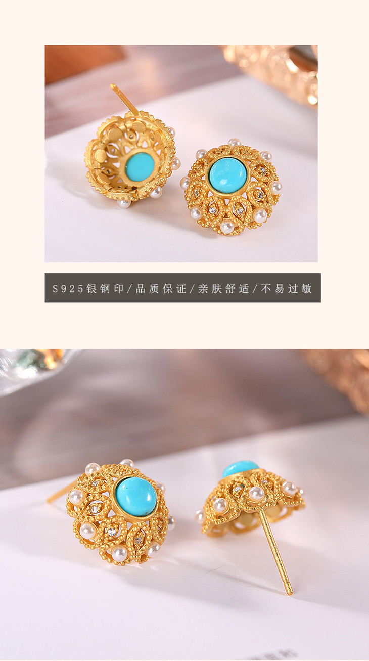 CWSS新款轻奢个性镂空花朵S925纯银镀金绿松石珍珠耳钉