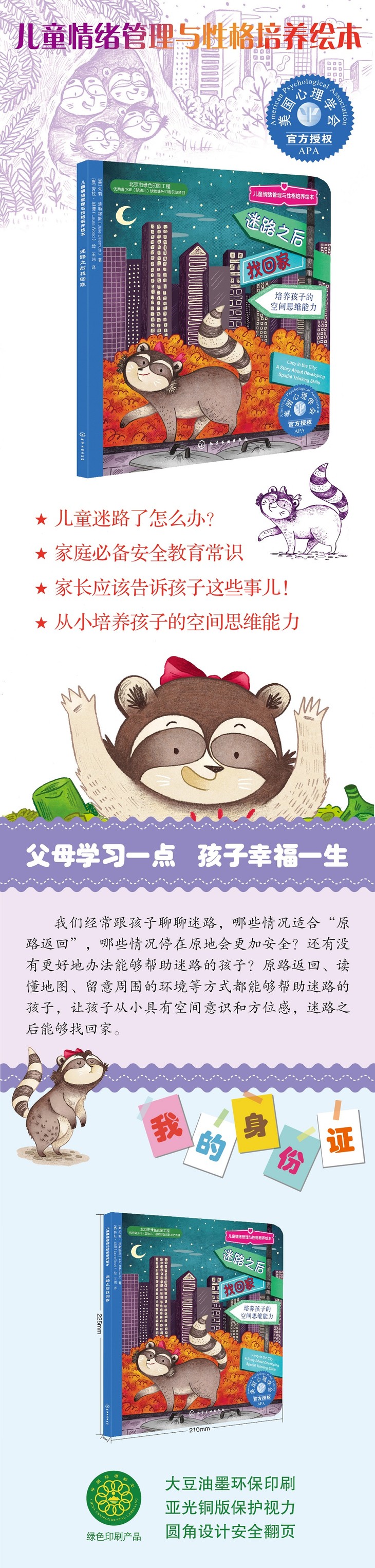 一天晚上,浣熊露西跟着家人一起出了门,他们要去镇上*好的垃圾桶那里。她因为一罐花生酱分了神,与家人失散了。她怎么找到家人和温暖的家呢? 在一个好心的猫头鹰的帮助下,她认清了周围的环境,并试着找到了回去的路,靠自己的力量顺利回到了家! 书后所附《写给父母的话》提供更多空间概念的信息,帮助父母通过提问、游戏、精心设计的活动等方式提高孩子的空间思维能力。