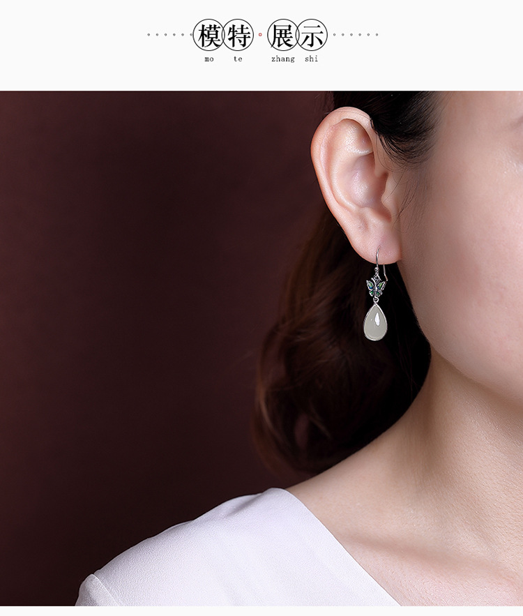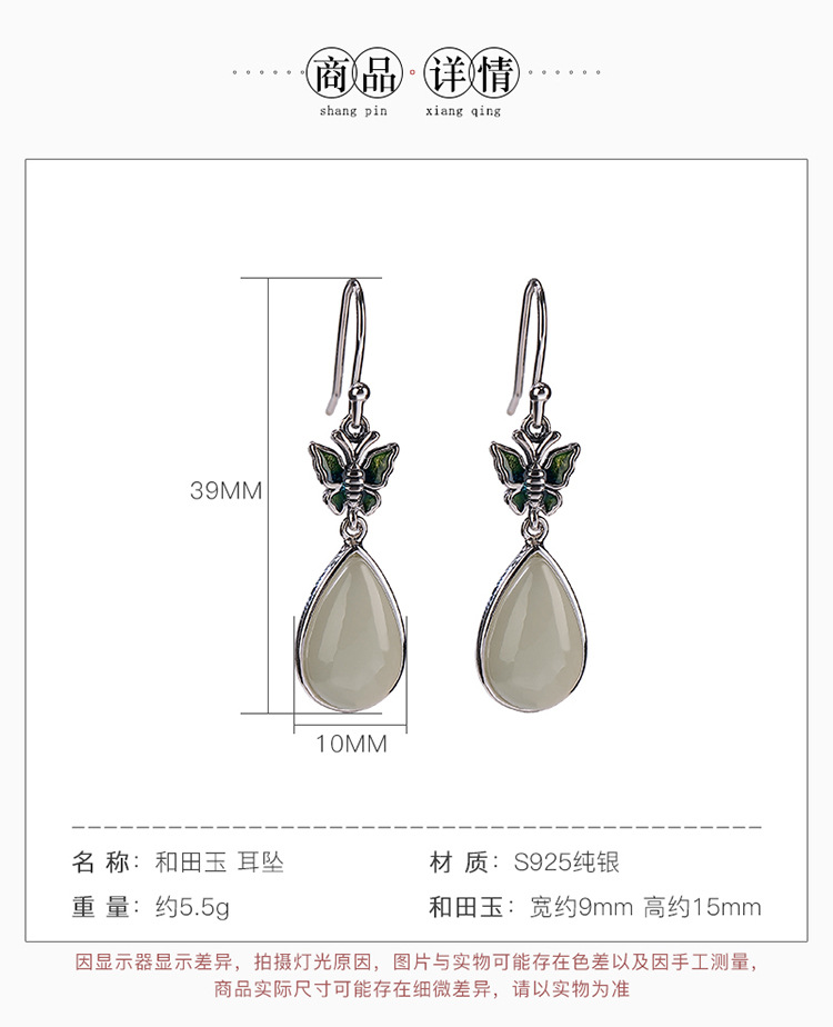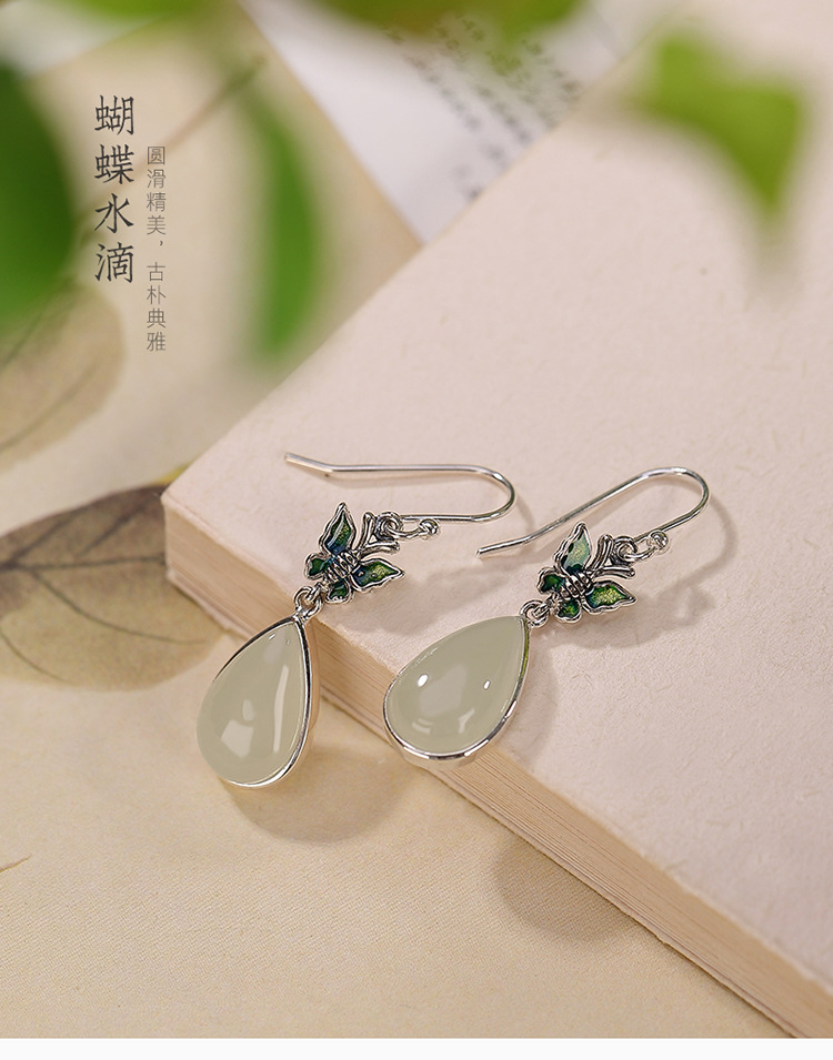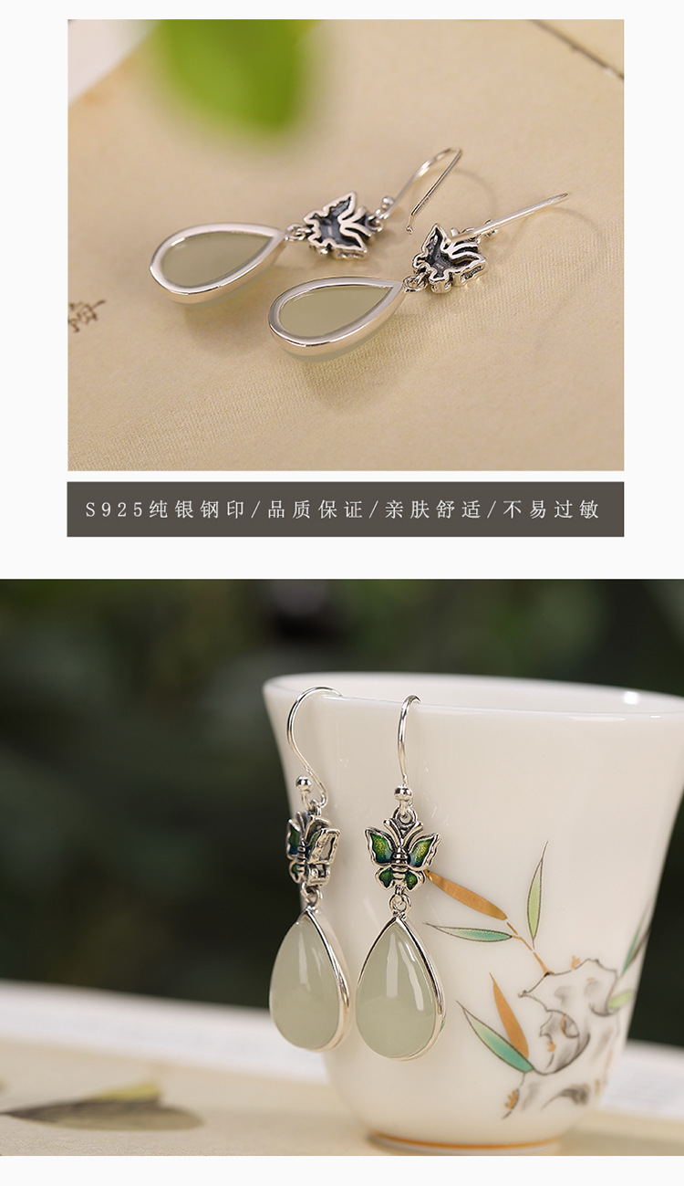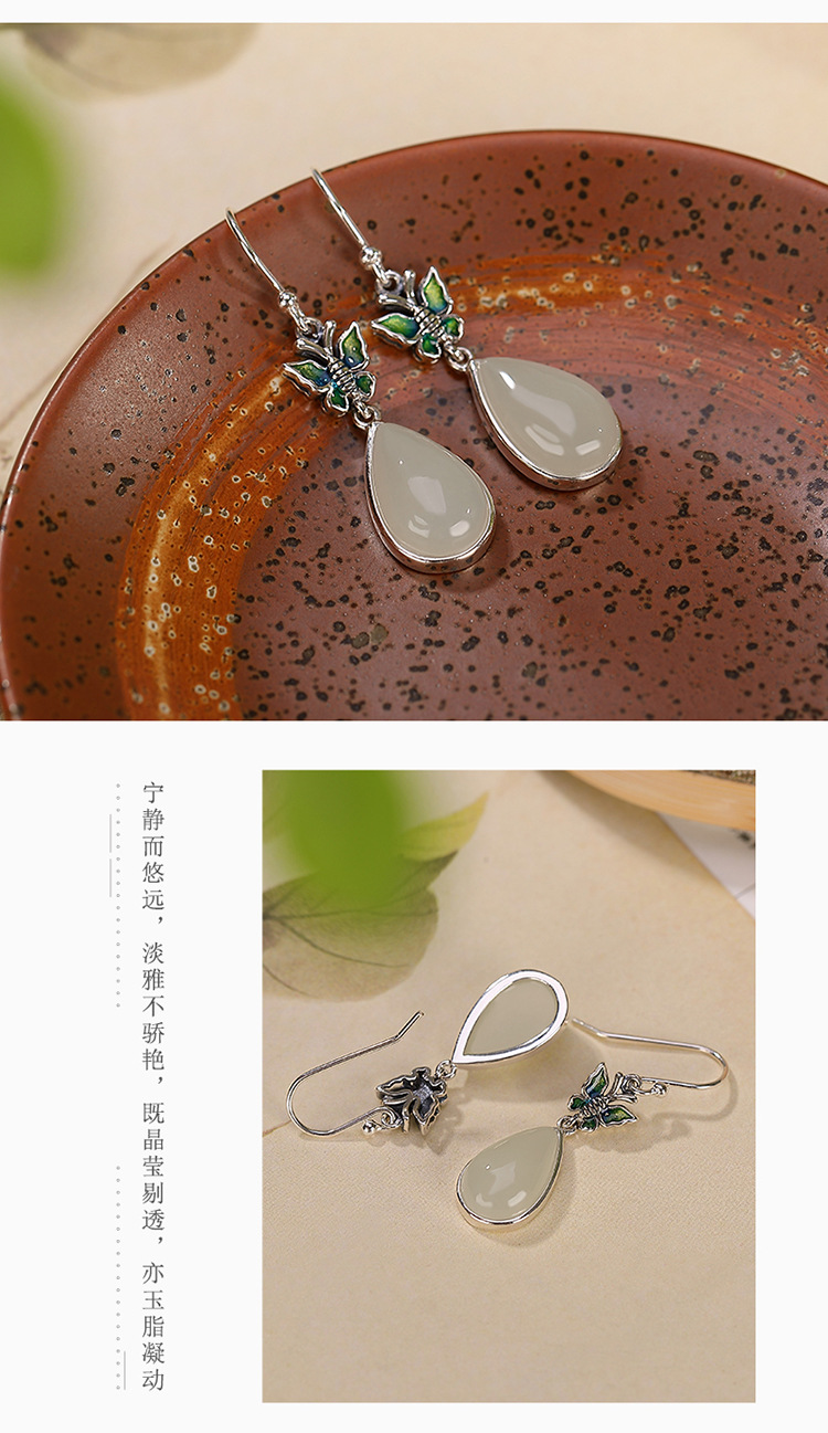 S925纯银,和田玉蝴蝶复古气质水滴形优雅经典款耳钩CW-179