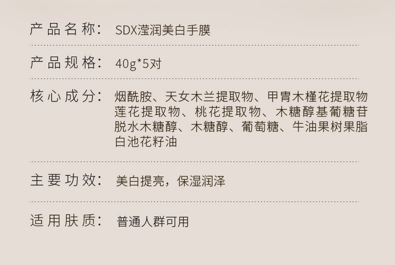 【品名】SDX滢润保湿美白手膜/足膜 改善粗糙 软化角质 40g*5对/盒 【规格】 手膜5对*1盒(赠:SDX滢润美白手膜*1片+SDX银耳多效保湿面膜*2片) 脚膜5对*1盒(赠:SDX滢润美白足膜*1片+SDX银耳多效保湿面膜*2片) 手膜5对*2盒(赠:SDX洋甘菊舒润额头贴*2片+SDX玻色因紧致弹润淡纹贴*2对+SDX多肽淡纹紧致美颈霜10g*2支) 脚膜5对*2盒(赠:SDX洋甘菊舒润额头贴*2片+SDX玻色因紧致弹润淡纹贴*2对+SDX多肽淡纹紧致美颈霜10g*2支) 手膜1盒+脚膜1盒(赠:SDX洋甘菊舒润额头贴*2片+SDX玻色因紧致弹润淡纹贴*2对+SDX多肽淡纹紧致美颈霜10g*2支) 【产地】国内 【保质期】 【发货包装】独立包装 【发货地】河南、广东随机发 【发货快递】中通、邮政随机发 【补邮费地区】新疆、西藏、青海+15元 【发货时效】48-72小时,周末节假日顺延 |