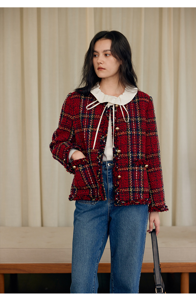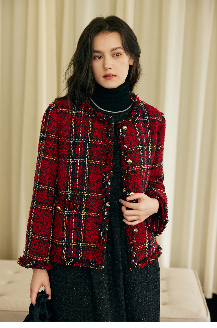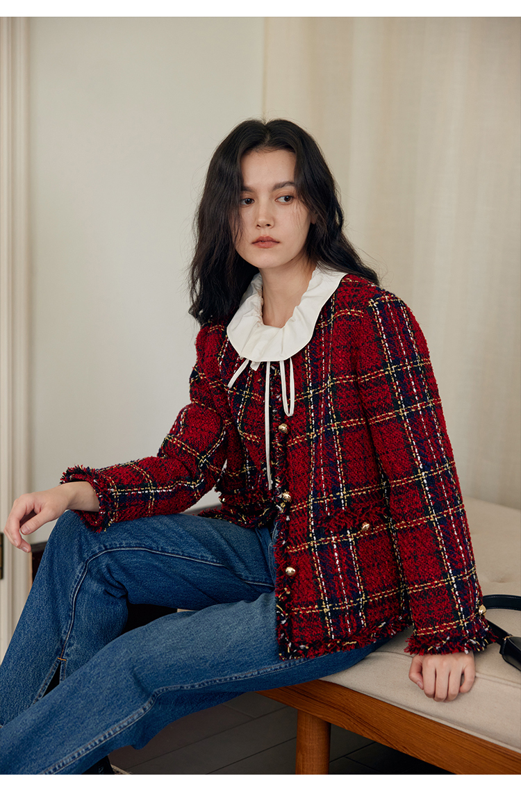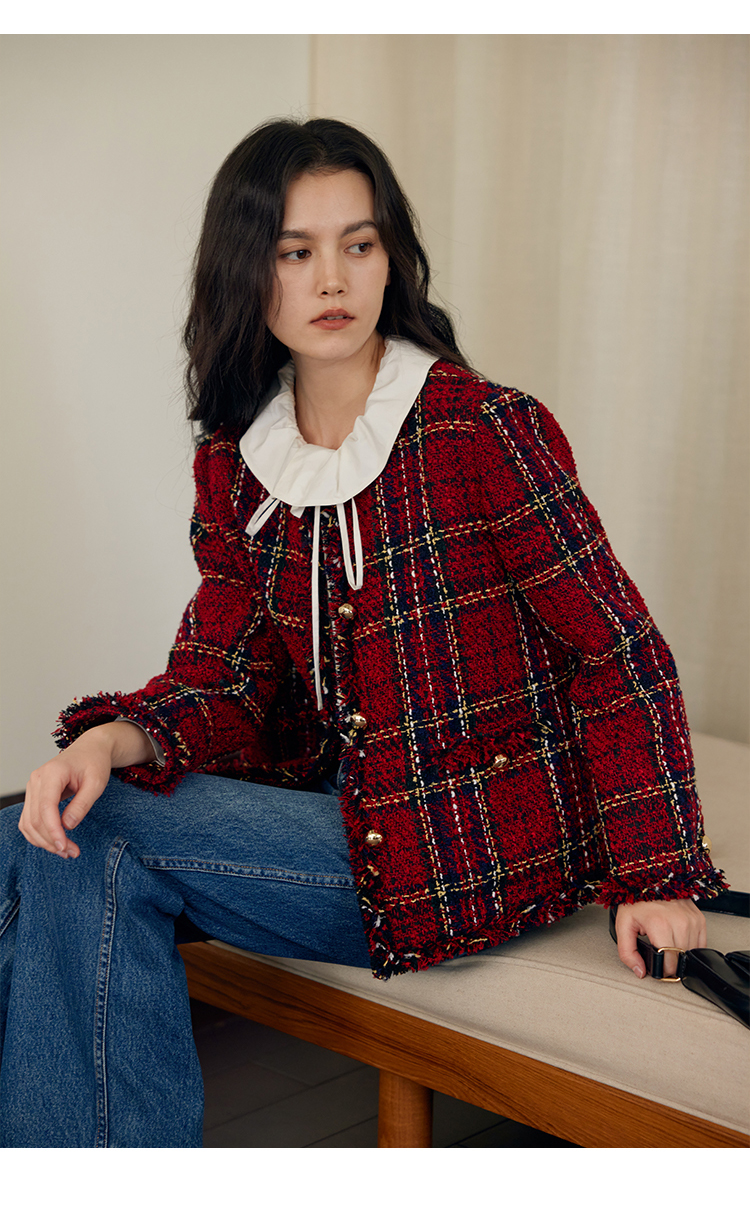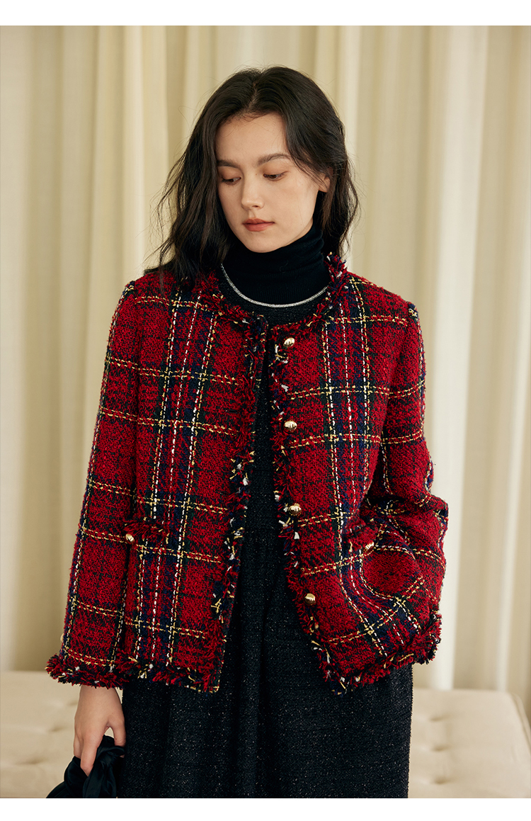 HeyDress格纹毛边小香风外套女冬季宽松显瘦经典圣诞红色厚款上衣
