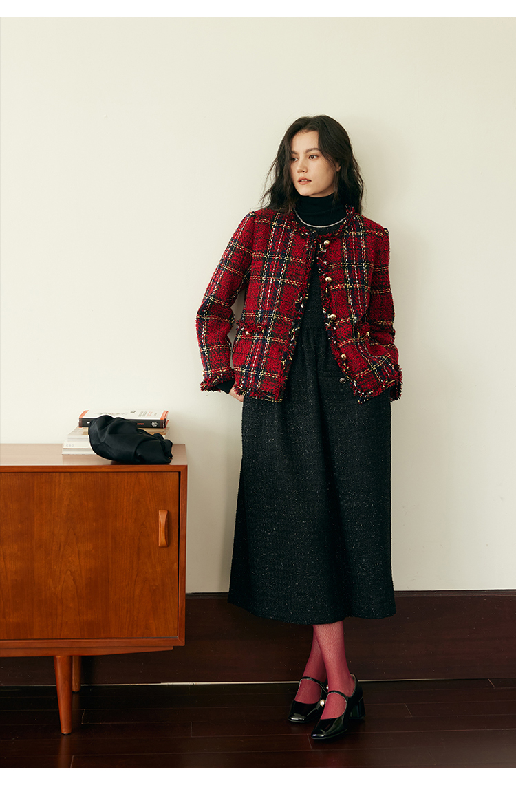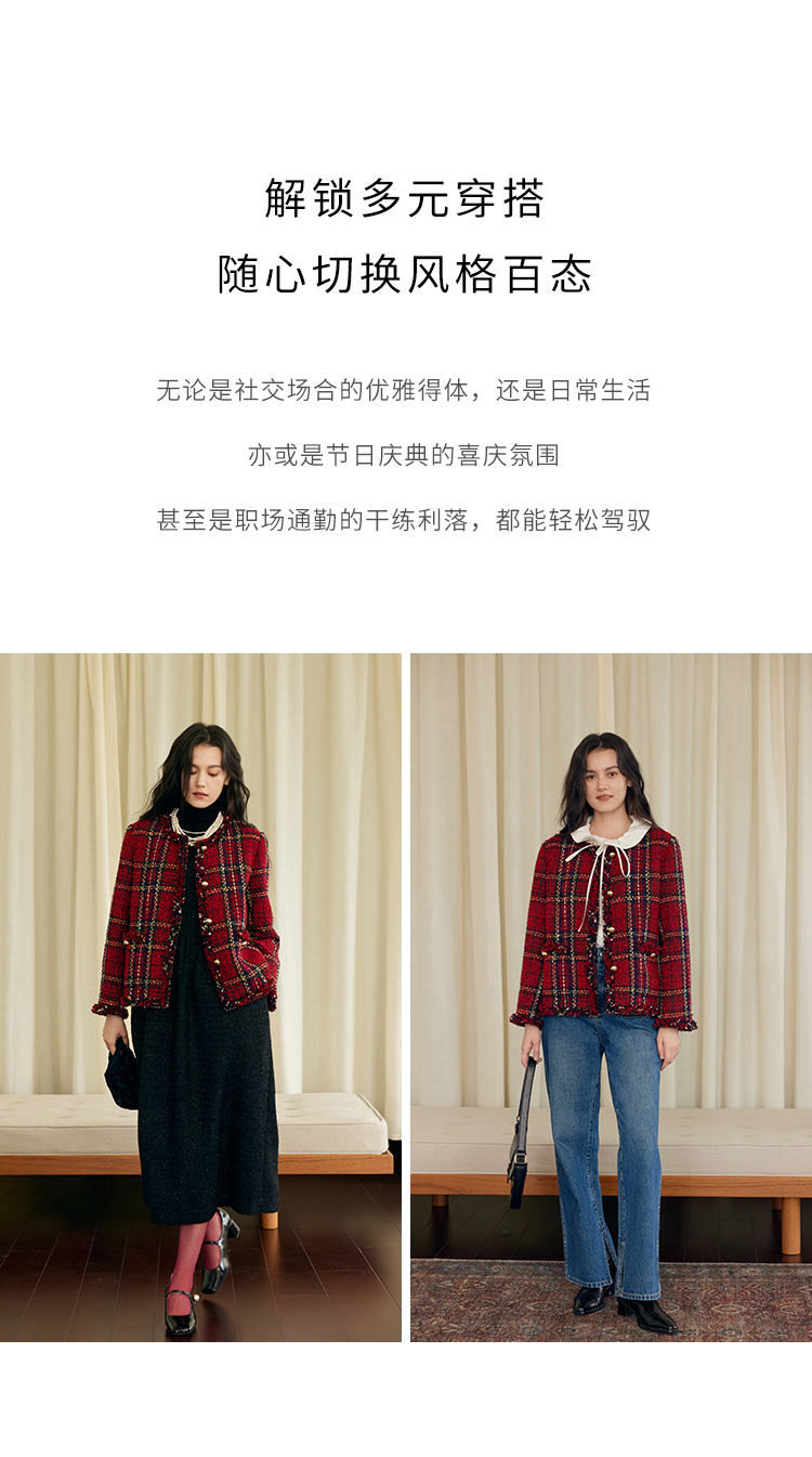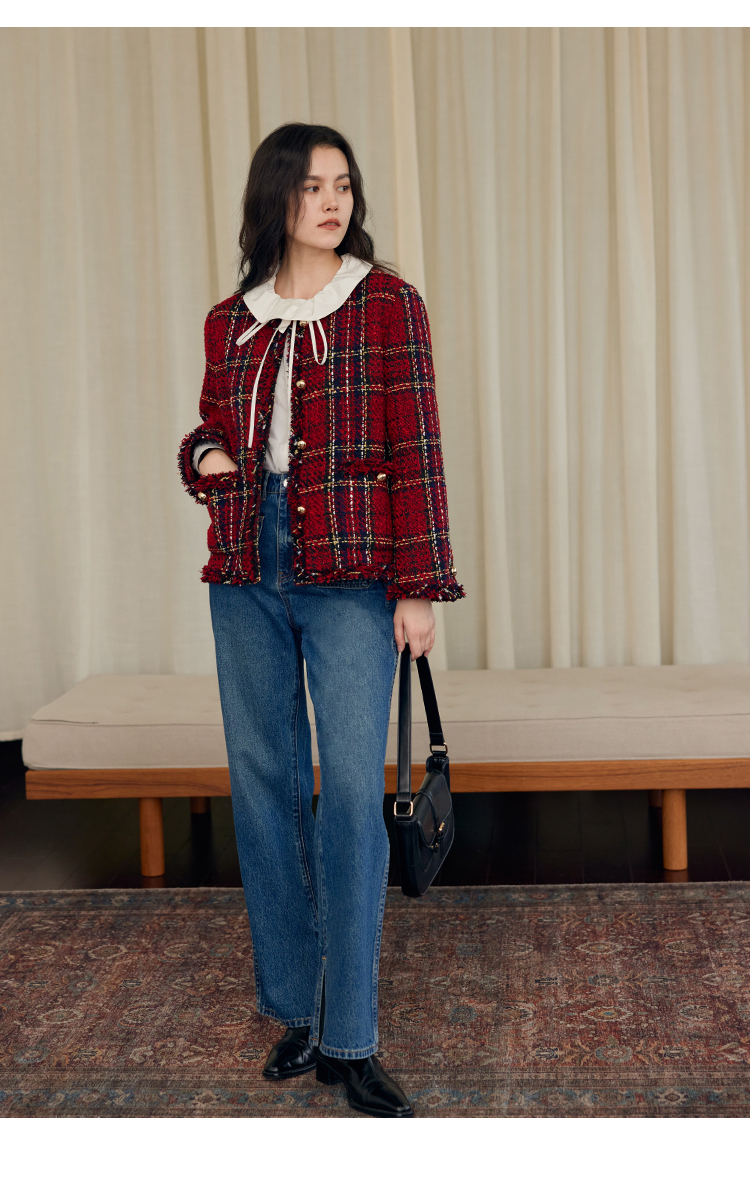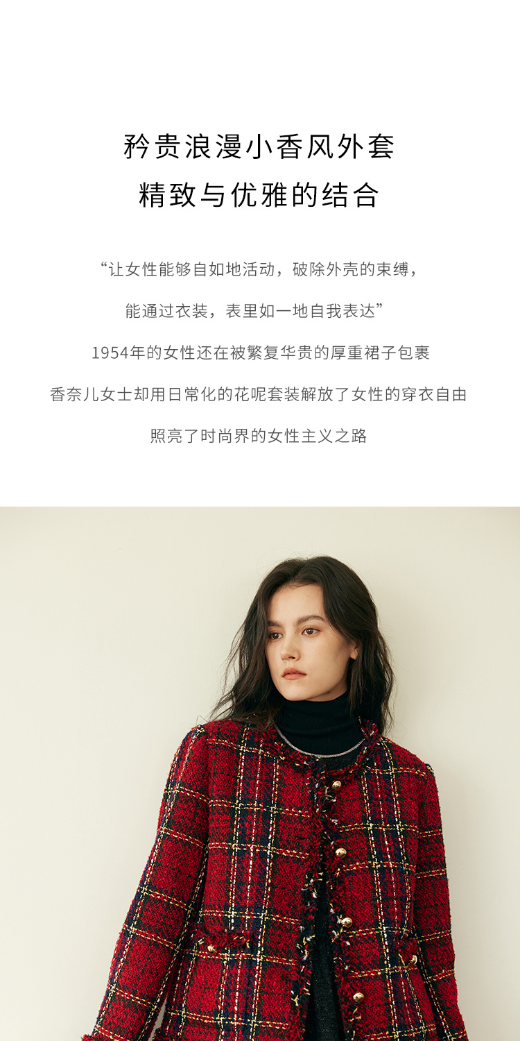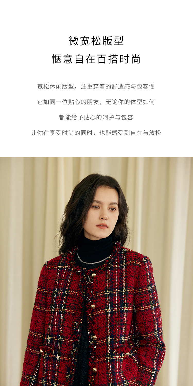 HeyDress格纹毛边小香风外套女冬季宽松显瘦经典圣诞红色厚款上衣