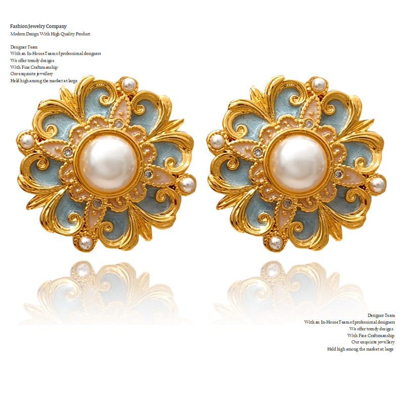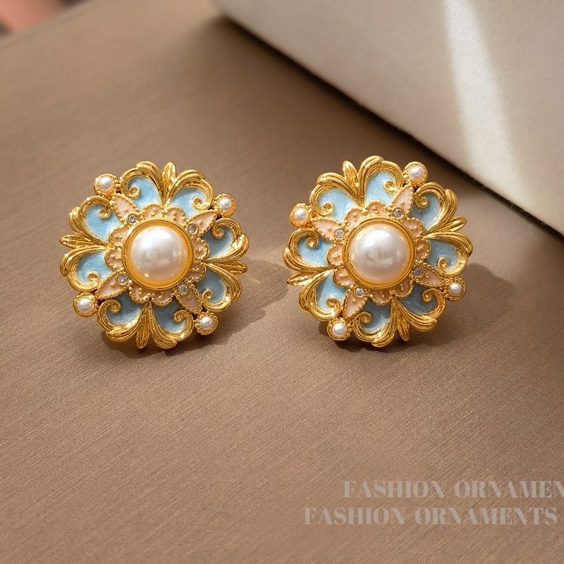丁摩 原创S925银针法式复古花朵耳钉珍珠耳环高级感蓝色耳饰品5ZF-2493