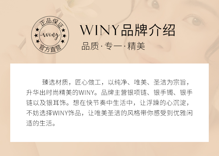 唯一winy是国内网络饰品品牌的先行者。 创立初衷源于对亲情、爱情、友情的珍惜唯一,用心做好每一件饰品为您守护人生中如珠宝般珍贵动人的那些时刻那怕岁月流转,唯爱始终如一。