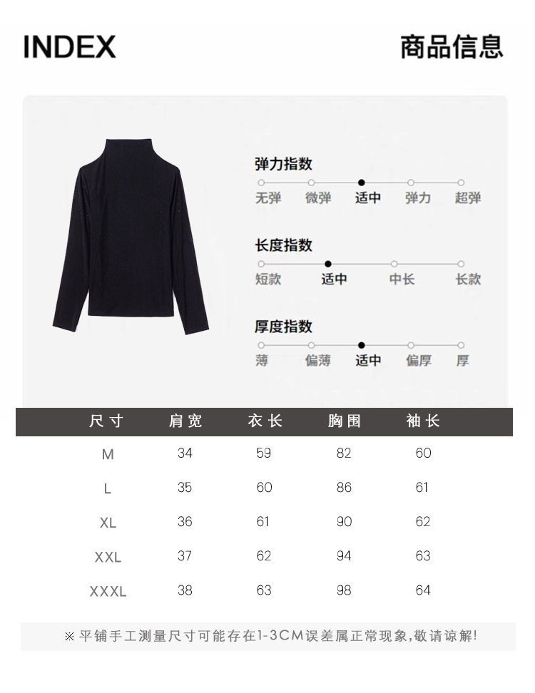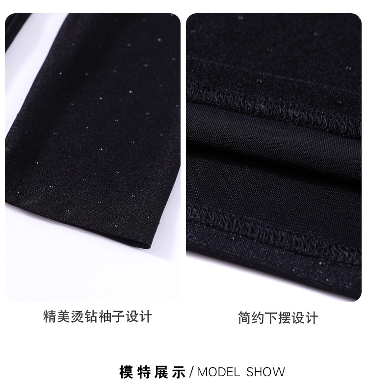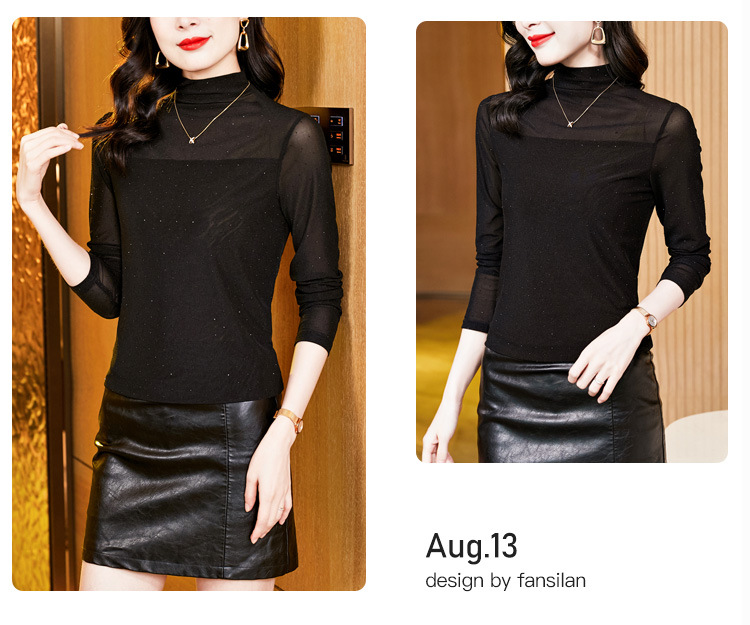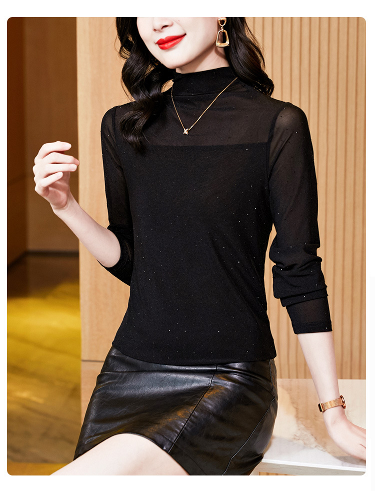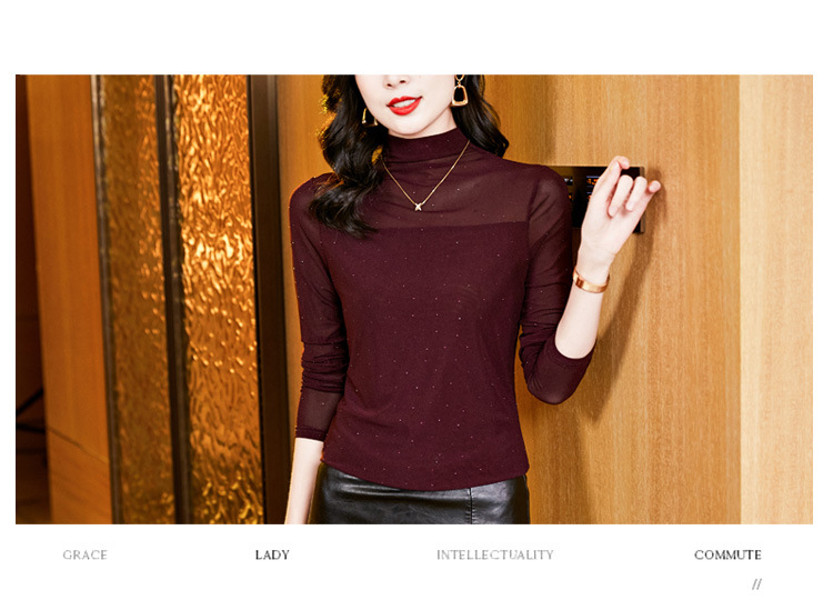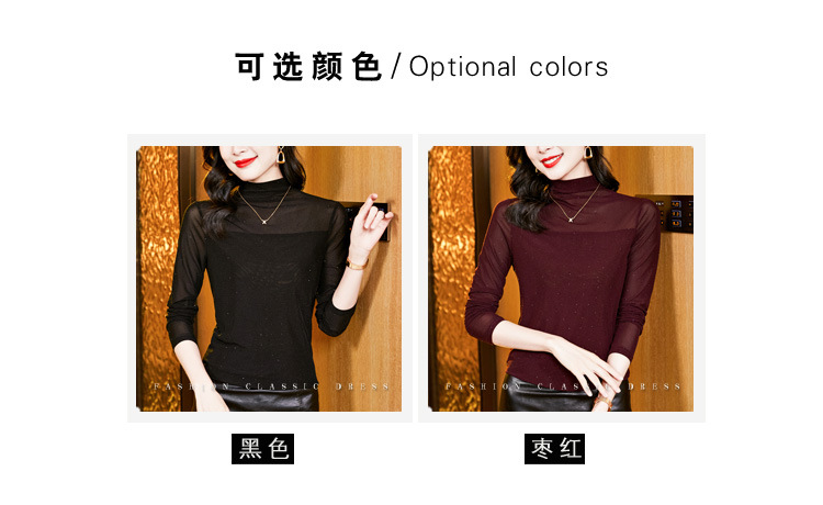 KQL E37M2936洋气纯色烫钻高领长袖网纱打底衫修身显瘦T恤