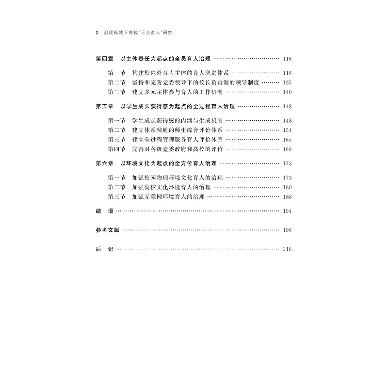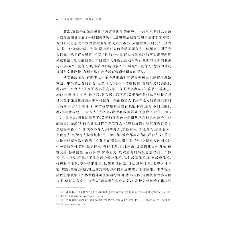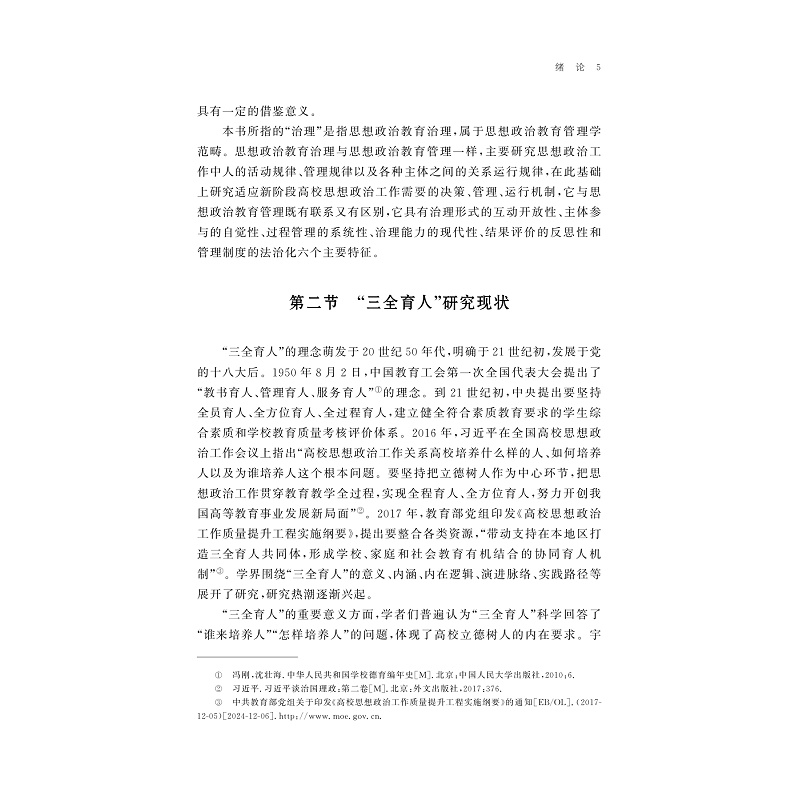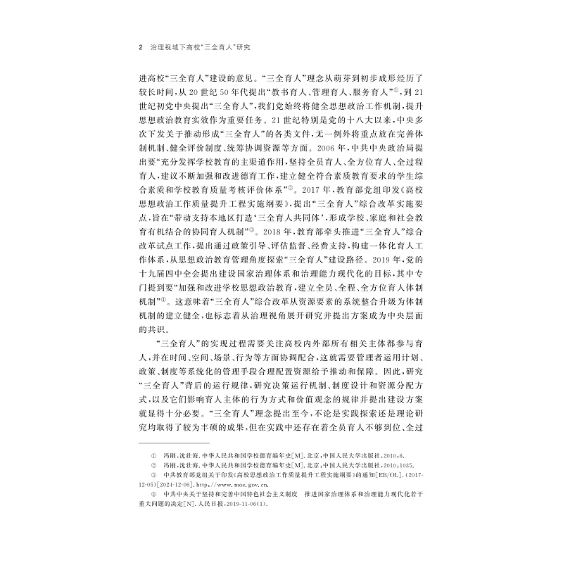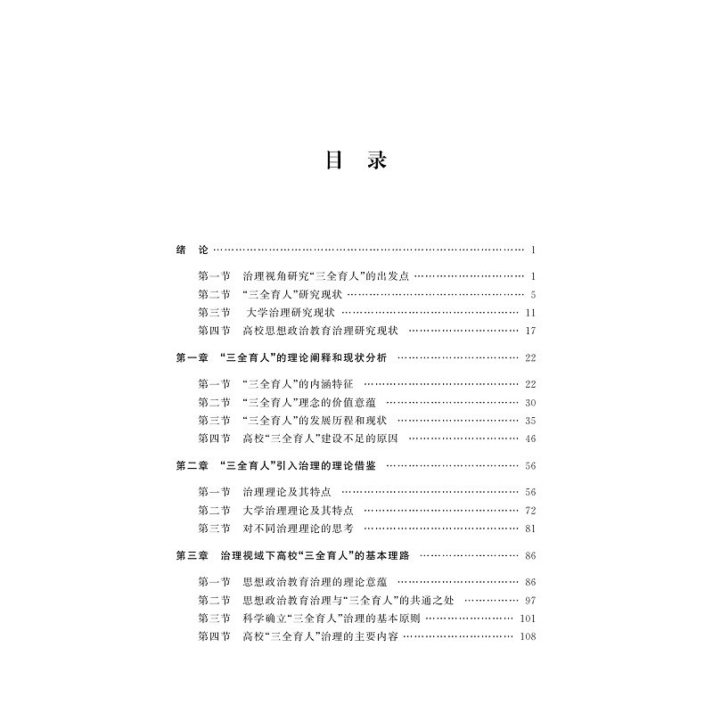 本书为作者的博士学位论文。从治理的视角来考察“三全育人”,提出当前高校“三全育人”格局难以形成的原因主要有三点:一是当前的研究和实践没有抓住“三全育人”是一个育人共同体的本质,应从个体的价值观念、利益驱动和行为表现三者一致性来把握;二是“三全育人”是理想的结果而不是手段,而要研究其背后的管理运行规律,打破体系必来、改革评价制度;三是当前各类评价制度还未形成以学生成长为中心的技术导向,存在技术伦理与价值导向分离的问题。最后,本书对“三全育人”的内涵、建设原则和治理视域下的路径提出了较有借鉴价值的建议。