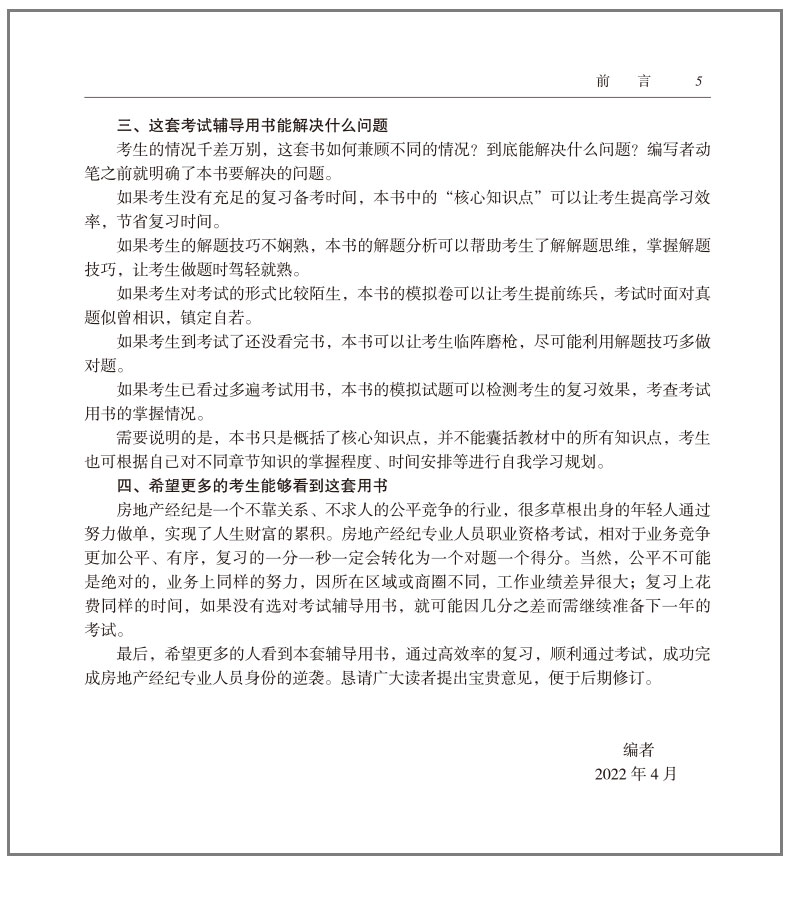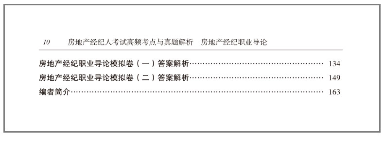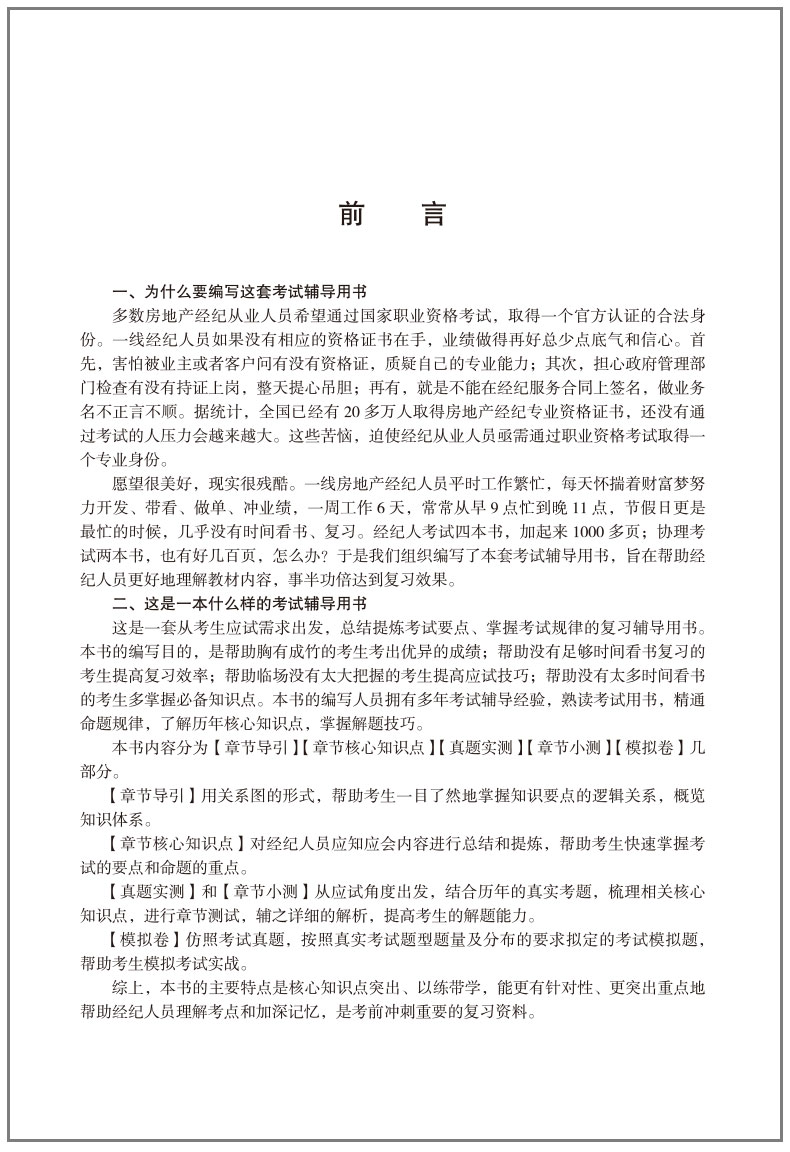 围绕《房地产经纪职业导论》九章的考核内容,本书共提取了常考核心知识点60个,每个知识点后附有例题以辅助理解;每章之后附有《真题演练》和《章节小测》,其中,《真题演练》主要是汇总了2020年、2021年的章节考题,《章节小测》也可以以练带学、加深学习记忆;书籍最后依据房地产经纪人协理老师的考题形式、数量、考点分布,附加了两套《综合能力模拟卷》,既便于考生学习理解,也便于考生熟悉试卷及考试形式。综上,本书的主要特点是核心考点突出、以练带学,能更有针对性、突出重点地辅助经纪人理解考点和加深记忆,是考前冲刺重要的复习资料。