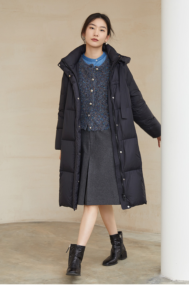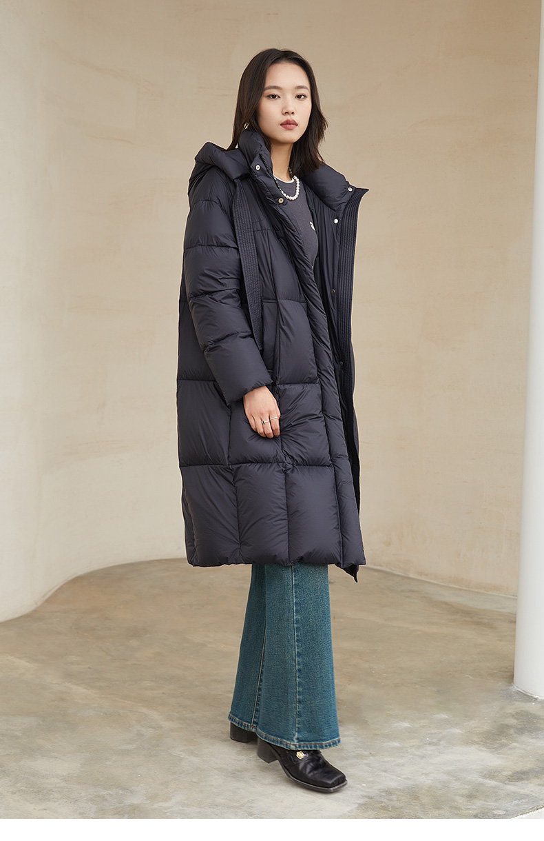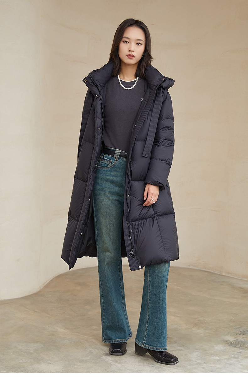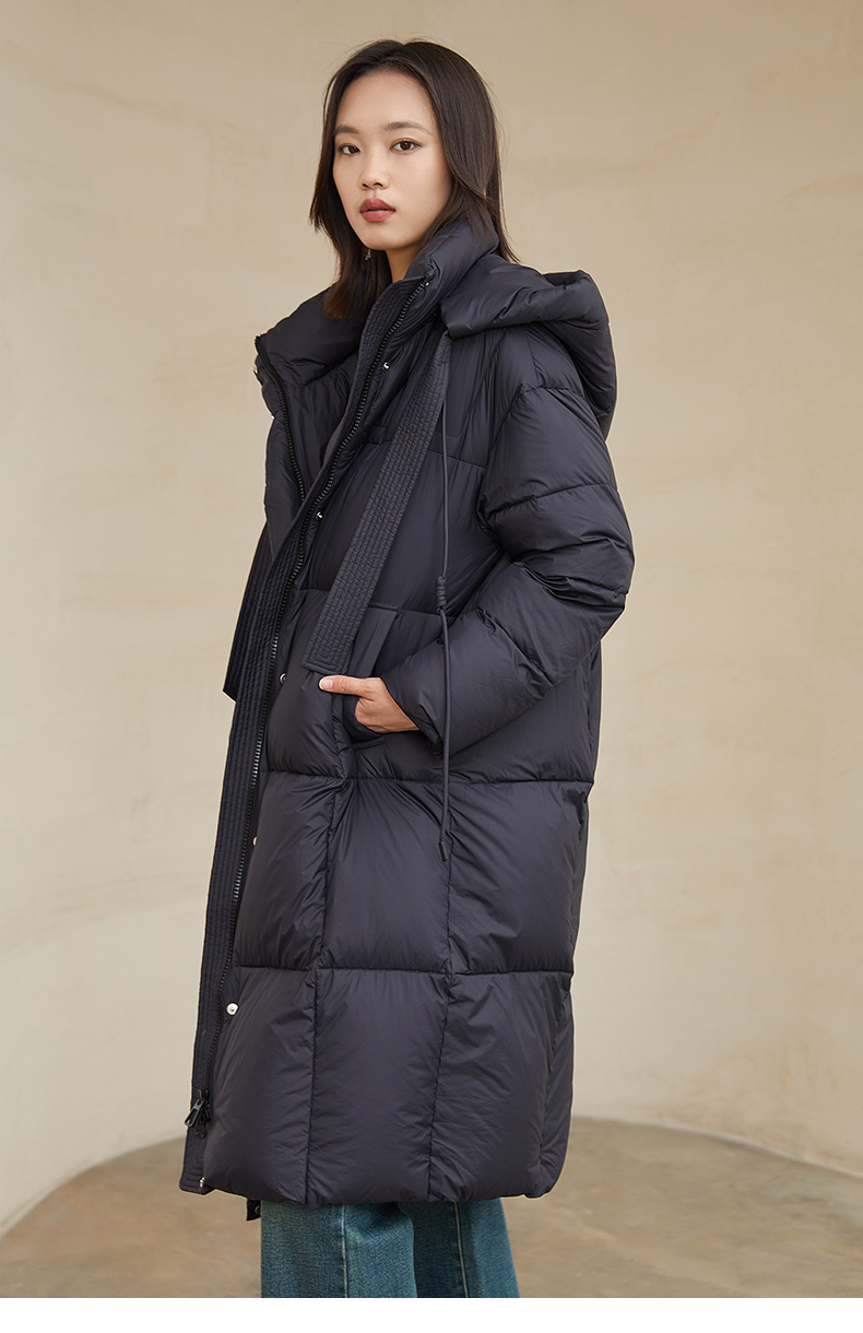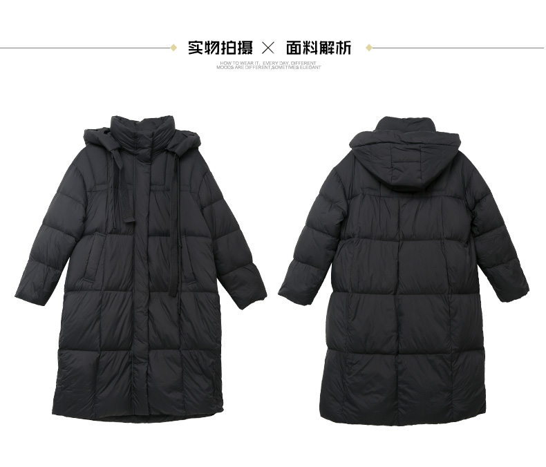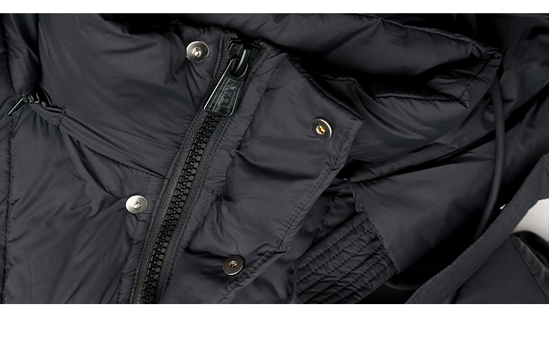 冬季新款黑色连帽羽绒服女中长款宽松保暖白鸭绒系带收腰过膝外套