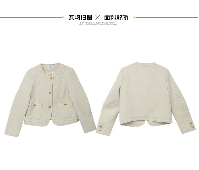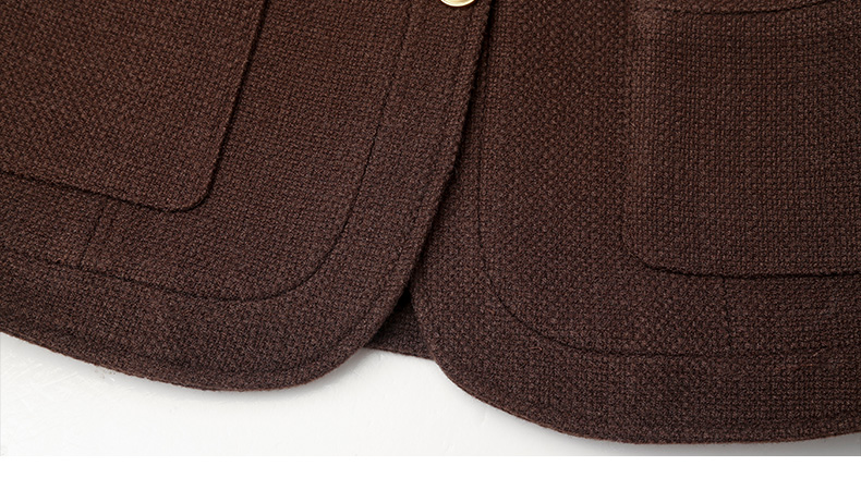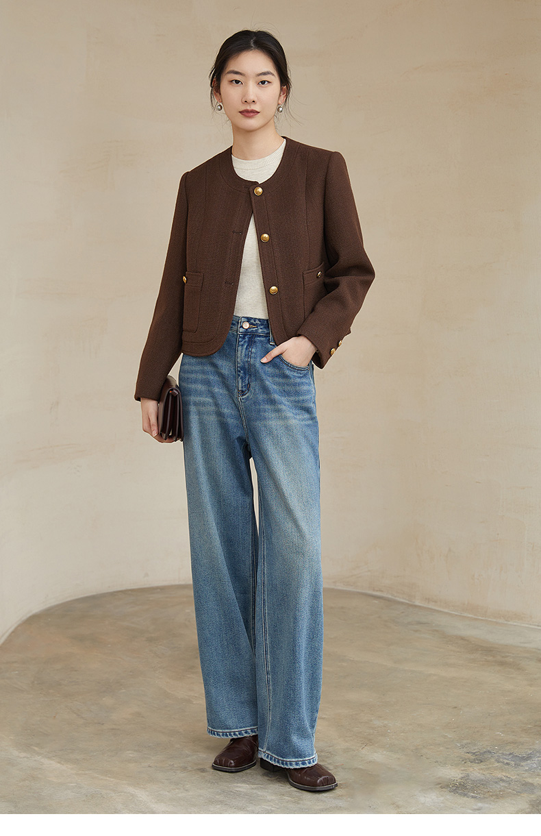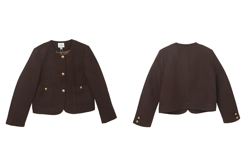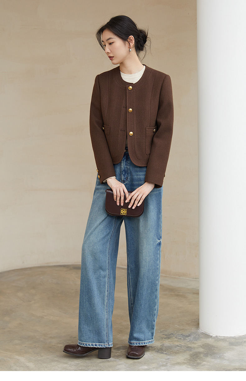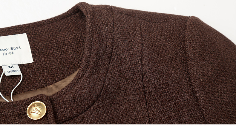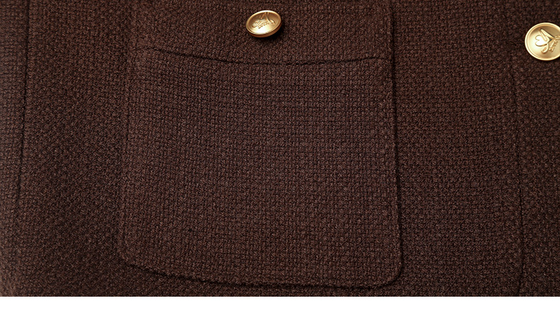 复古棕色小香风短款外套女 圆领金属扣口袋设计 秋季气质百搭上衣