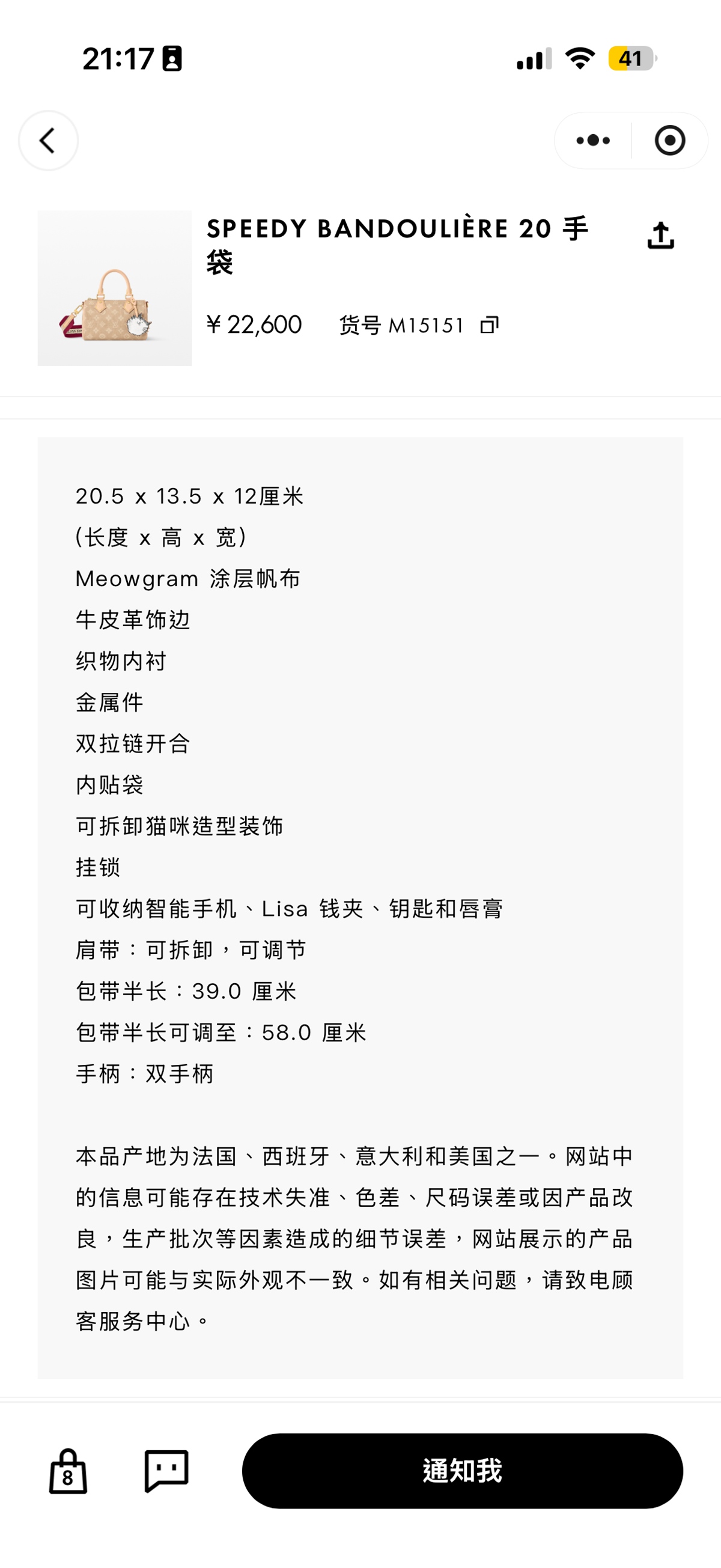 LV猫咪联名SPEEDY BANDOULIÈRE 20 手袋。全原材料。已过检。大大方方背进专柜360度细细对比即可。柜价22600。