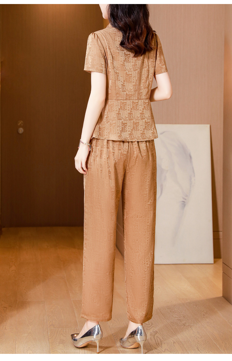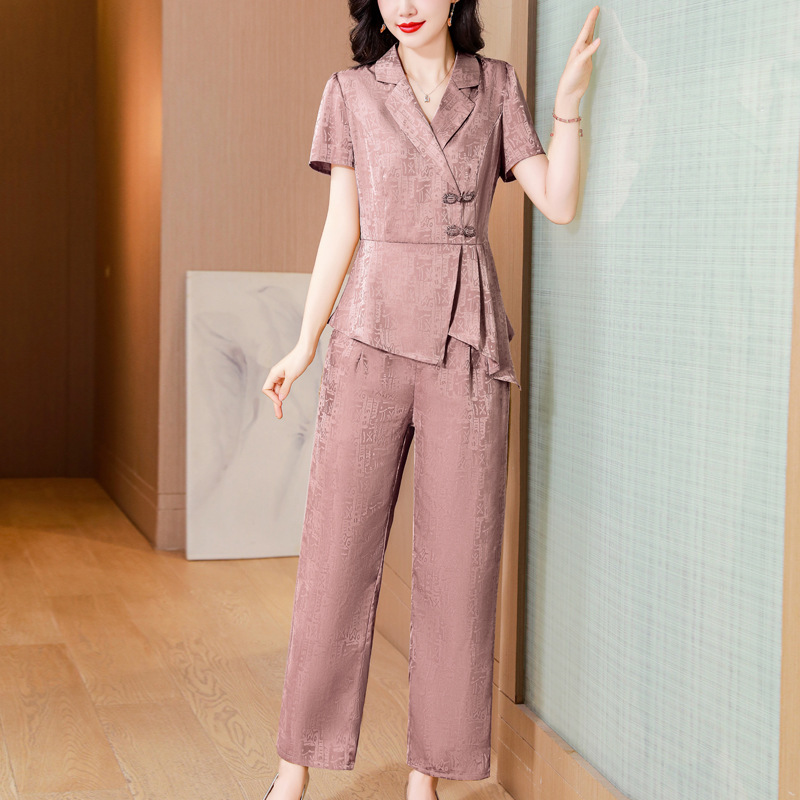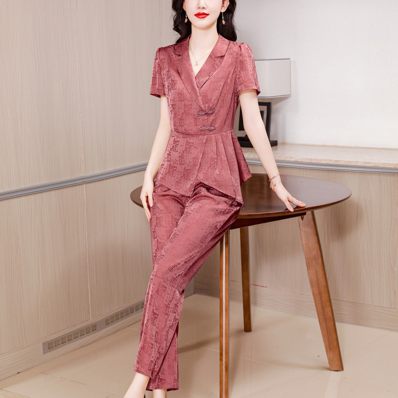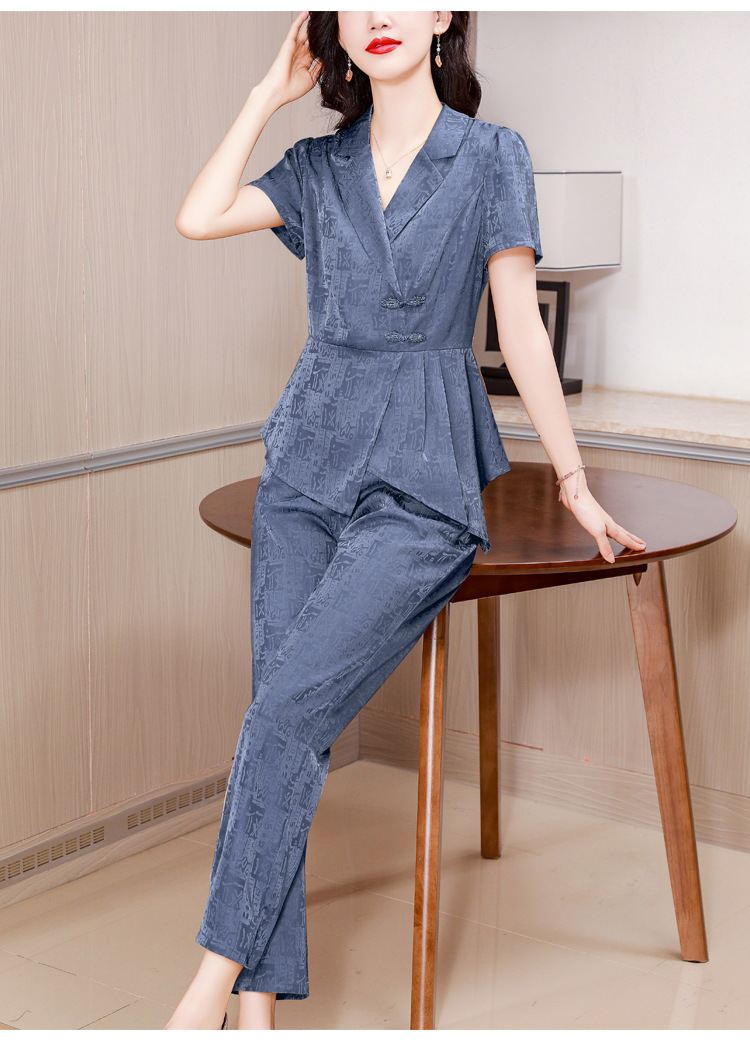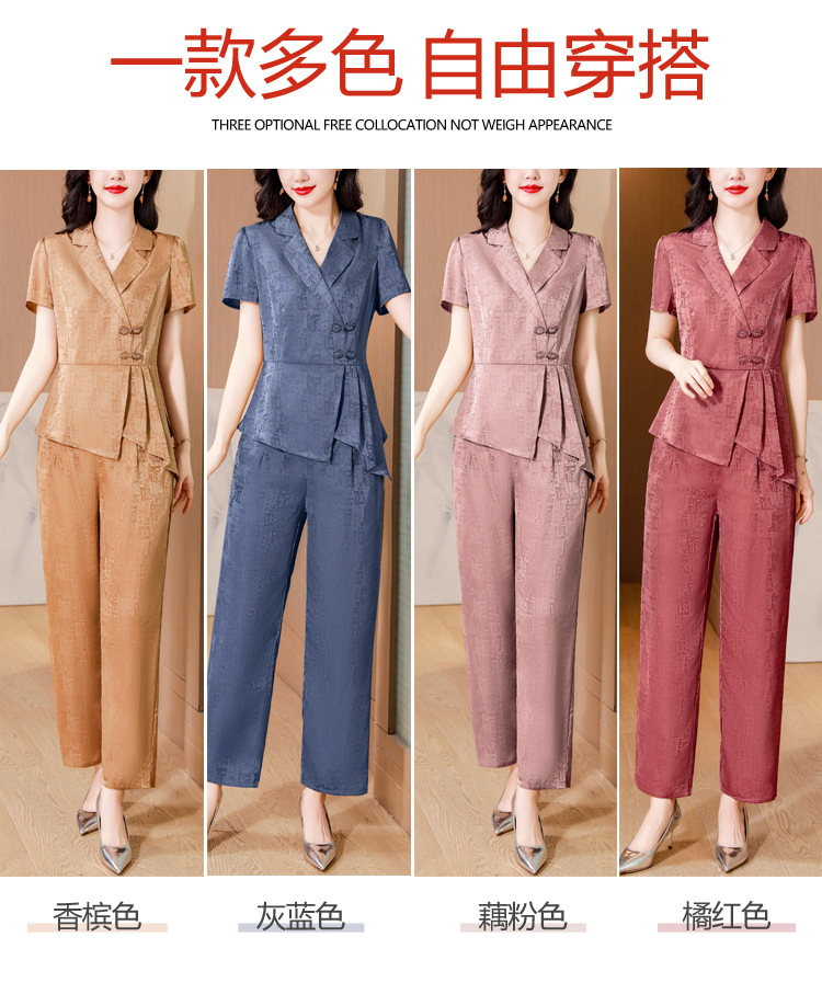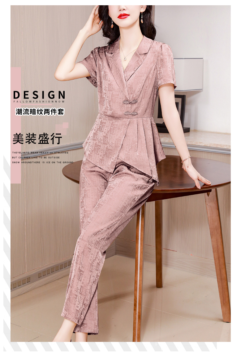 AHMqyfs8917 复古气质西装领短袖上衣阔腿裤两件套女2024夏季新款时尚古提花套装 商品图2
