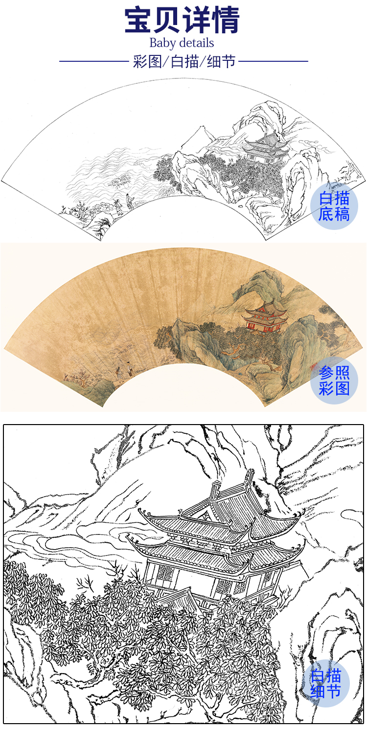 工笔画白描底稿 扇面小品 明 仇英 山水图 SR10