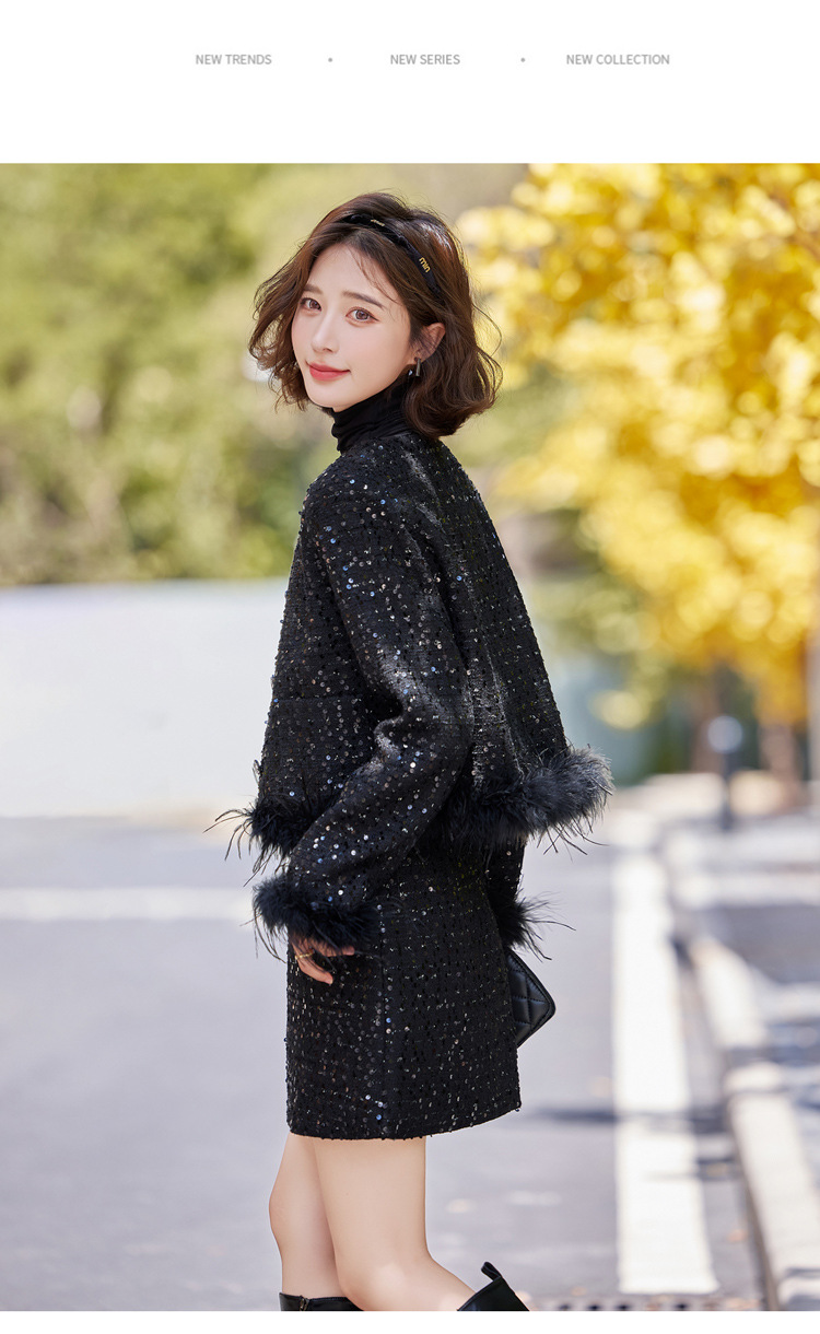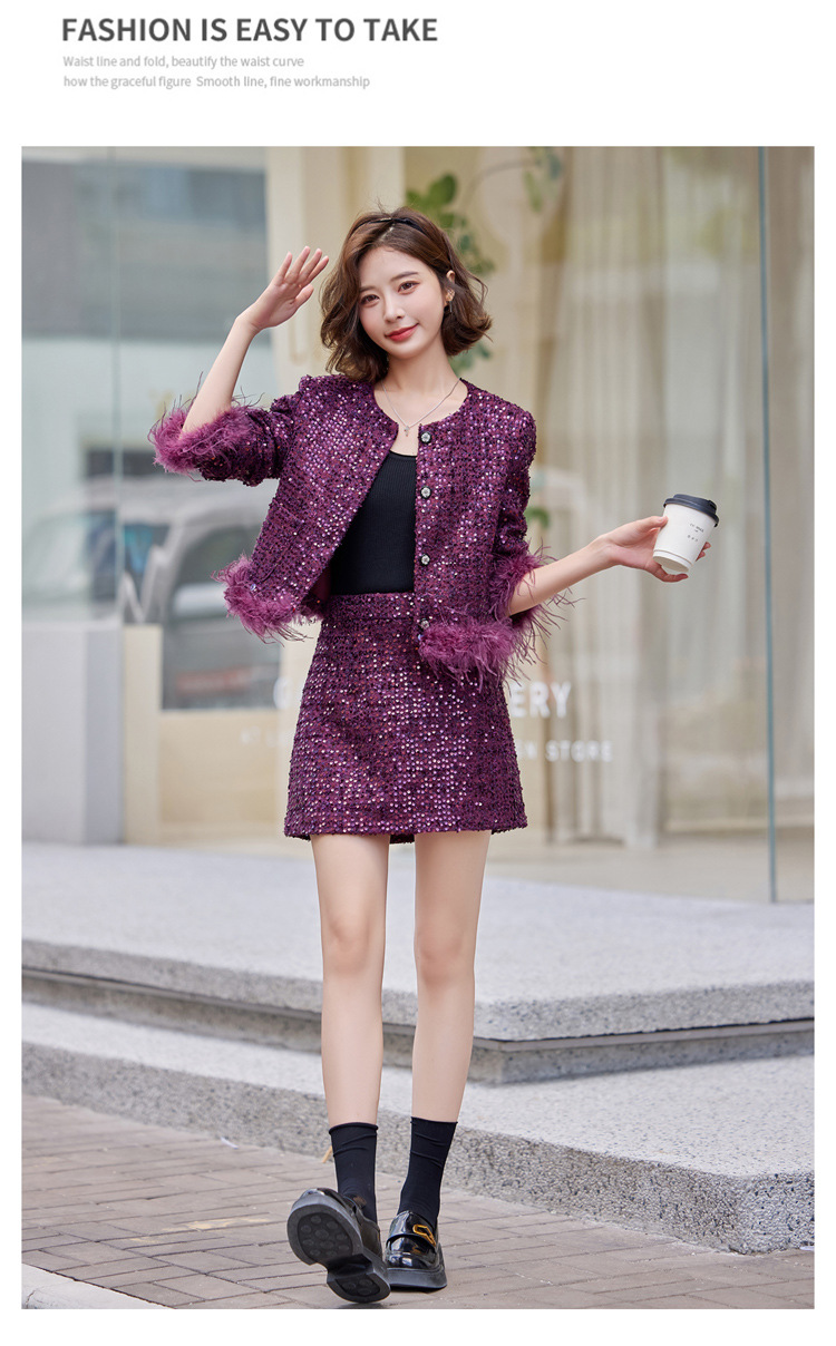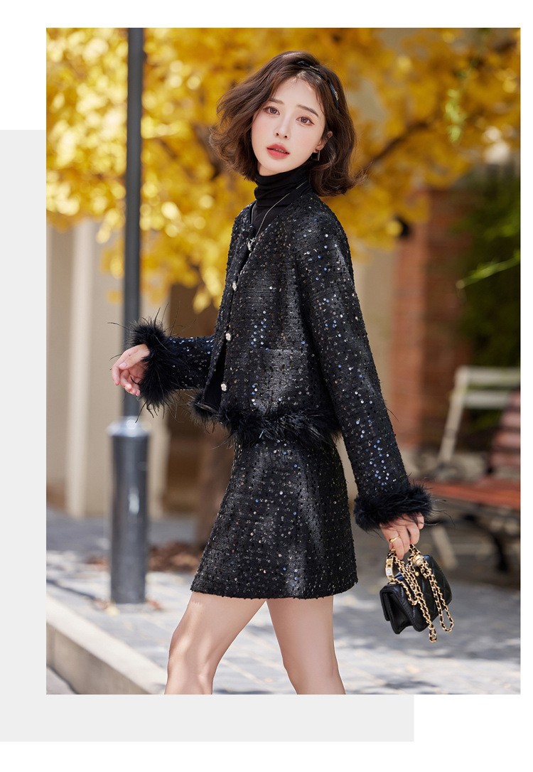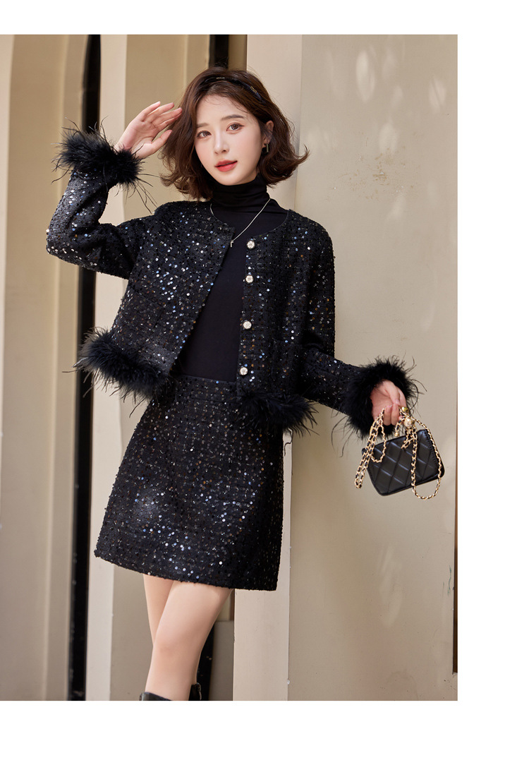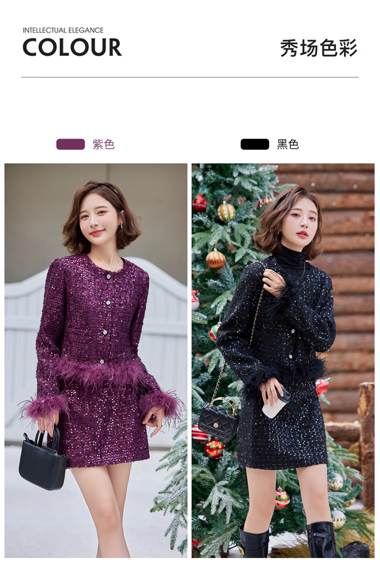 HR-YJLY1329财阀千金系列2025新款早春miu系重工亮片两件套鸵鸟毛套装