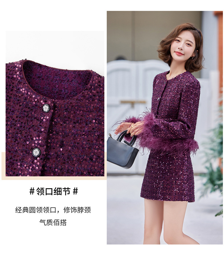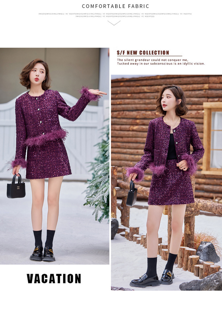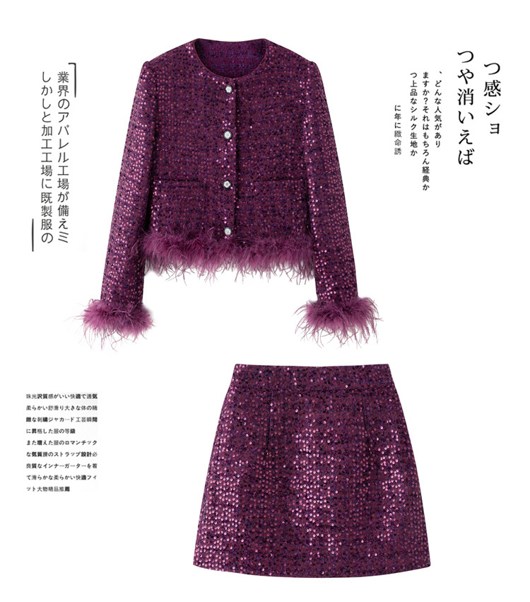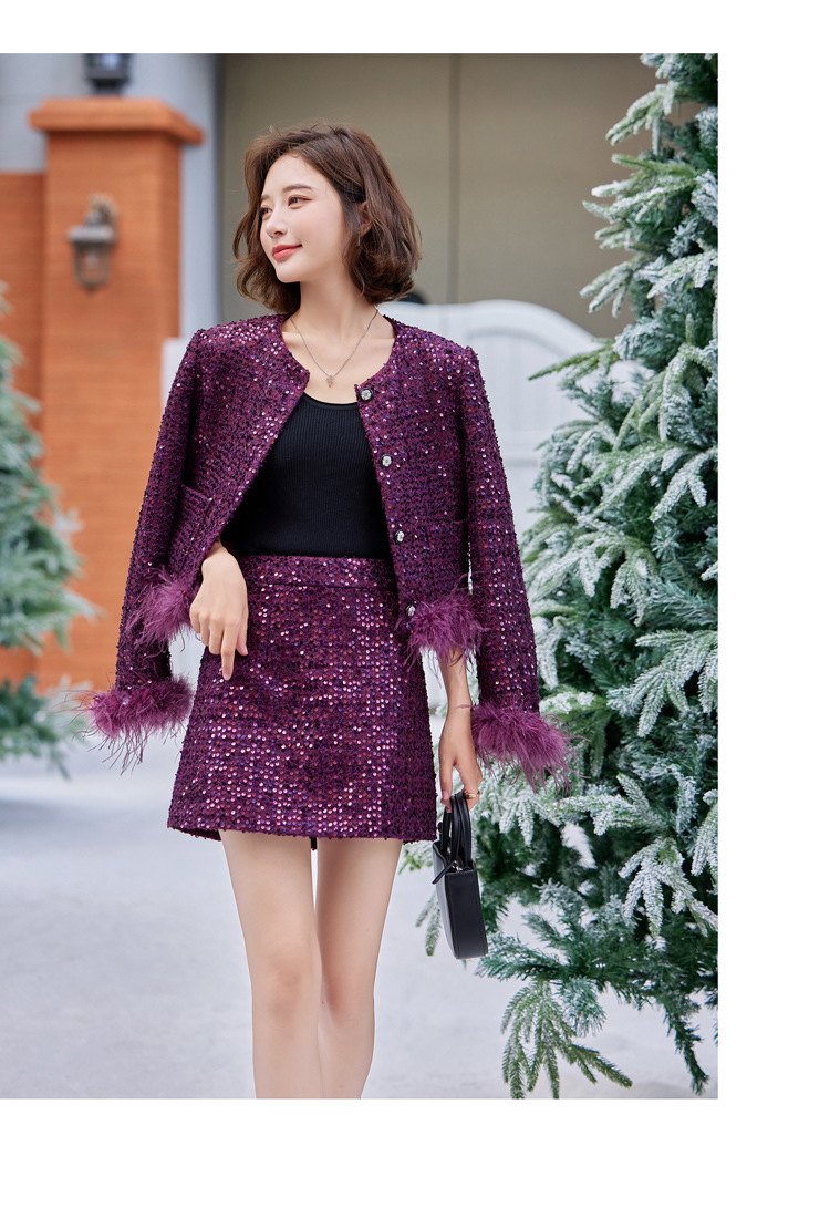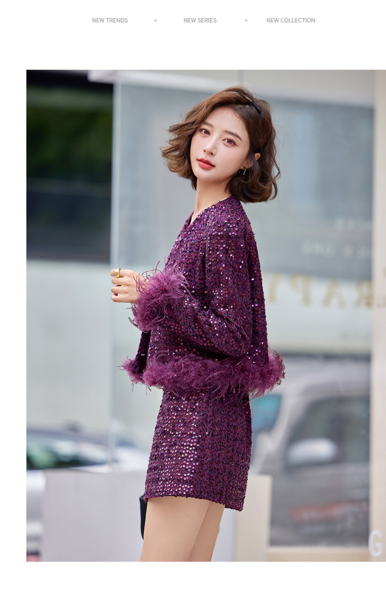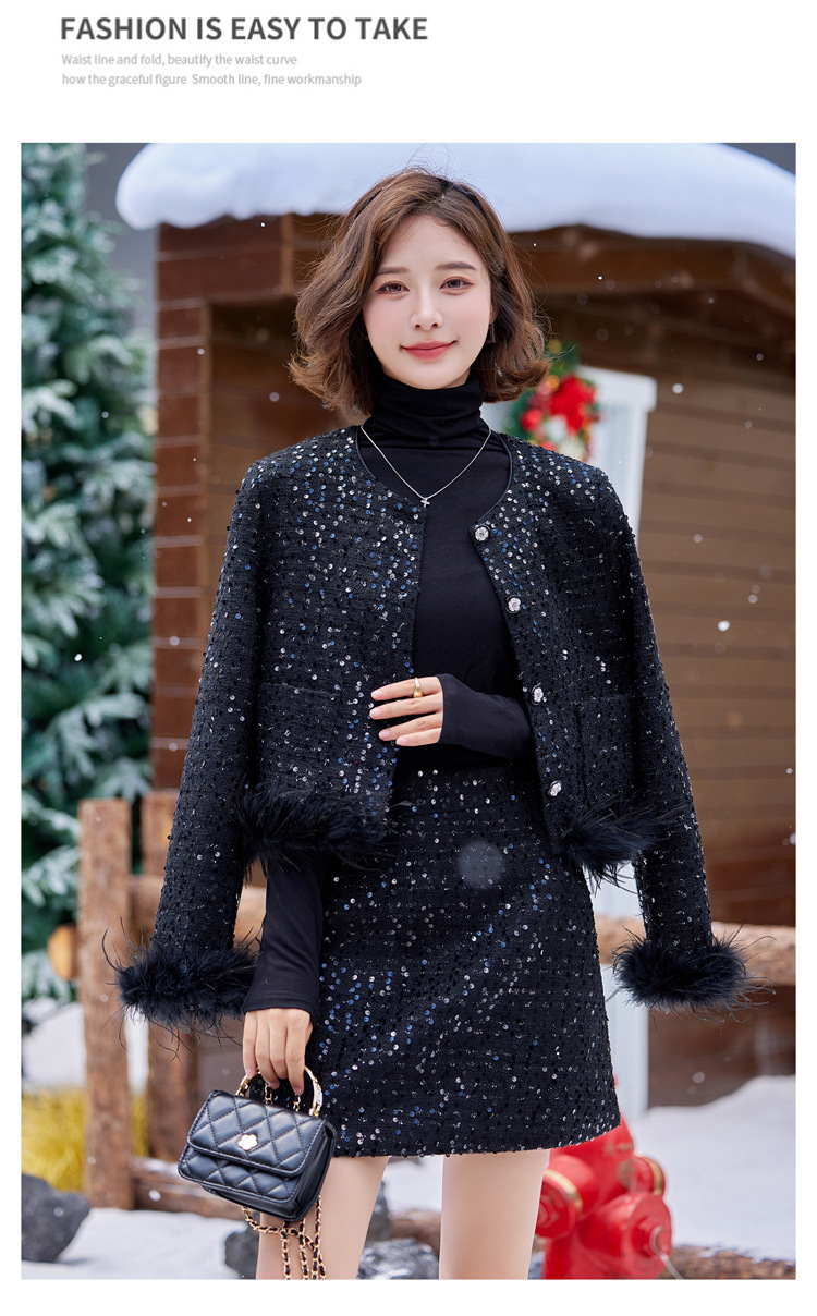 HR-YJLY1329财阀千金系列2025新款早春miu系重工亮片两件套鸵鸟毛套装